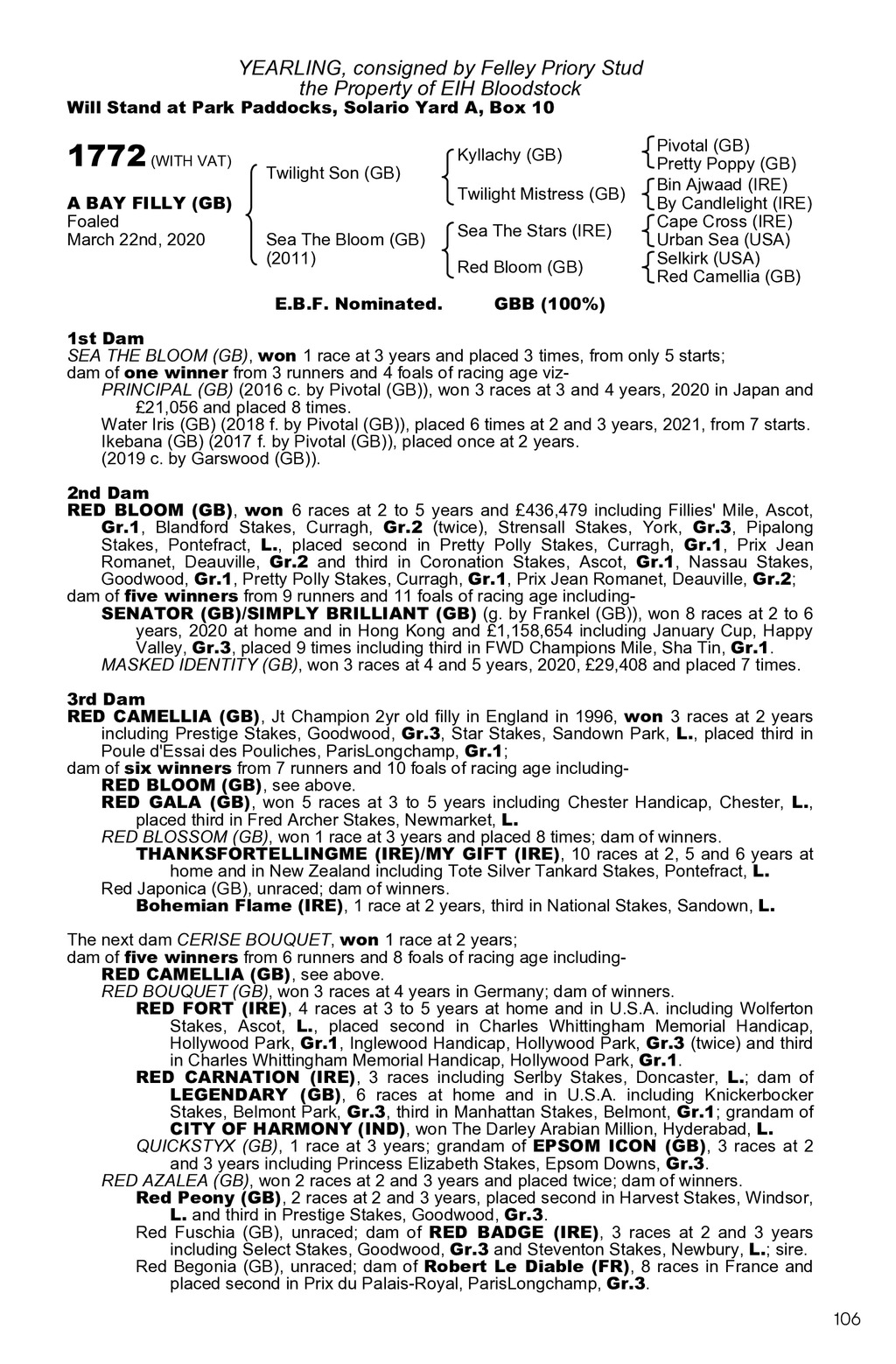 YEARLING, consigned by Felley Priory Stud the Property of EIH Bloodstock Will Stand at Park Paddocks, Solario Yard A, Box 10 1772 (WITH VAT) A BAY FILLY (GB) Foaled March 22nd, 2020 Twilight Son (GB) Sea The Bloom (GB) (2011) E.B.F. Nominated. Kyllachy (GB) Twilight Mistress (GB) Sea The Stars (IRE) Red Bloom (GB) Pivotal (GB) Pretty Poppy (GB) Bin Ajwaad (IRE) By Candlelight (IRE) Cape Cross (IRE) Urban Sea (USA) Selkirk (USA) Red Camellia (GB) GBB (100%) 1st Dam SEA THE BLOOM (GB), won 1 race at 3 years and placed 3 times, from only 5 starts; dam of one winner from 3 runners and 4 foals of racing age vizPRINCIPAL (GB) (2016 c. by Pivotal (GB)), won 3 races at 3 and 4 years, 2020 in Japan and 21,056 and placed 8 times. Water Iris (GB) (2018 f. by Pivotal (GB)), placed 6 times at 2 and 3 years, 2021, from 7 starts. Ikebana (GB) (2017 f. by Pivotal (GB)), placed once at 2 years. (2019 c. by Garswood (GB)). 2nd Dam RED BLOOM (GB), won 6 races at 2 to 5 years and 436,479 including Fillies Mile, Ascot, Gr.1, Blandford Stakes, Curragh, Gr.2 (twice), Strensall Stakes, York, Gr.3, Pipalong Stakes, Pontefract, L., placed second in Pretty Polly Stakes, Curragh, Gr.1, Prix Jean Romanet, Deauville, Gr.2 and third in Coronation Stakes, Ascot, Gr.1, Nassau Stakes, Goodwood, Gr.1, Pretty Polly Stakes, Curragh, Gr.1, Prix Jean Romanet, Deauville, Gr.2; dam of five winners from 9 runners and 11 foals of racing age includingSENATOR (GB)/SIMPLY BRILLIANT (GB) (g. by Frankel (GB)), won 8 races at 2 to 6 years, 2020 at home and in Hong Kong and 1,158,654 including January Cup, Happy Valley, Gr.3, placed 9 times including third in FWD Champions Mile, Sha Tin, Gr.1. MASKED IDENTITY (GB), won 3 races at 4 and 5 years, 2020, 29,408 and placed 7 times. 3rd Dam RED CAMELLIA (GB), Jt Champion 2yr old filly in England in 1996, won 3 races at 2 years including Prestige Stakes, Goodwood, Gr.3, Star Stakes, Sandown Park, L., placed third in Poule d Essai des Pouliches, ParisLongchamp, Gr.1; dam of six winners from 7 runners and 10 foals of racing age includingRED BLOOM (GB), see above. RED GALA (GB), won 5 races at 3 to 5 years including Chester Handicap, Chester, L., placed third in Fred Archer Stakes, Newmarket, L. RED BLOSSOM (GB), won 1 race at 3 years and placed 8 times; dam of winners. THANKSFORTELLINGME (IRE)/MY GIFT (IRE), 10 races at 2, 5 and 6 years at home and in New Zealand including Tote Silver Tankard Stakes, Pontefract, L. Red Japonica (GB), unraced; dam of winners. Bohemian Flame (IRE), 1 race at 2 years, third in National Stakes, Sandown, L. The next dam CERISE BOUQUET, won 1 race at 2 years; dam of five winners from 6 runners and 8 foals of racing age includingRED CAMELLIA (GB), see above. RED BOUQUET (GB), won 3 races at 4 years in Germany; dam of winners. RED FORT (IRE), 4 races at 3 to 5 years at home and in U.S.A. including Wolferton Stakes, Ascot, L., placed second in Charles Whittingham Memorial Handicap, Hollywood Park, Gr.1, Inglewood Handicap, Hollywood Park, Gr.3 (twice) and third in Charles Whittingham Memorial Handicap, Hollywood Park, Gr.1. RED CARNATION (IRE), 3 races including Serlby Stakes, Doncaster, L.; dam of LEGENDARY (GB), 6 races at home and in U.S.A. including Knickerbocker Stakes, Belmont Park, Gr.3, third in Manhattan Stakes, Belmont, Gr.1; grandam of CITY OF HARMONY (IND), won The Darley Arabian Million, Hyderabad, L. QUICKSTYX (GB), 1 race at 3 years; grandam of EPSOM ICON (GB), 3 races at 2 and 3 years including Princess Elizabeth Stakes, Epsom Downs, Gr.3. RED AZALEA (GB), won 2 races at 2 and 3 years and placed twice; dam of winners. Red Peony (GB), 2 races at 2 and 3 years, placed second in Harvest Stakes, Windsor, L. and third in Prestige Stakes, Goodwood, Gr.3. Red Fuschia (GB), unraced; dam of RED BADGE (IRE), 3 races at 2 and 3 years including Select Stakes, Goodwood, Gr.3 and Steventon Stakes, Newbury, L.; sire. Red Begonia (GB), unraced; dam of Robert Le Diable (FR), 8 races in France and placed second in Prix du Palais-Royal, ParisLongchamp, Gr.3. 106