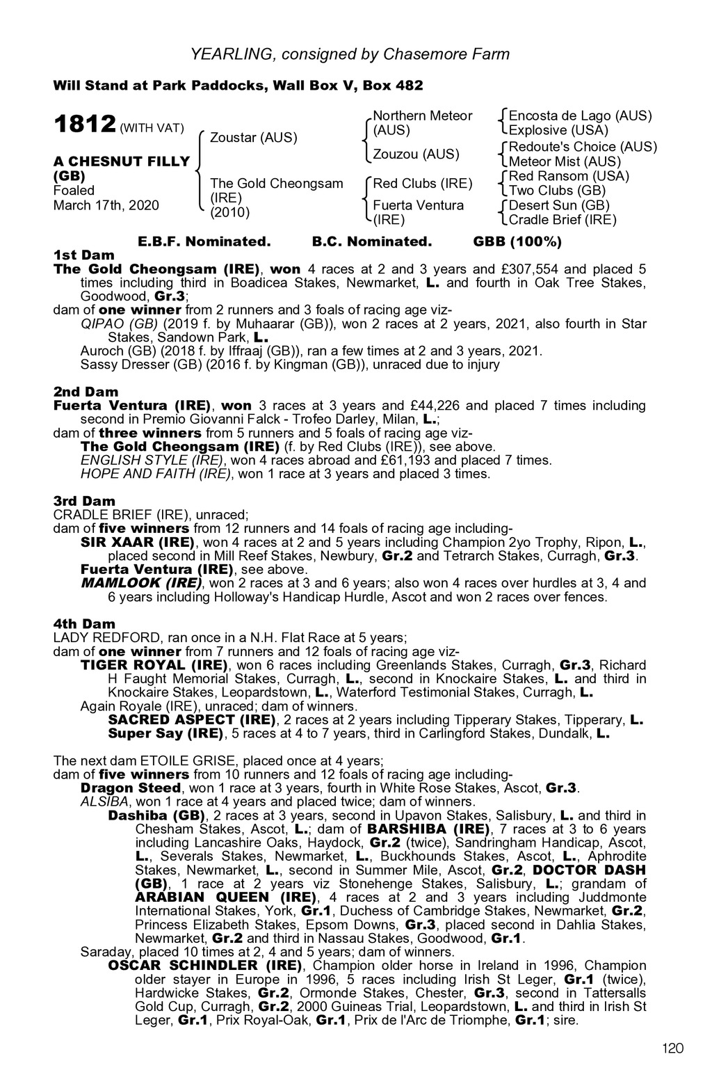 YEARLING, consigned by Chasemore Farm Will Stand at Park Paddocks, Wall Box V, Box 482 1812 (WITH VAT) A CHESNUT FILLY (GB) Foaled March 17th, 2020 Zoustar (AUS) The Gold Cheongsam (IRE) (2010) Northern Meteor (AUS) Zouzou (AUS) Red Clubs (IRE) Fuerta Ventura (IRE) Encosta de Lago (AUS) Explosive (USA) Redoute s Choice (AUS) Meteor Mist (AUS) Red Ransom (USA) Two Clubs (GB) Desert Sun (GB) Cradle Brief (IRE) E.B.F. Nominated. B.C. Nominated. GBB (100%) 1st Dam The Gold Cheongsam (IRE), won 4 races at 2 and 3 years and 307,554 and placed 5 times including third in Boadicea Stakes, Newmarket, L. and fourth in Oak Tree Stakes, Goodwood, Gr.3; dam of one winner from 2 runners and 3 foals of racing age vizQIPAO (GB) (2019 f. by Muhaarar (GB)), won 2 races at 2 years, 2021, also fourth in Star Stakes, Sandown Park, L . Auroch (GB) (2018 f. by Iffraaj (GB)), ran a few times at 2 and 3 years, 2021. Sassy Dresser (GB) (2016 f. by Kingman (GB)), unraced due to injury 2nd Dam Fuerta Ventura (IRE), won 3 races at 3 years and 44,226 and placed 7 times including second in Premio Giovanni Falck - Trofeo Darley, Milan, L.; dam of three winners from 5 runners and 5 foals of racing age vizThe Gold Cheongsam (IRE) (f. by Red Clubs (IRE)), see above. ENGLISH STYLE (IRE), won 4 races abroad and 61,193 and placed 7 times. HOPE AND FAITH (IRE), won 1 race at 3 years and placed 3 times. 3rd Dam CRADLE BRIEF (IRE), unraced; dam of five winners from 12 runners and 14 foals of racing age includingSIR XAAR (IRE), won 4 races at 2 and 5 years including Champion 2yo Trophy, Ripon, L., placed second in Mill Reef Stakes, Newbury, Gr.2 and Tetrarch Stakes, Curragh, Gr.3. Fuerta Ventura (IRE), see above. MAMLOOK (IRE), won 2 races at 3 and 6 years; also won 4 races over hurdles at 3, 4 and 6 years including Holloway s Handicap Hurdle, Ascot and won 2 races over fences. 4th Dam LADY REDFORD, ran once in a N.H. Flat Race at 5 years; dam of one winner from 7 runners and 12 foals of racing age vizTIGER ROYAL (IRE), won 6 races including Greenlands Stakes, Curragh, Gr.3, Richard H Faught Memorial Stakes, Curragh, L., second in Knockaire Stakes, L. and third in Knockaire Stakes, Leopardstown, L., Waterford Testimonial Stakes, Curragh, L. Again Royale (IRE), unraced; dam of winners. SACRED ASPECT (IRE), 2 races at 2 years including Tipperary Stakes, Tipperary, L. Super Say (IRE), 5 races at 4 to 7 years, third in Carlingford Stakes, Dundalk, L. The next dam ETOILE GRISE, placed once at 4 years; dam of five winners from 10 runners and 12 foals of racing age includingDragon Steed, won 1 race at 3 years, fourth in White Rose Stakes, Ascot, Gr.3. ALSIBA, won 1 race at 4 years and placed twice; dam of winners. Dashiba (GB), 2 races at 3 years, second in Upavon Stakes, Salisbury, L. and third in Chesham Stakes, Ascot, L.; dam of BARSHIBA (IRE), 7 races at 3 to 6 years including Lancashire Oaks, Haydock, Gr.2 (twice), Sandringham Handicap, Ascot, L., Severals Stakes, Newmarket, L., Buckhounds Stakes, Ascot, L., Aphrodite Stakes, Newmarket, L., second in Summer Mile, Ascot, Gr.2, DOCTOR DASH (GB), 1 race at 2 years viz Stonehenge Stakes, Salisbury, L.; grandam of ARABIAN QUEEN (IRE), 4 races at 2 and 3 years including Juddmonte International Stakes, York, Gr.1, Duchess of Cambridge Stakes, Newmarket, Gr.2, Princess Elizabeth Stakes, Epsom Downs, Gr.3, placed second in Dahlia Stakes, Newmarket, Gr.2 and third in Nassau Stakes, Goodwood, Gr.1. Saraday, placed 10 times at 2, 4 and 5 years; dam of winners. OSCAR SCHINDLER (IRE), Champion older horse in Ireland in 1996, Champion older stayer in Europe in 1996, 5 races including Irish St Leger, Gr.1 (twice), Hardwicke Stakes, Gr.2, Ormonde Stakes, Chester, Gr.3, second in Tattersalls Gold Cup, Curragh, Gr.2, 2000 Guineas Trial, Leopardstown, L. and third in Irish St Leger, Gr.1, Prix Royal-Oak, Gr.1, Prix de l Arc de Triomphe, Gr.1; sire. 120