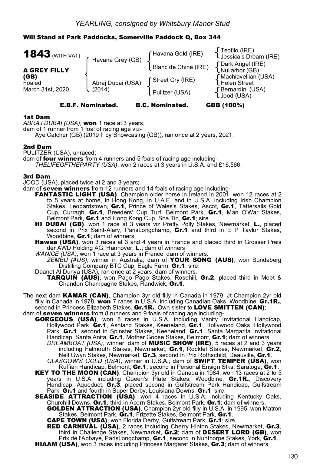 YEARLING, consigned by Whitsbury Manor Stud Will Stand at Park Paddocks, Somerville Paddock Q, Box 344 1843 (WITH VAT) A GREY FILLY (GB) Foaled March 31st, 2020 Havana Grey (GB) Abraj Dubai (USA) (2014) E.B.F. Nominated. Havana Gold (IRE) Blanc de Chine (IRE) Street Cry (IRE) Pulitzer (USA) B.C. Nominated. Teofilo (IRE) Jessica s Dream (IRE) Dark Angel (IRE) Nullarbor (GB) Machiavellian (USA) Helen Street Bernardini (USA) Jood (USA) GBB (100%) 1st Dam ABRAJ DUBAI (USA), won 1 race at 3 years; dam of 1 runner from 1 foal of racing age vizAye Catcher (GB) (2019 f. by Showcasing (GB)), ran once at 2 years, 2021. 2nd Dam PULITZER (USA), unraced; dam of four winners from 4 runners and 5 foals of racing age includingTHELIFEOFTHEPARTY (USA), won 2 races at 3 years in U.S.A. and 16,566. 3rd Dam JOOD (USA), placed twice at 2 and 3 years; dam of seven winners from 12 runners and 14 foals of racing age includingFANTASTIC LIGHT (USA), Champion older horse in Ireland in 2001, won 12 races at 2 to 5 years at home, in Hong Kong, in U.A.E. and in U.S.A. including Irish Champion Stakes, Leopardstown, Gr.1, Prince of Wales s Stakes, Ascot, Gr.1, Tattersalls Gold Cup, Curragh, Gr.1, Breeders Cup Turf, Belmont Park, Gr.1, Man O War Stakes, Belmont Park, Gr.1 and Hong Kong Cup, Sha Tin, Gr.1; sire. HI DUBAI (GB), won 1 race at 3 years viz Pretty Polly Stakes, Newmarket, L., placed second in Prix Saint-Alary, ParisLongchamp, Gr.1 and third in E P Taylor Stakes, Woodbine, Gr.1; dam of winners. Hawsa (USA), won 3 races at 3 and 4 years in France and placed third in Grosser Preis der AWD Holding AG, Hannover, L.; dam of winners. WANICE (USA), won 1 race at 3 years in France; dam of winners. ZEMBU (AUS), winner in Australia; dam of YOUR SONG (AUS), won Bundaberg Distilling Company BTC Cup, Eagle Farm, Gr.1; sire. Daanet Al Dunya (USA), ran once at 2 years; dam of winners. TARQUIN (AUS), won Pago Pago Stakes, Rosehill, Gr.2, placed third in Moet & Chandon Champagne Stakes, Randwick, Gr.1. The next dam KAMAR (CAN), Champion 3yr old filly in Canada in 1979, Jt Champion 2yr old filly in Canada in 1978, won 7 races in U.S.A. including Canadian Oaks, Woodbine, Gr.1R., second in Princess Elizabeth Stakes, Gr.1R.; Own sister to LOVE SMITTEN (CAN); dam of seven winners from 8 runners and 9 foals of racing age includingGORGEOUS (USA), won 8 races in U.S.A. including Vanity Invitational Handicap, Hollywood Park, Gr.1, Ashland Stakes, Keeneland, Gr.1, Hollywood Oaks, Hollywood Park, Gr.1, second in Spinster Stakes, Keeneland, Gr.1, Santa Margarita Invitational Handicap, Santa Anita, Gr.1, Mother Goose Stakes, Belmont, Gr.1; dam of winners. DREAMBOAT (USA), winner; dam of MUSIC SHOW (IRE), 5 races at 2 and 3 years including Falmouth Stakes, Newmarket, Gr.1, Rockfel Stakes, Newmarket, Gr.2, Nell Gwyn Stakes, Newmarket, Gr.3, second in Prix Rothschild, Deauville, Gr.1. GLASGOW S GOLD (USA), winner in U.S.A.; dam of SWIFT TEMPER (USA), won Ruffian Handicap, Belmont, Gr.1, second in Personal Ensign Stks, Saratoga, Gr.1. KEY TO THE MOON (CAN), Champion 3yr old in Canada in 1984, won 13 races at 2 to 5 years in U.S.A. including Queen s Plate Stakes, Woodbine, Gr.1R., Discovery Handicap, Aqueduct, Gr.3, placed second in Gulfstream Park Handicap, Gulfstream Park, Gr.1 and fourth in Super Derby, Louisiana Downs, Gr.1; sire. SEASIDE ATTRACTION (USA), won 4 races in U.S.A. including Kentucky Oaks, Churchill Downs, Gr.1, third in Acorn Stakes, Belmont Park, Gr.1; dam of winners. GOLDEN ATTRACTION (USA), Champion 2yr old filly in U.S.A. in 1995, won Matron Stakes, Belmont Park, Gr.1, Frizette Stakes, Belmont Park, Gr.1. CAPE TOWN (USA), won Florida Derby, Gulfstream Park, Gr.1; sire. RED CARNIVAL (USA), 2 races including Cherry Hinton Stakes, Newmarket, Gr.3, third in Challenge Stakes, Newmarket, Gr.2; dam of DESERT LORD (GB), won Prix de l Abbaye, ParisLongchamp, Gr.1, second in Nunthorpe Stakes, York, Gr.1. HIAAM (USA), won 3 races including Princess Margaret Stakes, Gr.3; dam of winners. 130