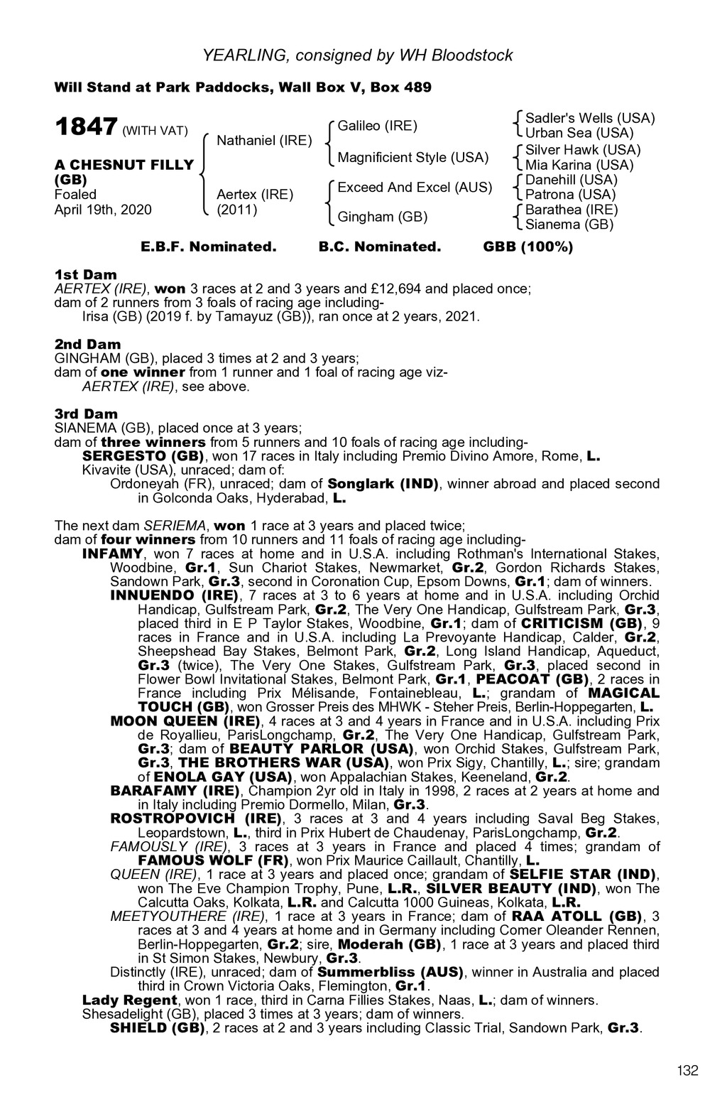 YEARLING, consigned by WH Bloodstock Will Stand at Park Paddocks, Wall Box V, Box 489 1847 (WITH VAT) A CHESNUT FILLY (GB) Foaled April 19th, 2020 Nathaniel (IRE) Aertex (IRE) (2011) E.B.F. Nominated. Galileo (IRE) Magnificient Style (USA) Exceed And Excel (AUS) Gingham (GB) B.C. Nominated. Sadler s Wells (USA) Urban Sea (USA) Silver Hawk (USA) Mia Karina (USA) Danehill (USA) Patrona (USA) Barathea (IRE) Sianema (GB) GBB (100%) 1st Dam AERTEX (IRE), won 3 races at 2 and 3 years and 12,694 and placed once; dam of 2 runners from 3 foals of racing age includingIrisa (GB) (2019 f. by Tamayuz (GB)), ran once at 2 years, 2021. 2nd Dam GINGHAM (GB), placed 3 times at 2 and 3 years; dam of one winner from 1 runner and 1 foal of racing age vizAERTEX (IRE), see above. 3rd Dam SIANEMA (GB), placed once at 3 years; dam of three winners from 5 runners and 10 foals of racing age includingSERGESTO (GB), won 17 races in Italy including Premio Divino Amore, Rome, L. Kivavite (USA), unraced; dam of: Ordoneyah (FR), unraced; dam of Songlark (IND), winner abroad and placed second in Golconda Oaks, Hyderabad, L. The next dam SERIEMA, won 1 race at 3 years and placed twice; dam of four winners from 10 runners and 11 foals of racing age includingINFAMY, won 7 races at home and in U.S.A. including Rothman s International Stakes, Woodbine, Gr.1, Sun Chariot Stakes, Newmarket, Gr.2, Gordon Richards Stakes, Sandown Park, Gr.3, second in Coronation Cup, Epsom Downs, Gr.1; dam of winners. INNUENDO (IRE), 7 races at 3 to 6 years at home and in U.S.A. including Orchid Handicap, Gulfstream Park, Gr.2, The Very One Handicap, Gulfstream Park, Gr.3, placed third in E P Taylor Stakes, Woodbine, Gr.1; dam of CRITICISM (GB), 9 races in France and in U.S.A. including La Prevoyante Handicap, Calder, Gr.2, Sheepshead Bay Stakes, Belmont Park, Gr.2, Long Island Handicap, Aqueduct, Gr.3 (twice), The Very One Stakes, Gulfstream Park, Gr.3, placed second in Flower Bowl Invitational Stakes, Belmont Park, Gr.1, PEACOAT (GB), 2 races in France including Prix Mlisande, Fontainebleau, L.; grandam of MAGICAL TOUCH (GB), won Grosser Preis des MHWK - Steher Preis, Berlin-Hoppegarten, L. MOON QUEEN (IRE), 4 races at 3 and 4 years in France and in U.S.A. including Prix de Royallieu, ParisLongchamp, Gr.2, The Very One Handicap, Gulfstream Park, Gr.3; dam of BEAUTY PARLOR (USA), won Orchid Stakes, Gulfstream Park, Gr.3, THE BROTHERS WAR (USA), won Prix Sigy, Chantilly, L.; sire; grandam of ENOLA GAY (USA), won Appalachian Stakes, Keeneland, Gr.2. BARAFAMY (IRE), Champion 2yr old in Italy in 1998, 2 races at 2 years at home and in Italy including Premio Dormello, Milan, Gr.3. ROSTROPOVICH (IRE), 3 races at 3 and 4 years including Saval Beg Stakes, Leopardstown, L., third in Prix Hubert de Chaudenay, ParisLongchamp, Gr.2. FAMOUSLY (IRE), 3 races at 3 years in France and placed 4 times; grandam of FAMOUS WOLF (FR), won Prix Maurice Caillault, Chantilly, L. QUEEN (IRE), 1 race at 3 years and placed once; grandam of SELFIE STAR (IND), won The Eve Champion Trophy, Pune, L.R., SILVER BEAUTY (IND), won The Calcutta Oaks, Kolkata, L.R. and Calcutta 1000 Guineas, Kolkata, L.R. MEETYOUTHERE (IRE), 1 race at 3 years in France; dam of RAA ATOLL (GB), 3 races at 3 and 4 years at home and in Germany including Comer Oleander Rennen, Berlin-Hoppegarten, Gr.2; sire, Moderah (GB), 1 race at 3 years and placed third in St Simon Stakes, Newbury, Gr.3. Distinctly (IRE), unraced; dam of Summerbliss (AUS), winner in Australia and placed third in Crown Victoria Oaks, Flemington, Gr.1. Lady Regent, won 1 race, third in Carna Fillies Stakes, Naas, L.; dam of winners. Shesadelight (GB), placed 3 times at 3 years; dam of winners. SHIELD (GB), 2 races at 2 and 3 years including Classic Trial, Sandown Park, Gr.3. 132