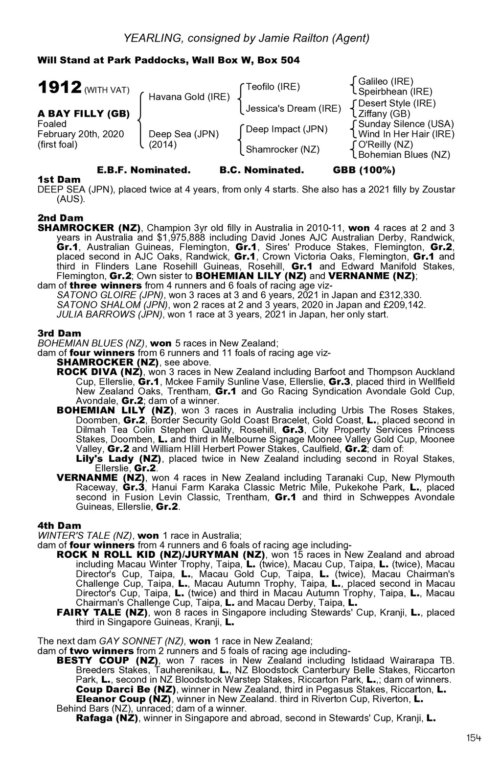 YEARLING, consigned by Jamie Railton (Agent) Will Stand at Park Paddocks, Wall Box W, Box 504 1912 (WITH VAT) A BAY FILLY (GB) Foaled February 20th, 2020 (first foal) Havana Gold (IRE) Deep Sea (JPN) (2014) Teofilo (IRE) Jessica s Dream (IRE) Deep Impact (JPN) Shamrocker (NZ) Galileo (IRE) Speirbhean (IRE) Desert Style (IRE) Ziffany (GB) Sunday Silence (USA) Wind In Her Hair (IRE) O Reilly (NZ) Bohemian Blues (NZ) E.B.F. Nominated. B.C. Nominated. GBB (100%) 1st Dam DEEP SEA (JPN), placed twice at 4 years, from only 4 starts. She also has a 2021 filly by Zoustar (AUS). 2nd Dam SHAMROCKER (NZ), Champion 3yr old filly in Australia in 2010-11, won 4 races at 2 and 3 years in Australia and $1,975,888 including David Jones AJC Australian Derby, Randwick, Gr.1, Australian Guineas, Flemington, Gr.1, Sires Produce Stakes, Flemington, Gr.2, placed second in AJC Oaks, Randwick, Gr.1, Crown Victoria Oaks, Flemington, Gr.1 and third in Flinders Lane Rosehill Guineas, Rosehill, Gr.1 and Edward Manifold Stakes, Flemington, Gr.2; Own sister to BOHEMIAN LILY (NZ) and VERNANME (NZ); dam of three winners from 4 runners and 6 foals of racing age vizSATONO GLOIRE (JPN), won 3 races at 3 and 6 years, 2021 in Japan and 312,330. SATONO SHALOM (JPN), won 2 races at 2 and 3 years, 2020 in Japan and 209,142. JULIA BARROWS (JPN), won 1 race at 3 years, 2021 in Japan, her only start. 3rd Dam BOHEMIAN BLUES (NZ), won 5 races in New Zealand; dam of four winners from 6 runners and 11 foals of racing age vizSHAMROCKER (NZ), see above. ROCK DIVA (NZ), won 3 races in New Zealand including Barfoot and Thompson Auckland Cup, Ellerslie, Gr.1, Mckee Family Sunline Vase, Ellerslie, Gr.3, placed third in Wellfield New Zealand Oaks, Trentham, Gr.1 and Go Racing Syndication Avondale Gold Cup, Avondale, Gr.2; dam of a winner. BOHEMIAN LILY (NZ), won 3 races in Australia including Urbis The Roses Stakes, Doomben, Gr.2, Border Security Gold Coast Bracelet, Gold Coast, L., placed second in Dilmah Tea Colin Stephen Quality, Rosehill, Gr.3, City Property Services Princess Stakes, Doomben, L. and third in Melbourne Signage Moonee Valley Gold Cup, Moonee Valley, Gr.2 and William HIill Herbert Power Stakes, Caulfield, Gr.2; dam of: Lily s Lady (NZ), placed twice in New Zealand including second in Royal Stakes, Ellerslie, Gr.2. VERNANME (NZ), won 4 races in New Zealand including Taranaki Cup, New Plymouth Raceway, Gr.3, Hanui Farm Karaka Classic Metric Mile, Pukekohe Park, L., placed second in Fusion Levin Classic, Trentham, Gr.1 and third in Schweppes Avondale Guineas, Ellerslie, Gr.2. 4th Dam WINTER S TALE (NZ), won 1 race in Australia; dam of four winners from 4 runners and 6 foals of racing age includingROCK N ROLL KID (NZ)/JURYMAN (NZ), won 15 races in New Zealand and abroad including Macau Winter Trophy, Taipa, L. (twice), Macau Cup, Taipa, L. (twice), Macau Director s Cup, Taipa, L., Macau Gold Cup, Taipa, L. (twice), Macau Chairman s Challenge Cup, Taipa, L., Macau Autumn Trophy, Taipa, L., placed second in Macau Director s Cup, Taipa, L. (twice) and third in Macau Autumn Trophy, Taipa, L., Macau Chairman s Challenge Cup, Taipa, L. and Macau Derby, Taipa, L. FAIRY TALE (NZ), won 8 races in Singapore including Stewards Cup, Kranji, L., placed third in Singapore Guineas, Kranji, L. The next dam GAY SONNET (NZ), won 1 race in New Zealand; dam of two winners from 2 runners and 5 foals of racing age includingBESTY COUP (NZ), won 7 races in New Zealand including Istidaad Wairarapa TB. Breeders Stakes, Tauherenikau, L., NZ Bloodstock Canterbury Belle Stakes, Riccarton Park, L., second in NZ Bloodstock Warstep Stakes, Riccarton Park, L.,; dam of winners. Coup Darci Be (NZ), winner in New Zealand, third in Pegasus Stakes, Riccarton, L. Eleanor Coup (NZ), winner in New Zealand. third in Riverton Cup, Riverton, L. Behind Bars (NZ), unraced; dam of a winner. Rafaga (NZ), winner in Singapore and abroad, second in Stewards Cup, Kranji, L. 154