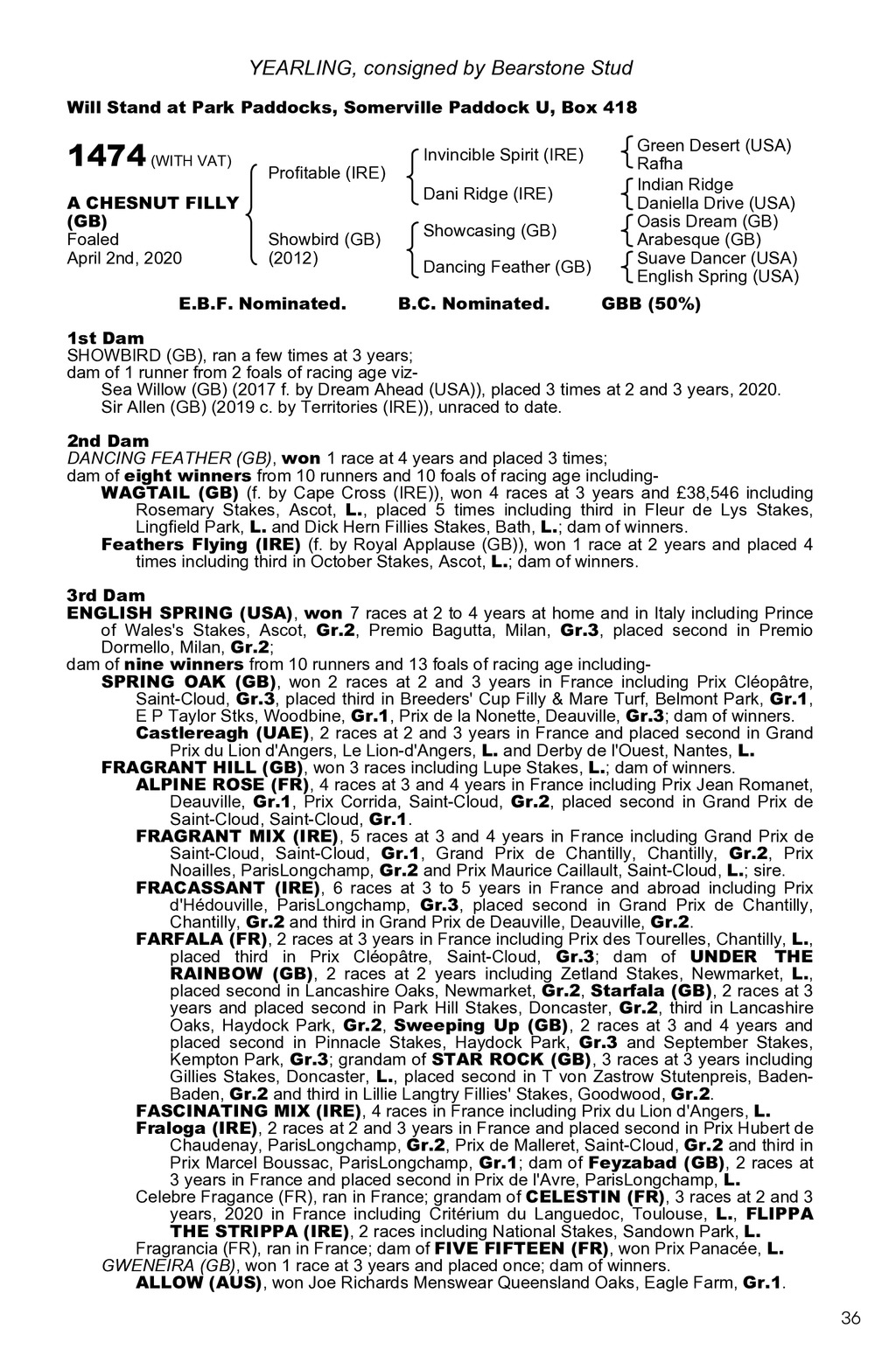 YEARLING, consigned by Bearstone Stud Will Stand at Park Paddocks, Somerville Paddock U, Box 418 1474 (WITH VAT) A CHESNUT FILLY (GB) Foaled April 2nd, 2020 Profitable (IRE) Showbird (GB) (2012) E.B.F. Nominated. Invincible Spirit (IRE) Dani Ridge (IRE) Showcasing (GB) Dancing Feather (GB) B.C. Nominated. Green Desert (USA) Rafha Indian Ridge Daniella Drive (USA) Oasis Dream (GB) Arabesque (GB) Suave Dancer (USA) English Spring (USA) GBB (50%) 1st Dam SHOWBIRD (GB), ran a few times at 3 years; dam of 1 runner from 2 foals of racing age vizSea Willow (GB) (2017 f. by Dream Ahead (USA)), placed 3 times at 2 and 3 years, 2020. Sir Allen (GB) (2019 c. by Territories (IRE)), unraced to date. 2nd Dam DANCING FEATHER (GB), won 1 race at 4 years and placed 3 times; dam of eight winners from 10 runners and 10 foals of racing age includingWAGTAIL (GB) (f. by Cape Cross (IRE)), won 4 races at 3 years and 38,546 including Rosemary Stakes, Ascot, L., placed 5 times including third in Fleur de Lys Stakes, Lingfield Park, L. and Dick Hern Fillies Stakes, Bath, L.; dam of winners. Feathers Flying (IRE) (f. by Royal Applause (GB)), won 1 race at 2 years and placed 4 times including third in October Stakes, Ascot, L.; dam of winners. 3rd Dam ENGLISH SPRING (USA), won 7 races at 2 to 4 years at home and in Italy including Prince of Wales s Stakes, Ascot, Gr.2, Premio Bagutta, Milan, Gr.3, placed second in Premio Dormello, Milan, Gr.2; dam of nine winners from 10 runners and 13 foals of racing age includingSPRING OAK (GB), won 2 races at 2 and 3 years in France including Prix Cloptre, Saint-Cloud, Gr.3, placed third in Breeders Cup Filly & Mare Turf, Belmont Park, Gr.1, E P Taylor Stks, Woodbine, Gr.1, Prix de la Nonette, Deauville, Gr.3; dam of winners. Castlereagh (UAE), 2 races at 2 and 3 years in France and placed second in Grand Prix du Lion d Angers, Le Lion-d Angers, L. and Derby de l Ouest, Nantes, L. FRAGRANT HILL (GB), won 3 races including Lupe Stakes, L.; dam of winners. ALPINE ROSE (FR), 4 races at 3 and 4 years in France including Prix Jean Romanet, Deauville, Gr.1, Prix Corrida, Saint-Cloud, Gr.2, placed second in Grand Prix de Saint-Cloud, Saint-Cloud, Gr.1. FRAGRANT MIX (IRE), 5 races at 3 and 4 years in France including Grand Prix de Saint-Cloud, Saint-Cloud, Gr.1, Grand Prix de Chantilly, Chantilly, Gr.2, Prix Noailles, ParisLongchamp, Gr.2 and Prix Maurice Caillault, Saint-Cloud, L.; sire. FRACASSANT (IRE), 6 races at 3 to 5 years in France and abroad including Prix d Hdouville, ParisLongchamp, Gr.3, placed second in Grand Prix de Chantilly, Chantilly, Gr.2 and third in Grand Prix de Deauville, Deauville, Gr.2. FARFALA (FR), 2 races at 3 years in France including Prix des Tourelles, Chantilly, L., placed third in Prix Cloptre, Saint-Cloud, Gr.3; dam of UNDER THE RAINBOW (GB), 2 races at 2 years including Zetland Stakes, Newmarket, L., placed second in Lancashire Oaks, Newmarket, Gr.2, Starfala (GB), 2 races at 3 years and placed second in Park Hill Stakes, Doncaster, Gr.2, third in Lancashire Oaks, Haydock Park, Gr.2, Sweeping Up (GB), 2 races at 3 and 4 years and placed second in Pinnacle Stakes, Haydock Park, Gr.3 and September Stakes, Kempton Park, Gr.3; grandam of STAR ROCK (GB), 3 races at 3 years including Gillies Stakes, Doncaster, L., placed second in T von Zastrow Stutenpreis, BadenBaden, Gr.2 and third in Lillie Langtry Fillies Stakes, Goodwood, Gr.2. FASCINATING MIX (IRE), 4 races in France including Prix du Lion d Angers, L. Fraloga (IRE), 2 races at 2 and 3 years in France and placed second in Prix Hubert de Chaudenay, ParisLongchamp, Gr.2, Prix de Malleret, Saint-Cloud, Gr.2 and third in Prix Marcel Boussac, ParisLongchamp, Gr.1; dam of Feyzabad (GB), 2 races at 3 years in France and placed second in Prix de l Avre, ParisLongchamp, L. Celebre Fragance (FR), ran in France; grandam of CELESTIN (FR), 3 races at 2 and 3 years, 2020 in France including Critrium du Languedoc, Toulouse, L., FLIPPA THE STRIPPA (IRE), 2 races including National Stakes, Sandown Park, L. Fragrancia (FR), ran in France; dam of FIVE FIFTEEN (FR), won Prix Panace, L. GWENEIRA (GB), won 1 race at 3 years and placed once; dam of winners. ALLOW (AUS), won Joe Richards Menswear Queensland Oaks, Eagle Farm, Gr.1. 36