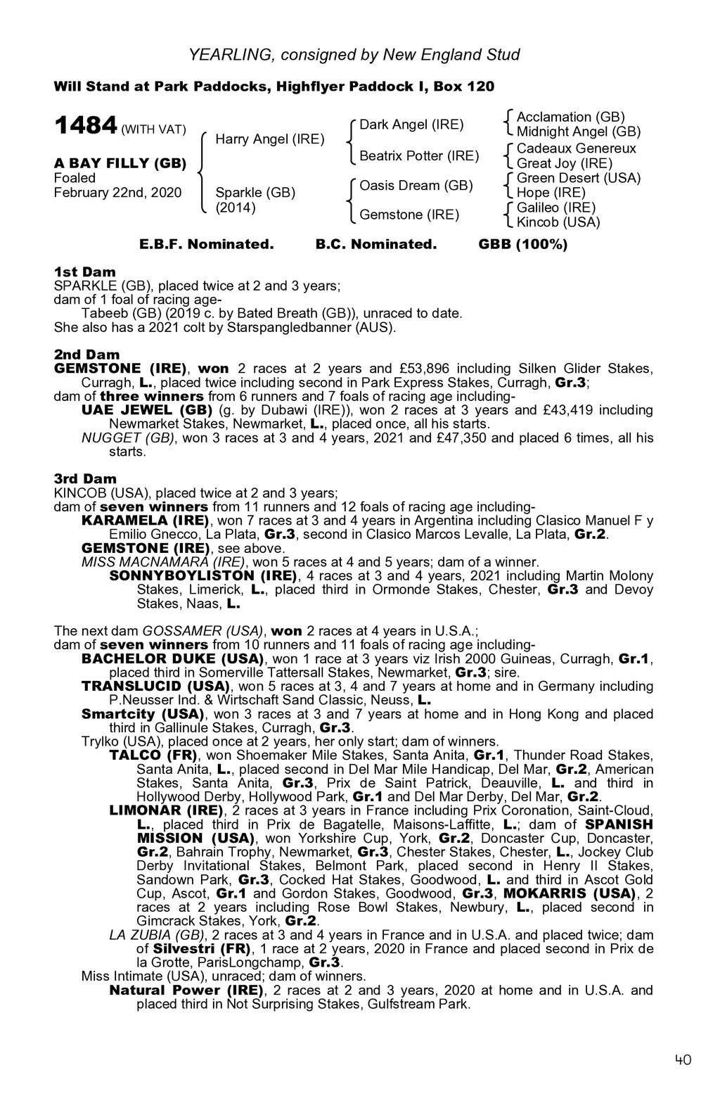 YEARLING, consigned by New England Stud Will Stand at Park Paddocks, Highflyer Paddock I, Box 120 1484 (WITH VAT) A BAY FILLY (GB) Foaled February 22nd, 2020 Harry Angel (IRE) Sparkle (GB) (2014) E.B.F. Nominated. Dark Angel (IRE) Beatrix Potter (IRE) Oasis Dream (GB) Gemstone (IRE) B.C. Nominated. Acclamation (GB) Midnight Angel (GB) Cadeaux Genereux Great Joy (IRE) Green Desert (USA) Hope (IRE) Galileo (IRE) Kincob (USA) GBB (100%) 1st Dam SPARKLE (GB), placed twice at 2 and 3 years; dam of 1 foal of racing ageTabeeb (GB) (2019 c. by Bated Breath (GB)), unraced to date. She also has a 2021 colt by Starspangledbanner (AUS). 2nd Dam GEMSTONE (IRE), won 2 races at 2 years and 53,896 including Silken Glider Stakes, Curragh, L., placed twice including second in Park Express Stakes, Curragh, Gr.3; dam of three winners from 6 runners and 7 foals of racing age includingUAE JEWEL (GB) (g. by Dubawi (IRE)), won 2 races at 3 years and 43,419 including Newmarket Stakes, Newmarket, L., placed once, all his starts. NUGGET (GB), won 3 races at 3 and 4 years, 2021 and 47,350 and placed 6 times, all his starts. 3rd Dam KINCOB (USA), placed twice at 2 and 3 years; dam of seven winners from 11 runners and 12 foals of racing age includingKARAMELA (IRE), won 7 races at 3 and 4 years in Argentina including Clasico Manuel F y Emilio Gnecco, La Plata, Gr.3, second in Clasico Marcos Levalle, La Plata, Gr.2. GEMSTONE (IRE), see above. MISS MACNAMARA (IRE), won 5 races at 4 and 5 years; dam of a winner. SONNYBOYLISTON (IRE), 4 races at 3 and 4 years, 2021 including Martin Molony Stakes, Limerick, L., placed third in Ormonde Stakes, Chester, Gr.3 and Devoy Stakes, Naas, L. The next dam GOSSAMER (USA), won 2 races at 4 years in U.S.A.; dam of seven winners from 10 runners and 11 foals of racing age includingBACHELOR DUKE (USA), won 1 race at 3 years viz Irish 2000 Guineas, Curragh, Gr.1, placed third in Somerville Tattersall Stakes, Newmarket, Gr.3; sire. TRANSLUCID (USA), won 5 races at 3, 4 and 7 years at home and in Germany including P.Neusser Ind. & Wirtschaft Sand Classic, Neuss, L. Smartcity (USA), won 3 races at 3 and 7 years at home and in Hong Kong and placed third in Gallinule Stakes, Curragh, Gr.3. Trylko (USA), placed once at 2 years, her only start; dam of winners. TALCO (FR), won Shoemaker Mile Stakes, Santa Anita, Gr.1, Thunder Road Stakes, Santa Anita, L., placed second in Del Mar Mile Handicap, Del Mar, Gr.2, American Stakes, Santa Anita, Gr.3, Prix de Saint Patrick, Deauville, L. and third in Hollywood Derby, Hollywood Park, Gr.1 and Del Mar Derby, Del Mar, Gr.2. LIMONAR (IRE), 2 races at 3 years in France including Prix Coronation, Saint-Cloud, L., placed third in Prix de Bagatelle, Maisons-Laffitte, L.; dam of SPANISH MISSION (USA), won Yorkshire Cup, York, Gr.2, Doncaster Cup, Doncaster, Gr.2, Bahrain Trophy, Newmarket, Gr.3, Chester Stakes, Chester, L., Jockey Club Derby Invitational Stakes, Belmont Park, placed second in Henry II Stakes, Sandown Park, Gr.3, Cocked Hat Stakes, Goodwood, L. and third in Ascot Gold Cup, Ascot, Gr.1 and Gordon Stakes, Goodwood, Gr.3, MOKARRIS (USA), 2 races at 2 years including Rose Bowl Stakes, Newbury, L., placed second in Gimcrack Stakes, York, Gr.2. LA ZUBIA (GB), 2 races at 3 and 4 years in France and in U.S.A. and placed twice; dam of Silvestri (FR), 1 race at 2 years, 2020 in France and placed second in Prix de la Grotte, ParisLongchamp, Gr.3. Miss Intimate (USA), unraced; dam of winners. Natural Power (IRE), 2 races at 2 and 3 years, 2020 at home and in U.S.A. and placed third in Not Surprising Stakes, Gulfstream Park. 40