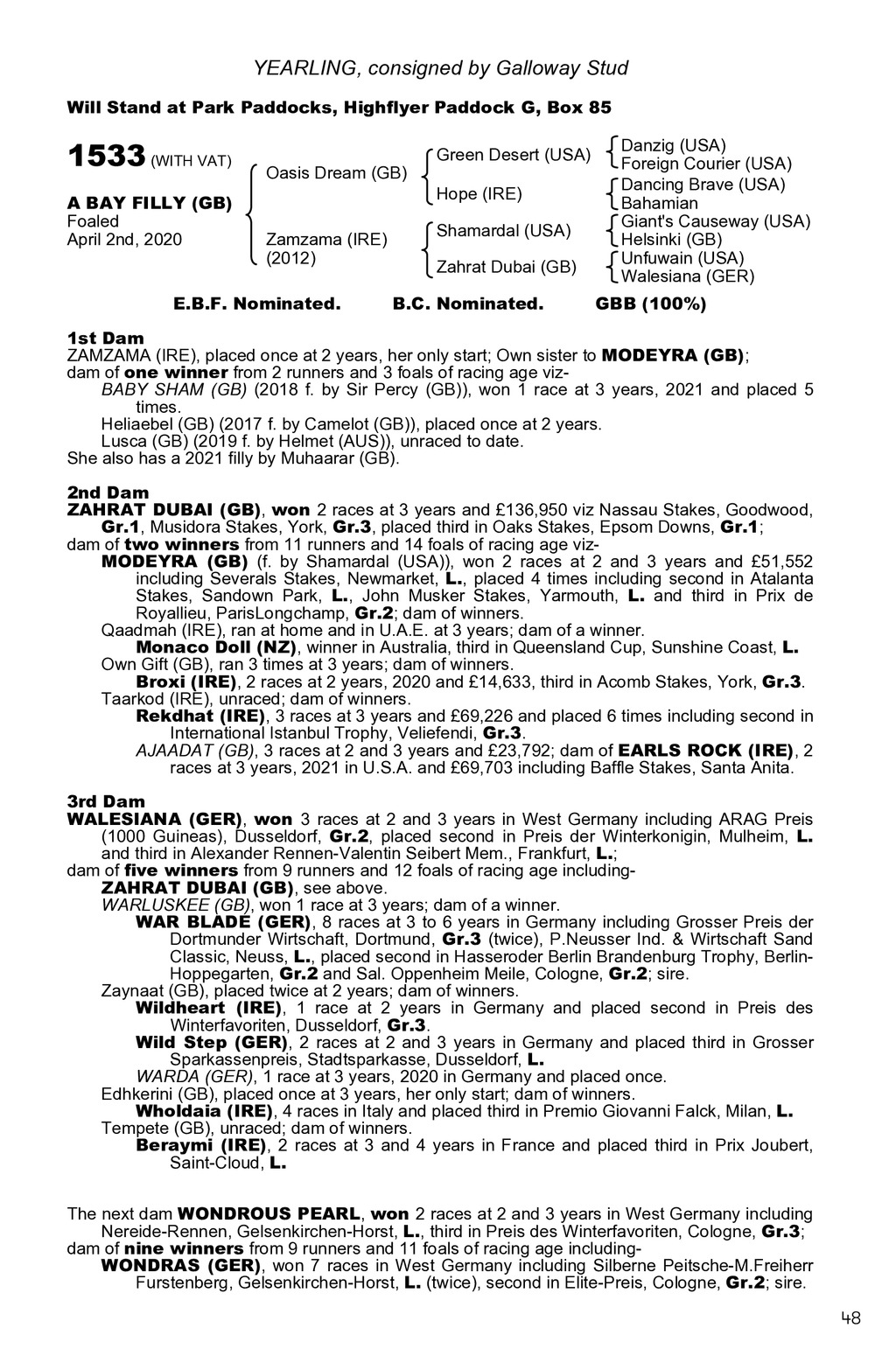 YEARLING, consigned by Galloway Stud Will Stand at Park Paddocks, Highflyer Paddock G, Box 85 1533 (WITH VAT) A BAY FILLY (GB) Foaled April 2nd, 2020 Oasis Dream (GB) Zamzama (IRE) (2012) E.B.F. Nominated. Green Desert (USA) Hope (IRE) Shamardal (USA) Zahrat Dubai (GB) B.C. Nominated. Danzig (USA) Foreign Courier (USA) Dancing Brave (USA) Bahamian Giant s Causeway (USA) Helsinki (GB) Unfuwain (USA) Walesiana (GER) GBB (100%) 1st Dam ZAMZAMA (IRE), placed once at 2 years, her only start; Own sister to MODEYRA (GB); dam of one winner from 2 runners and 3 foals of racing age vizBABY SHAM (GB) (2018 f. by Sir Percy (GB)), won 1 race at 3 years, 2021 and placed 5 times. Heliaebel (GB) (2017 f. by Camelot (GB)), placed once at 2 years. Lusca (GB) (2019 f. by Helmet (AUS)), unraced to date. She also has a 2021 filly by Muhaarar (GB). 2nd Dam ZAHRAT DUBAI (GB), won 2 races at 3 years and 136,950 viz Nassau Stakes, Goodwood, Gr.1, Musidora Stakes, York, Gr.3, placed third in Oaks Stakes, Epsom Downs, Gr.1; dam of two winners from 11 runners and 14 foals of racing age vizMODEYRA (GB) (f. by Shamardal (USA)), won 2 races at 2 and 3 years and 51,552 including Severals Stakes, Newmarket, L., placed 4 times including second in Atalanta Stakes, Sandown Park, L., John Musker Stakes, Yarmouth, L. and third in Prix de Royallieu, ParisLongchamp, Gr.2; dam of winners. Qaadmah (IRE), ran at home and in U.A.E. at 3 years; dam of a winner. Monaco Doll (NZ), winner in Australia, third in Queensland Cup, Sunshine Coast, L. Own Gift (GB), ran 3 times at 3 years; dam of winners. Broxi (IRE), 2 races at 2 years, 2020 and 14,633, third in Acomb Stakes, York, Gr.3. Taarkod (IRE), unraced; dam of winners. Rekdhat (IRE), 3 races at 3 years and 69,226 and placed 6 times including second in International Istanbul Trophy, Veliefendi, Gr.3. AJAADAT (GB), 3 races at 2 and 3 years and 23,792; dam of EARLS ROCK (IRE), 2 races at 3 years, 2021 in U.S.A. and 69,703 including Baffle Stakes, Santa Anita. 3rd Dam WALESIANA (GER), won 3 races at 2 and 3 years in West Germany including ARAG Preis (1000 Guineas), Dusseldorf, Gr.2, placed second in Preis der Winterkonigin, Mulheim, L. and third in Alexander Rennen-Valentin Seibert Mem., Frankfurt, L.; dam of five winners from 9 runners and 12 foals of racing age includingZAHRAT DUBAI (GB), see above. WARLUSKEE (GB), won 1 race at 3 years; dam of a winner. WAR BLADE (GER), 8 races at 3 to 6 years in Germany including Grosser Preis der Dortmunder Wirtschaft, Dortmund, Gr.3 (twice), P.Neusser Ind. & Wirtschaft Sand Classic, Neuss, L., placed second in Hasseroder Berlin Brandenburg Trophy, BerlinHoppegarten, Gr.2 and Sal. Oppenheim Meile, Cologne, Gr.2; sire. Zaynaat (GB), placed twice at 2 years; dam of winners. Wildheart (IRE), 1 race at 2 years in Germany and placed second in Preis des Winterfavoriten, Dusseldorf, Gr.3. Wild Step (GER), 2 races at 2 and 3 years in Germany and placed third in Grosser Sparkassenpreis, Stadtsparkasse, Dusseldorf, L. WARDA (GER), 1 race at 3 years, 2020 in Germany and placed once. Edhkerini (GB), placed once at 3 years, her only start; dam of winners. Wholdaia (IRE), 4 races in Italy and placed third in Premio Giovanni Falck, Milan, L. Tempete (GB), unraced; dam of winners. Beraymi (IRE), 2 races at 3 and 4 years in France and placed third in Prix Joubert, Saint-Cloud, L. The next dam WONDROUS PEARL, won 2 races at 2 and 3 years in West Germany including Nereide-Rennen, Gelsenkirchen-Horst, L., third in Preis des Winterfavoriten, Cologne, Gr.3; dam of nine winners from 9 runners and 11 foals of racing age includingWONDRAS (GER), won 7 races in West Germany including Silberne Peitsche-M.Freiherr Furstenberg, Gelsenkirchen-Horst, L. (twice), second in Elite-Preis, Cologne, Gr.2; sire. 48