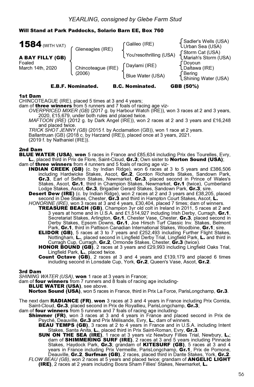 YEARLING, consigned by Glebe Farm Stud Will Stand at Park Paddocks, Solario Barn EE, Box 760 1584 (WITH VAT) A BAY FILLY (GB) Foaled March 14th, 2020 Galileo (IRE) Gleneagles (IRE) You resothrilling (USA) Chincoteague (IRE) (2006) E.B.F. Nominated. Daylami (IRE) Blue Water (USA) B.C. Nominated. Sadler s Wells (USA) Urban Sea (USA) Storm Cat (USA) Mariah s Storm (USA) Doyoun Daltawa (IRE) Bering Shining Water (USA) GBB (50%) 1st Dam CHINCOTEAGUE (IRE), placed 5 times at 3 and 4 years; dam of three winners from 5 runners and 7 foals of racing age vizOVERPRICED MIXER (GB) (2017 g. by Harbour Watch (IRE)), won 3 races at 2 and 3 years, 2020, 15,679, under both rules and placed twice. MAFTOON (IRE) (2012 g. by Dark Angel (IRE)), won 2 races at 2 and 3 years and 16,248 and placed twice. TRICK SHOT JENNY (GB) (2015 f. by Acclamation (GB)), won 1 race at 2 years. Ballantruan (GB) (2018 c. by Harzand (IRE)), placed once at 3 years, 2021. (2019 f. by Nathaniel (IRE)). 2nd Dam BLUE WATER (USA), won 5 races in France and 85,634 including Prix des Tourelles, Evry, L., placed third in Prix de Flore, Saint-Cloud, Gr.3; Own sister to Norton Sound (USA); dam of three winners from 4 runners and 5 foals of racing age vizINDIAN CREEK (GB) (c. by Indian Ridge), won 6 races at 3 to 5 years and 386,506 including Hardwicke Stakes, Ascot, Gr.2, Gordon Richards Stakes, Sandown Park, Gr.3, Earl of Sefton Stakes, Newmarket, Gr.3, placed second in Prince of Wales s Stakes, Ascot, Gr.1, third in Champion Stakes, Newmarket, Gr.1 (twice), Cumberland Lodge Stakes, Ascot, Gr.3, Brigadier Gerard Stakes, Sandown Park, Gr.3; sire. Desert Dew (IRE) (c. by Indian Ridge), won 2 races at 2 and 3 years and 38,205, placed second in Dee Stakes, Chester, Gr.3 and third in Hampton Court Stakes, Ascot, L. HONORINE (IRE), won 3 races at 3 and 4 years, 30,404, placed 7 times; dam of winners. TREASURE BEACH (GB), Champion 3yr old colt in Ireland in 2011, 5 races at 2 and 3 years at home and in U.S.A. and 1,514,927 including Irish Derby, Curragh, Gr.1, Secretariat Stakes, Arlington, Gr.1, Chester Vase, Chester, Gr.3, placed second in Derby Stakes, Epsom Downs, Gr.1, Joe Hirsch Turf Classic Inv. Stakes, Belmont Park, Gr.1, third in Pattison Canadian International Stakes, Woodbine, Gr.1; sire. ELIDOR (GB), 5 races at 3 to 7 years and 252,493 including Further Flight Stakes, Nottingham, L., placed second in Lingfield Derby Trial, Lingfield Park, L. and third in Curragh Cup, Curragh, Gr.2, Ormonde Stakes, Chester, Gr.3 (twice). HONOR BOUND (GB), 2 races at 3 years and 29,993 including Lingfield Oaks Trial, Lingfield Park, L., placed twice. Count Octave (GB), 2 races at 3 and 4 years and 139,179 and placed 6 times including second in Lonsdale Cup, York, Gr.2, Queen s Vase, Ascot, Gr.2. 3rd Dam SHINING WATER (USA), won 1 race at 3 years in France; dam of four winners from 7 runners and 8 foals of racing age includingBLUE WATER (USA), see above. Norton Sound (USA), won 5 races in France, third in Prix La Force, ParisLongchamp, Gr.3. The next dam RADIANCE (FR), won 3 races at 3 and 4 years in France including Prix Corrida, Saint-Cloud, Gr.3, placed second in Prix de Royallieu, ParisLongchamp, Gr.3; dam of four winners from 5 runners and 7 foals of racing age includingShimmer (FR), won 3 races at 3 and 4 years in France and placed second in Prix de Psych, Deauville, Gr.3 and Prix Mlisande, Evry, L.; dam of winners. BEAU TEMPS (GB), 3 races at 2 to 4 years in France and in U.S.A. including Intent Stakes, Santa Anita, L., placed third in Prix Saint-Roman, Evry, Gr.3. SUN ON THE SEA (IRE), 1 race at 3 years viz Newbury Fillies Trial, Newbury, L.; dam of SHIMMERING SURF (IRE), 2 races at 3 and 5 years including Pinnacle Stakes, Haydock Park, Gr.3; grandam of KITESURF (GB), 5 races at 3 and 4 years in France including Prix Vermeille, ParisLongchamp, Gr.1, Prix de Pomone, Deauville, Gr.2, Surfman (GB), 2 races, placed third in Dante Stakes, York, Gr.2. FLOW BEAU (GB), won 2 races at 5 years and placed twice; grandam of ANGELIC LIGHT (IRE), 2 races at 2 years including Bosra Sham Fillies Stakes, Newmarket, L. 56