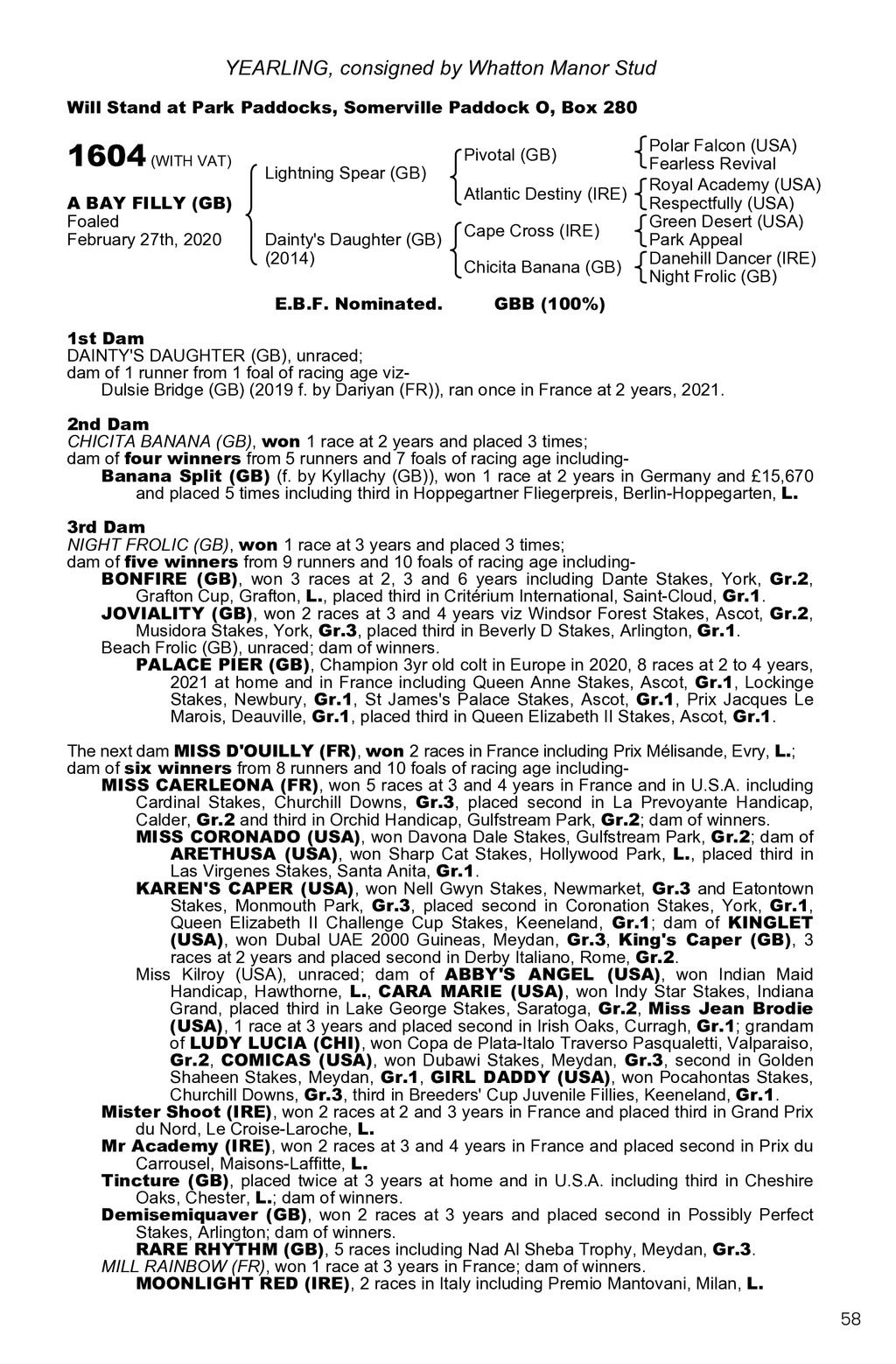 YEARLING, consigned by Whatton Manor Stud Will Stand at Park Paddocks, Somerville Paddock O, Box 280 1604 (WITH VAT) A BAY FILLY (GB) Foaled February 27th, 2020 Lightning Spear (GB) Dainty s Daughter (GB) (2014) E.B.F. Nominated. Pivotal (GB) Atlantic Destiny (IRE) Cape Cross (IRE) Chicita Banana (GB) Polar Falcon (USA) Fearless Revival Royal Academy (USA) Respectfully (USA) Green Desert (USA) Park Appeal Danehill Dancer (IRE) Night Frolic (GB) GBB (100%) 1st Dam DAINTY S DAUGHTER (GB), unraced; dam of 1 runner from 1 foal of racing age vizDulsie Bridge (GB) (2019 f. by Dariyan (FR)), ran once in France at 2 years, 2021. 2nd Dam CHICITA BANANA (GB), won 1 race at 2 years and placed 3 times; dam of four winners from 5 runners and 7 foals of racing age includingBanana Split (GB) (f. by Kyllachy (GB)), won 1 race at 2 years in Germany and 15,670 and placed 5 times including third in Hoppegartner Fliegerpreis, Berlin-Hoppegarten, L. 3rd Dam NIGHT FROLIC (GB), won 1 race at 3 years and placed 3 times; dam of five winners from 9 runners and 10 foals of racing age includingBONFIRE (GB), won 3 races at 2, 3 and 6 years including Dante Stakes, York, Gr.2, Grafton Cup, Grafton, L., placed third in Critrium International, Saint-Cloud, Gr.1. JOVIALITY (GB), won 2 races at 3 and 4 years viz Windsor Forest Stakes, Ascot, Gr.2, Musidora Stakes, York, Gr.3, placed third in Beverly D Stakes, Arlington, Gr.1. Beach Frolic (GB), unraced; dam of winners. PALACE PIER (GB), Champion 3yr old colt in Europe in 2020, 8 races at 2 to 4 years, 2021 at home and in France including Queen Anne Stakes, Ascot, Gr.1, Lockinge Stakes, Newbury, Gr.1, St James s Palace Stakes, Ascot, Gr.1, Prix Jacques Le Marois, Deauville, Gr.1, placed third in Queen Elizabeth II Stakes, Ascot, Gr.1. The next dam MISS D OUILLY (FR), won 2 races in France including Prix Mlisande, Evry, L.; dam of six winners from 8 runners and 10 foals of racing age includingMISS CAERLEONA (FR), won 5 races at 3 and 4 years in France and in U.S.A. including Cardinal Stakes, Churchill Downs, Gr.3, placed second in La Prevoyante Handicap, Calder, Gr.2 and third in Orchid Handicap, Gulfstream Park, Gr.2; dam of winners. MISS CORONADO (USA), won Davona Dale Stakes, Gulfstream Park, Gr.2; dam of ARETHUSA (USA), won Sharp Cat Stakes, Hollywood Park, L., placed third in Las Virgenes Stakes, Santa Anita, Gr.1. KAREN S CAPER (USA), won Nell Gwyn Stakes, Newmarket, Gr.3 and Eatontown Stakes, Monmouth Park, Gr.3, placed second in Coronation Stakes, York, Gr.1, Queen Elizabeth II Challenge Cup Stakes, Keeneland, Gr.1; dam of KINGLET (USA), won Dubal UAE 2000 Guineas, Meydan, Gr.3, King s Caper (GB), 3 races at 2 years and placed second in Derby Italiano, Rome, Gr.2. Miss Kilroy (USA), unraced; dam of ABBY S ANGEL (USA), won Indian Maid Handicap, Hawthorne, L., CARA MARIE (USA), won Indy Star Stakes, Indiana Grand, placed third in Lake George Stakes, Saratoga, Gr.2, Miss Jean Brodie (USA), 1 race at 3 years and placed second in Irish Oaks, Curragh, Gr.1; grandam of LUDY LUCIA (CHI), won Copa de Plata-Italo Traverso Pasqualetti, Valparaiso, Gr.2, COMICAS (USA), won Dubawi Stakes, Meydan, Gr.3, second in Golden Shaheen Stakes, Meydan, Gr.1, GIRL DADDY (USA), won Pocahontas Stakes, Churchill Downs, Gr.3, third in Breeders Cup Juvenile Fillies, Keeneland, Gr.1. Mister Shoot (IRE), won 2 races at 2 and 3 years in France and placed third in Grand Prix du Nord, Le Croise-Laroche, L. Mr Academy (IRE), won 2 races at 3 and 4 years in France and placed second in Prix du Carrousel, Maisons-Laffitte, L. Tincture (GB), placed twice at 3 years at home and in U.S.A. including third in Cheshire Oaks, Chester, L.; dam of winners. Demisemiquaver (GB), won 2 races at 3 years and placed second in Possibly Perfect Stakes, Arlington; dam of winners. RARE RHYTHM (GB), 5 races including Nad Al Sheba Trophy, Meydan, Gr.3. MILL RAINBOW (FR), won 1 race at 3 years in France; dam of winners. MOONLIGHT RED (IRE), 2 races in Italy including Premio Mantovani, Milan, L. 58
