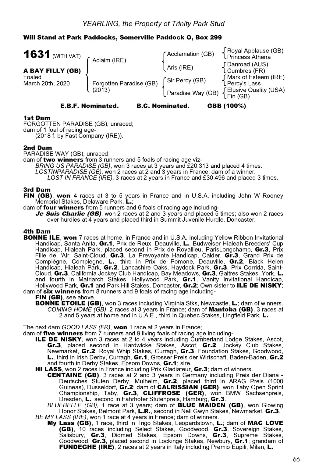 YEARLING, the Property of Trinity Park Stud Will Stand at Park Paddocks, Somerville Paddock O, Box 299 1631 (WITH VAT) A BAY FILLY (GB) Foaled March 20th, 2020 Acclamation (GB) Aclaim (IRE) Aris (IRE) Forgotten Paradise (GB) (2013) E.B.F. Nominated. Sir Percy (GB) Paradise Way (GB) B.C. Nominated. Royal Applause (GB) Princess Athena Danroad (AUS) Cumbres (FR) Mark of Esteem (IRE) Percy s Lass Elusive Quality (USA) Fin (GB) GBB (100%) 1st Dam FORGOTTEN PARADISE (GB), unraced; dam of 1 foal of racing age(2018 f. by Fast Company (IRE)). 2nd Dam PARADISE WAY (GB), unraced; dam of two winners from 3 runners and 5 foals of racing age vizBRING US PARADISE (GB), won 3 races at 3 years and 20,313 and placed 4 times. LOSTINPARADISE (GB), won 2 races at 2 and 3 years in France; dam of a winner. LOST IN FRANCE (IRE), 3 races at 2 years in France and 30,496 and placed 3 times. 3rd Dam FIN (GB), won 4 races at 3 to 5 years in France and in U.S.A. including John W Rooney Memorial Stakes, Delaware Park, L.; dam of four winners from 5 runners and 6 foals of racing age includingJe Suis Charlie (GB), won 2 races at 2 and 3 years and placed 5 times; also won 2 races over hurdles at 4 years and placed third in Summit Juvenile Hurdle, Doncaster. 4th Dam BONNE ILE, won 7 races at home, in France and in U.S.A. including Yellow Ribbon Invitational Handicap, Santa Anita, Gr.1, Prix de Reux, Deauville, L., Budweiser Hialeah Breeders Cup Handicap, Hialeah Park, placed second in Prix de Royallieu, ParisLongchamp, Gr.3, Prix Fille de l Air, Saint-Cloud, Gr.3, La Prevoyante Handicap, Calder, Gr.3, Grand Prix de Compigne, Compiegne, L., third in Prix de Pomone, Deauville, Gr.2, Black Helen Handicap, Hialeah Park, Gr.2, Lancashire Oaks, Haydock Park, Gr.3, Prix Corrida, SaintCloud, Gr.3, California Jockey Club Handicap, Bay Meadows, Gr.3, Galtres Stakes, York, L. and fourth in Matriarch Stakes, Hollywood Park, Gr.1, Vanity Invitational Handicap, Hollywood Park, Gr.1 and Park Hill Stakes, Doncaster, Gr.2; Own sister to ILE DE NISKY; dam of six winners from 8 runners and 9 foals of racing age includingFIN (GB), see above. BONNE ETOILE (GB), won 3 races including Virginia Stks, Newcastle, L.; dam of winners. COMING HOME (GB), 2 races at 3 years in France; dam of Mantoba (GB), 3 races at 2 and 5 years at home and in U.A.E., third in Quebec Stakes, Lingfield Park, L. The next dam GOOD LASS (FR), won 1 race at 2 years in France; dam of five winners from 7 runners and 9 living foals of racing age includingILE DE NISKY, won 3 races at 2 to 4 years including Cumberland Lodge Stakes, Ascot, Gr.3, placed second in Hardwicke Stakes, Ascot, Gr.2, Jockey Club Stakes, Newmarket, Gr.2, Royal Whip Stakes, Curragh, Gr.3, Foundation Stakes, Goodwood, L., third in Irish Derby, Curragh, Gr.1, Grosser Preis der Wirtschaft, Baden-Baden, Gr.2 and fourth in Derby Stakes, Epsom Downs, Gr.1; sire. HI LASS, won 2 races in France including Prix Gladiateur, Gr.3; dam of winners. CENTAINE (GB), 3 races at 2 and 3 years in Germany including Preis der Diana Deutsches Stuten Derby, Mulheim, Gr.2, placed third in ARAG Preis (1000 Guineas), Dusseldorf, Gr.2; dam of CALRISSIAN (GER), won Taby Open Sprint Championship, Taby, Gr.3, CLIFFROSE (GER), won BMW Sachsenpreis, Dresden, L., second in Fahrhofer Stutenpreis, Hamburg, Gr.3. BLUEBELLE (GB), 1 race at 3 years; dam of BLUE MAIDEN (GB), won Glowing Honor Stakes, Belmont Park, L.R., second in Nell Gwyn Stakes, Newmarket, Gr.3. BE MY LASS (IRE), won 1 race at 4 years in France; dam of winners. My Lass (GB), 1 race, third in Trigo Stakes, Leopardstown, L.; dam of MAC LOVE (GB), 10 races including Select Stakes, Goodwood, Gr.3, Sovereign Stakes, Salisbury, Gr.3, Diomed Stakes, Epsom Downs, Gr.3, Supreme Stakes, Goodwood, Gr.3, placed second in Lockinge Stakes, Newbury, Gr.1; grandam of FUNDEGHE (IRE), 2 races at 2 years in Italy including Premio Eupili, Milan, L. 66