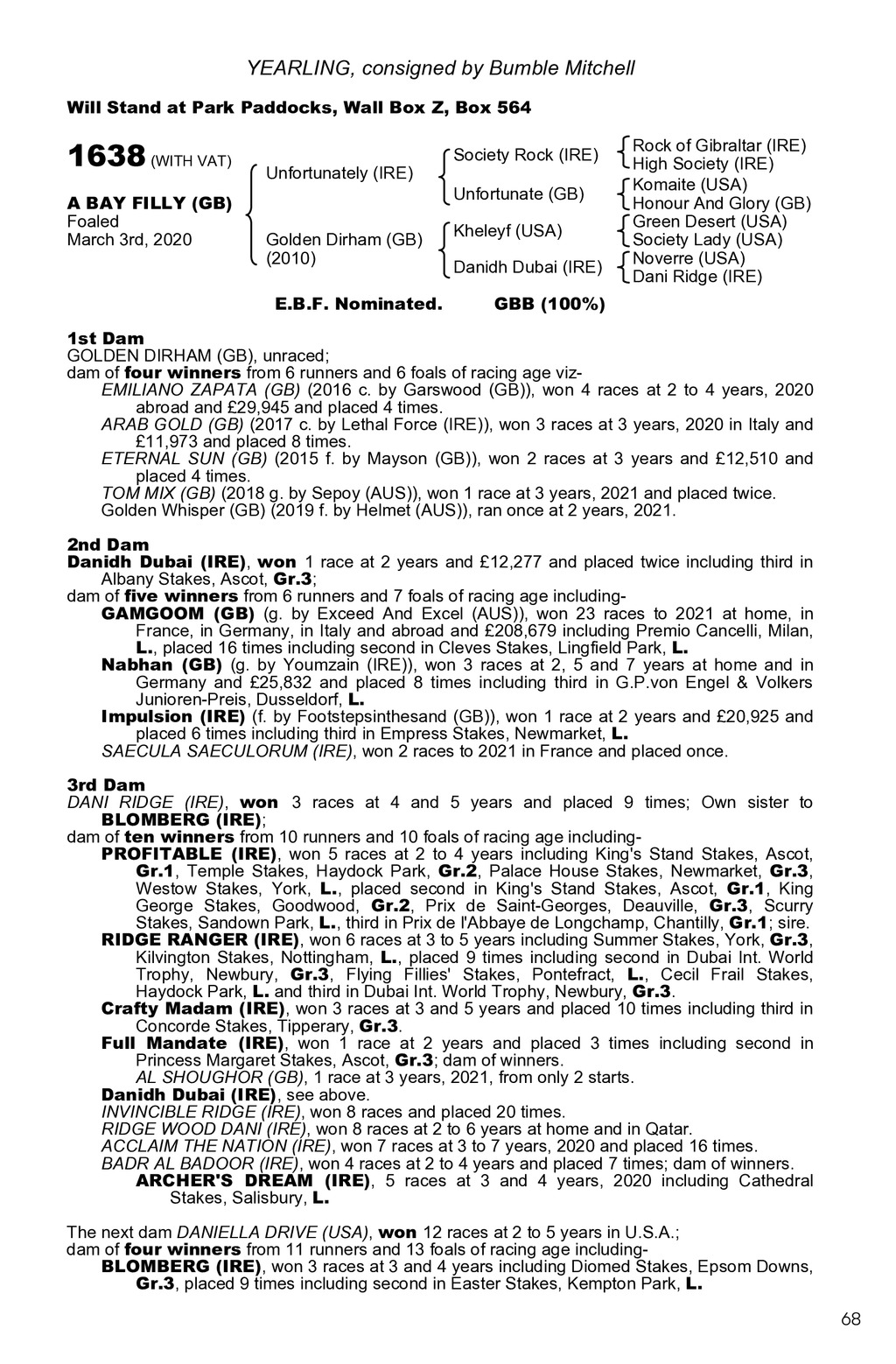 YEARLING, consigned by Bumble Mitchell Will Stand at Park Paddocks, Wall Box Z, Box 564 1638 (WITH VAT) A BAY FILLY (GB) Foaled March 3rd, 2020 Unfortunately (IRE) Golden Dirham (GB) (2010) E.B.F. Nominated. Society Rock (IRE) Unfortunate (GB) Kheleyf (USA) Danidh Dubai (IRE) Rock of Gibraltar (IRE) High Society (IRE) Komaite (USA) Honour And Glory (GB) Green Desert (USA) Society Lady (USA) Noverre (USA) Dani Ridge (IRE) GBB (100%) 1st Dam GOLDEN DIRHAM (GB), unraced; dam of four winners from 6 runners and 6 foals of racing age vizEMILIANO ZAPATA (GB) (2016 c. by Garswood (GB)), won 4 races at 2 to 4 years, 2020 abroad and 29,945 and placed 4 times. ARAB GOLD (GB) (2017 c. by Lethal Force (IRE)), won 3 races at 3 years, 2020 in Italy and 11,973 and placed 8 times. ETERNAL SUN (GB) (2015 f. by Mayson (GB)), won 2 races at 3 years and 12,510 and placed 4 times. TOM MIX (GB) (2018 g. by Sepoy (AUS)), won 1 race at 3 years, 2021 and placed twice. Golden Whisper (GB) (2019 f. by Helmet (AUS)), ran once at 2 years, 2021. 2nd Dam Danidh Dubai (IRE), won 1 race at 2 years and 12,277 and placed twice including third in Albany Stakes, Ascot, Gr.3; dam of five winners from 6 runners and 7 foals of racing age includingGAMGOOM (GB) (g. by Exceed And Excel (AUS)), won 23 races to 2021 at home, in France, in Germany, in Italy and abroad and 208,679 including Premio Cancelli, Milan, L., placed 16 times including second in Cleves Stakes, Lingfield Park, L. Nabhan (GB) (g. by Youmzain (IRE)), won 3 races at 2, 5 and 7 years at home and in Germany and 25,832 and placed 8 times including third in G.P.von Engel & Volkers Junioren-Preis, Dusseldorf, L. Impulsion (IRE) (f. by Footstepsinthesand (GB)), won 1 race at 2 years and 20,925 and placed 6 times including third in Empress Stakes, Newmarket, L. SAECULA SAECULORUM (IRE), won 2 races to 2021 in France and placed once. 3rd Dam DANI RIDGE (IRE), won 3 races at 4 and 5 years and placed 9 times; Own sister to BLOMBERG (IRE); dam of ten winners from 10 runners and 10 foals of racing age includingPROFITABLE (IRE), won 5 races at 2 to 4 years including King s Stand Stakes, Ascot, Gr.1, Temple Stakes, Haydock Park, Gr.2, Palace House Stakes, Newmarket, Gr.3, Westow Stakes, York, L., placed second in King s Stand Stakes, Ascot, Gr.1, King George Stakes, Goodwood, Gr.2, Prix de Saint-Georges, Deauville, Gr.3, Scurry Stakes, Sandown Park, L., third in Prix de l Abbaye de Longchamp, Chantilly, Gr.1; sire. RIDGE RANGER (IRE), won 6 races at 3 to 5 years including Summer Stakes, York, Gr.3, Kilvington Stakes, Nottingham, L., placed 9 times including second in Dubai Int. World Trophy, Newbury, Gr.3, Flying Fillies Stakes, Pontefract, L., Cecil Frail Stakes, Haydock Park, L. and third in Dubai Int. World Trophy, Newbury, Gr.3. Crafty Madam (IRE), won 3 races at 3 and 5 years and placed 10 times including third in Concorde Stakes, Tipperary, Gr.3. Full Mandate (IRE), won 1 race at 2 years and placed 3 times including second in Princess Margaret Stakes, Ascot, Gr.3; dam of winners. AL SHOUGHOR (GB), 1 race at 3 years, 2021, from only 2 starts. Danidh Dubai (IRE), see above. INVINCIBLE RIDGE (IRE), won 8 races and placed 20 times. RIDGE WOOD DANI (IRE), won 8 races at 2 to 6 years at home and in Qatar. ACCLAIM THE NATION (IRE), won 7 races at 3 to 7 years, 2020 and placed 16 times. BADR AL BADOOR (IRE), won 4 races at 2 to 4 years and placed 7 times; dam of winners. ARCHER S DREAM (IRE), 5 races at 3 and 4 years, 2020 including Cathedral Stakes, Salisbury, L. The next dam DANIELLA DRIVE (USA), won 12 races at 2 to 5 years in U.S.A.; dam of four winners from 11 runners and 13 foals of racing age includingBLOMBERG (IRE), won 3 races at 3 and 4 years including Diomed Stakes, Epsom Downs, Gr.3, placed 9 times including second in Easter Stakes, Kempton Park, L. 68