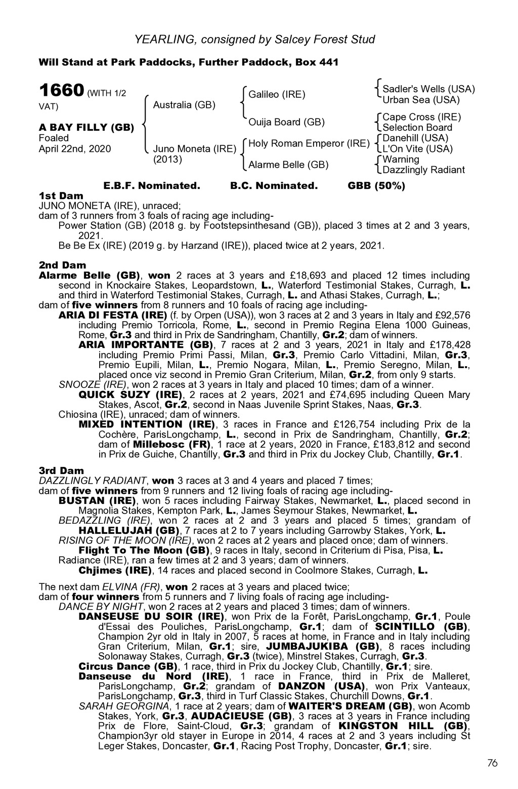 YEARLING, consigned by Salcey Forest Stud Will Stand at Park Paddocks, Further Paddock, Box 441 1660 (WITH 1/2 VAT) A BAY FILLY (GB) Foaled April 22nd, 2020 Australia (GB) Galileo (IRE) Ouija Board (GB) Juno Moneta (IRE) (2013) Holy Roman Emperor (IRE) Alarme Belle (GB) Sadler s Wells (USA) Urban Sea (USA) Cape Cross (IRE) Selection Board Danehill (USA) L On Vite (USA) Warning Dazzlingly Radiant E.B.F. Nominated. B.C. Nominated. GBB (50%) 1st Dam JUNO MONETA (IRE), unraced; dam of 3 runners from 3 foals of racing age includingPower Station (GB) (2018 g. by Footstepsinthesand (GB)), placed 3 times at 2 and 3 years, 2021. Be Be Ex (IRE) (2019 g. by Harzand (IRE)), placed twice at 2 years, 2021. 2nd Dam Alarme Belle (GB), won 2 races at 3 years and 18,693 and placed 12 times including second in Knockaire Stakes, Leopardstown, L., Waterford Testimonial Stakes, Curragh, L. and third in Waterford Testimonial Stakes, Curragh, L. and Athasi Stakes, Curragh, L.; dam of five winners from 8 runners and 10 foals of racing age includingARIA DI FESTA (IRE) (f. by Orpen (USA)), won 3 races at 2 and 3 years in Italy and 92,576 including Premio Torricola, Rome, L., second in Premio Regina Elena 1000 Guineas, Rome, Gr.3 and third in Prix de Sandringham, Chantilly, Gr.2; dam of winners. ARIA IMPORTANTE (GB), 7 races at 2 and 3 years, 2021 in Italy and 178,428 including Premio Primi Passi, Milan, Gr.3, Premio Carlo Vittadini, Milan, Gr.3, Premio Eupili, Milan, L., Premio Nogara, Milan, L., Premio Seregno, Milan, L., placed once viz second in Premio Gran Criterium, Milan, Gr.2, from only 9 starts. SNOOZE (IRE), won 2 races at 3 years in Italy and placed 10 times; dam of a winner. QUICK SUZY (IRE), 2 races at 2 years, 2021 and 74,695 including Queen Mary Stakes, Ascot, Gr.2, second in Naas Juvenile Sprint Stakes, Naas, Gr.3. Chiosina (IRE), unraced; dam of winners. MIXED INTENTION (IRE), 3 races in France and 126,754 including Prix de la Cochre, ParisLongchamp, L., second in Prix de Sandringham, Chantilly, Gr.2; dam of Millebosc (FR), 1 race at 2 years, 2020 in France, 183,812 and second in Prix de Guiche, Chantilly, Gr.3 and third in Prix du Jockey Club, Chantilly, Gr.1. 3rd Dam DAZZLINGLY RADIANT, won 3 races at 3 and 4 years and placed 7 times; dam of five winners from 9 runners and 12 living foals of racing age includingBUSTAN (IRE), won 5 races including Fairway Stakes, Newmarket, L., placed second in Magnolia Stakes, Kempton Park, L., James Seymour Stakes, Newmarket, L. BEDAZZLING (IRE), won 2 races at 2 and 3 years and placed 5 times; grandam of HALLELUJAH (GB), 7 races at 2 to 7 years including Garrowby Stakes, York, L. RISING OF THE MOON (IRE), won 2 races at 2 years and placed once; dam of winners. Flight To The Moon (GB), 9 races in Italy, second in Criterium di Pisa, Pisa, L. Radiance (IRE), ran a few times at 2 and 3 years; dam of winners. Chjimes (IRE), 14 races and placed second in Coolmore Stakes, Curragh, L. The next dam ELVINA (FR), won 2 races at 3 years and placed twice; dam of four winners from 5 runners and 7 living foals of racing age includingDANCE BY NIGHT, won 2 races at 2 years and placed 3 times; dam of winners. DANSEUSE DU SOIR (IRE), won Prix de la Fort, ParisLongchamp, Gr.1, Poule d Essai des Pouliches, ParisLongchamp, Gr.1; dam of SCINTILLO (GB), Champion 2yr old in Italy in 2007, 5 races at home, in France and in Italy including Gran Criterium, Milan, Gr.1; sire, JUMBAJUKIBA (GB), 8 races including Solonaway Stakes, Curragh, Gr.3 (twice), Minstrel Stakes, Curragh, Gr.3. Circus Dance (GB), 1 race, third in Prix du Jockey Club, Chantilly, Gr.1; sire. Danseuse du Nord (IRE), 1 race in France, third in Prix de Malleret, ParisLongchamp, Gr.2; grandam of DANZON (USA), won Prix Vanteaux, ParisLongchamp, Gr.3, third in Turf Classic Stakes, Churchill Downs, Gr.1. SARAH GEORGINA, 1 race at 2 years; dam of WAITER S DREAM (GB), won Acomb Stakes, York, Gr.3, AUDACIEUSE (GB), 3 races at 3 years in France including Prix de Flore, Saint-Cloud, Gr.3; grandam of KINGSTON HILL (GB), Champion3yr old stayer in Europe in 2014, 4 races at 2 and 3 years including St Leger Stakes, Doncaster, Gr.1, Racing Post Trophy, Doncaster, Gr.1; sire. 76