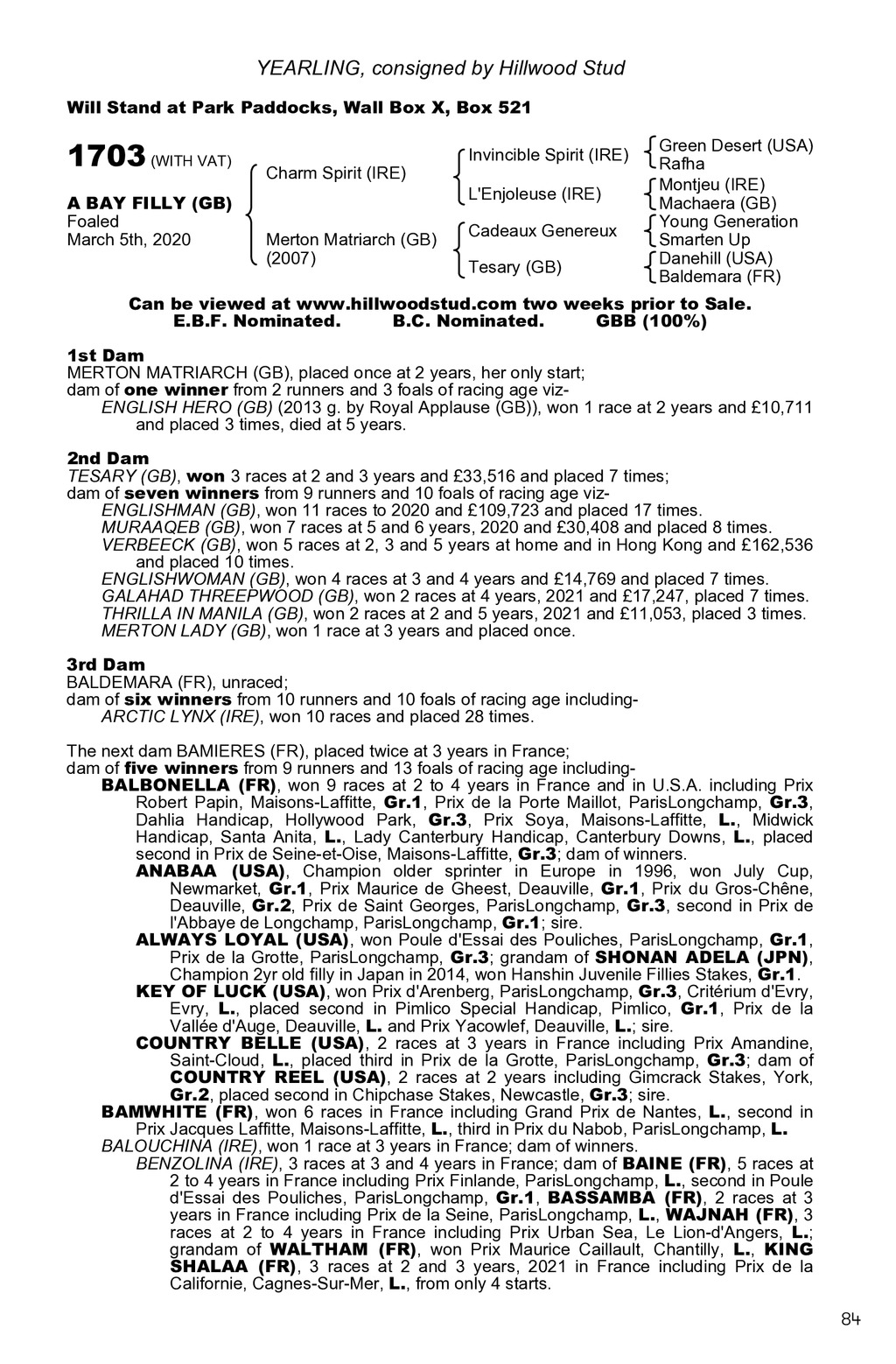 YEARLING, consigned by Hillwood Stud Will Stand at Park Paddocks, Wall Box X, Box 521 1703 (WITH VAT) A BAY FILLY (GB) Foaled March 5th, 2020 Charm Spirit (IRE) Merton Matriarch (GB) (2007) Invincible Spirit (IRE) L Enjoleuse (IRE) Cadeaux Genereux Tesary (GB) Green Desert (USA) Rafha Montjeu (IRE) Machaera (GB) Young Generation Smarten Up Danehill (USA) Baldemara (FR) Can be viewed at www.hillwoodstud.com two weeks prior to Sale. E.B.F. Nominated. B.C. Nominated. GBB (100%) 1st Dam MERTON MATRIARCH (GB), placed once at 2 years, her only start; dam of one winner from 2 runners and 3 foals of racing age vizENGLISH HERO (GB) (2013 g. by Royal Applause (GB)), won 1 race at 2 years and 10,711 and placed 3 times, died at 5 years. 2nd Dam TESARY (GB), won 3 races at 2 and 3 years and 33,516 and placed 7 times; dam of seven winners from 9 runners and 10 foals of racing age vizENGLISHMAN (GB), won 11 races to 2020 and 109,723 and placed 17 times. MURAAQEB (GB), won 7 races at 5 and 6 years, 2020 and 30,408 and placed 8 times. VERBEECK (GB), won 5 races at 2, 3 and 5 years at home and in Hong Kong and 162,536 and placed 10 times. ENGLISHWOMAN (GB), won 4 races at 3 and 4 years and 14,769 and placed 7 times. GALAHAD THREEPWOOD (GB), won 2 races at 4 years, 2021 and 17,247, placed 7 times. THRILLA IN MANILA (GB), won 2 races at 2 and 5 years, 2021 and 11,053, placed 3 times. MERTON LADY (GB), won 1 race at 3 years and placed once. 3rd Dam BALDEMARA (FR), unraced; dam of six winners from 10 runners and 10 foals of racing age includingARCTIC LYNX (IRE), won 10 races and placed 28 times. The next dam BAMIERES (FR), placed twice at 3 years in France; dam of five winners from 9 runners and 13 foals of racing age includingBALBONELLA (FR), won 9 races at 2 to 4 years in France and in U.S.A. including Prix Robert Papin, Maisons-Laffitte, Gr.1, Prix de la Porte Maillot, ParisLongchamp, Gr.3, Dahlia Handicap, Hollywood Park, Gr.3, Prix Soya, Maisons-Laffitte, L., Midwick Handicap, Santa Anita, L., Lady Canterbury Handicap, Canterbury Downs, L., placed second in Prix de Seine-et-Oise, Maisons-Laffitte, Gr.3; dam of winners. ANABAA (USA), Champion older sprinter in Europe in 1996, won July Cup, Newmarket, Gr.1, Prix Maurice de Gheest, Deauville, Gr.1, Prix du Gros-Chne, Deauville, Gr.2, Prix de Saint Georges, ParisLongchamp, Gr.3, second in Prix de l Abbaye de Longchamp, ParisLongchamp, Gr.1; sire. ALWAYS LOYAL (USA), won Poule d Essai des Pouliches, ParisLongchamp, Gr.1, Prix de la Grotte, ParisLongchamp, Gr.3; grandam of SHONAN ADELA (JPN), Champion 2yr old filly in Japan in 2014, won Hanshin Juvenile Fillies Stakes, Gr.1. KEY OF LUCK (USA), won Prix d Arenberg, ParisLongchamp, Gr.3, Critrium d Evry, Evry, L., placed second in Pimlico Special Handicap, Pimlico, Gr.1, Prix de la Valle d Auge, Deauville, L. and Prix Yacowlef, Deauville, L.; sire. COUNTRY BELLE (USA), 2 races at 3 years in France including Prix Amandine, Saint-Cloud, L., placed third in Prix de la Grotte, ParisLongchamp, Gr.3; dam of COUNTRY REEL (USA), 2 races at 2 years including Gimcrack Stakes, York, Gr.2, placed second in Chipchase Stakes, Newcastle, Gr.3; sire. BAMWHITE (FR), won 6 races in France including Grand Prix de Nantes, L., second in Prix Jacques Laffitte, Maisons-Laffitte, L., third in Prix du Nabob, ParisLongchamp, L. BALOUCHINA (IRE), won 1 race at 3 years in France; dam of winners. BENZOLINA (IRE), 3 races at 3 and 4 years in France; dam of BAINE (FR), 5 races at 2 to 4 years in France including Prix Finlande, ParisLongchamp, L., second in Poule d Essai des Pouliches, ParisLongchamp, Gr.1, BASSAMBA (FR), 2 races at 3 years in France including Prix de la Seine, ParisLongchamp, L., WAJNAH (FR), 3 races at 2 to 4 years in France including Prix Urban Sea, Le Lion-d Angers, L.; grandam of WALTHAM (FR), won Prix Maurice Caillault, Chantilly, L., KING SHALAA (FR), 3 races at 2 and 3 years, 2021 in France including Prix de la Californie, Cagnes-Sur-Mer, L., from only 4 starts. 84