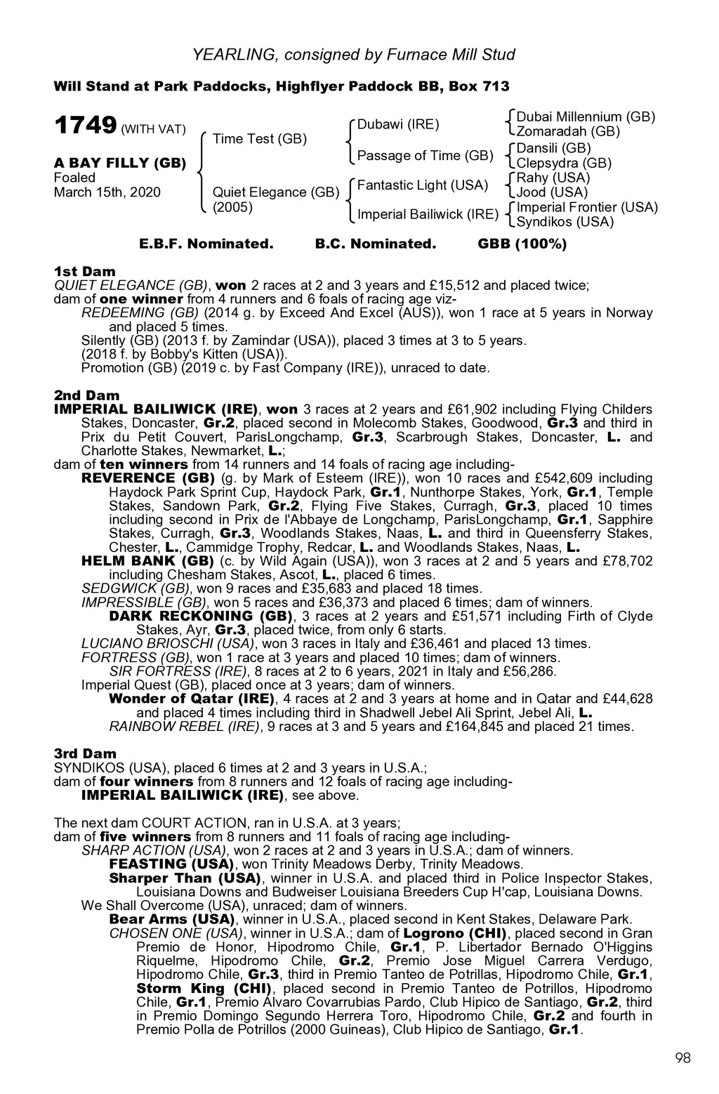 YEARLING, consigned by Furnace Mill Stud Will Stand at Park Paddocks, Highflyer Paddock BB, Box 713 1749 (WITH VAT) A BAY FILLY (GB) Foaled March 15th, 2020 Dubawi (IRE) Time Test (GB) Passage of Time (GB) Quiet Elegance (GB) (2005) E.B.F. Nominated. Fantastic Light (USA) Imperial Bailiwick (IRE) B.C. Nominated. Dubai Millennium (GB) Zomaradah (GB) Dansili (GB) Clepsydra (GB) Rahy (USA) Jood (USA) Imperial Frontier (USA) Syndikos (USA) GBB (100%) 1st Dam QUIET ELEGANCE (GB), won 2 races at 2 and 3 years and 15,512 and placed twice; dam of one winner from 4 runners and 6 foals of racing age vizREDEEMING (GB) (2014 g. by Exceed And Excel (AUS)), won 1 race at 5 years in Norway and placed 5 times. Silently (GB) (2013 f. by Zamindar (USA)), placed 3 times at 3 to 5 years. (2018 f. by Bobby s Kitten (USA)). Promotion (GB) (2019 c. by Fast Company (IRE)), unraced to date. 2nd Dam IMPERIAL BAILIWICK (IRE), won 3 races at 2 years and 61,902 including Flying Childers Stakes, Doncaster, Gr.2, placed second in Molecomb Stakes, Goodwood, Gr.3 and third in Prix du Petit Couvert, ParisLongchamp, Gr.3, Scarbrough Stakes, Doncaster, L. and Charlotte Stakes, Newmarket, L.; dam of ten winners from 14 runners and 14 foals of racing age includingREVERENCE (GB) (g. by Mark of Esteem (IRE)), won 10 races and 542,609 including Haydock Park Sprint Cup, Haydock Park, Gr.1, Nunthorpe Stakes, York, Gr.1, Temple Stakes, Sandown Park, Gr.2, Flying Five Stakes, Curragh, Gr.3, placed 10 times including second in Prix de l Abbaye de Longchamp, ParisLongchamp, Gr.1, Sapphire Stakes, Curragh, Gr.3, Woodlands Stakes, Naas, L. and third in Queensferry Stakes, Chester, L., Cammidge Trophy, Redcar, L. and Woodlands Stakes, Naas, L. HELM BANK (GB) (c. by Wild Again (USA)), won 3 races at 2 and 5 years and 78,702 including Chesham Stakes, Ascot, L., placed 6 times. SEDGWICK (GB), won 9 races and 35,683 and placed 18 times. IMPRESSIBLE (GB), won 5 races and 36,373 and placed 6 times; dam of winners. DARK RECKONING (GB), 3 races at 2 years and 51,571 including Firth of Clyde Stakes, Ayr, Gr.3, placed twice, from only 6 starts. LUCIANO BRIOSCHI (USA), won 3 races in Italy and 36,461 and placed 13 times. FORTRESS (GB), won 1 race at 3 years and placed 10 times; dam of winners. SIR FORTRESS (IRE), 8 races at 2 to 6 years, 2021 in Italy and 56,286. Imperial Quest (GB), placed once at 3 years; dam of winners. Wonder of Qatar (IRE), 4 races at 2 and 3 years at home and in Qatar and 44,628 and placed 4 times including third in Shadwell Jebel Ali Sprint, Jebel Ali, L. RAINBOW REBEL (IRE), 9 races at 3 and 5 years and 164,845 and placed 21 times. 3rd Dam SYNDIKOS (USA), placed 6 times at 2 and 3 years in U.S.A.; dam of four winners from 8 runners and 12 foals of racing age includingIMPERIAL BAILIWICK (IRE), see above. The next dam COURT ACTION, ran in U.S.A. at 3 years; dam of five winners from 8 runners and 11 foals of racing age includingSHARP ACTION (USA), won 2 races at 2 and 3 years in U.S.A.; dam of winners. FEASTING (USA), won Trinity Meadows Derby, Trinity Meadows. Sharper Than (USA), winner in U.S.A. and placed third in Police Inspector Stakes, Louisiana Downs and Budweiser Louisiana Breeders Cup H cap, Louisiana Downs. We Shall Overcome (USA), unraced; dam of winners. Bear Arms (USA), winner in U.S.A., placed second in Kent Stakes, Delaware Park. CHOSEN ONE (USA), winner in U.S.A.; dam of Logrono (CHI), placed second in Gran Premio de Honor, Hipodromo Chile, Gr.1, P. Libertador Bernado O Higgins Riquelme, Hipodromo Chile, Gr.2, Premio Jose Miguel Carrera Verdugo, Hipodromo Chile, Gr.3, third in Premio Tanteo de Potrillas, Hipodromo Chile, Gr.1, Storm King (CHI), placed second in Premio Tanteo de Potrillos, Hipodromo Chile, Gr.1, Premio Alvaro Covarrubias Pardo, Club Hipico de Santiago, Gr.2, third in Premio Domingo Segundo Herrera Toro, Hipodromo Chile, Gr.2 and fourth in Premio Polla de Potrillos (2000 Guineas), Club Hipico de Santiago, Gr.1. 98