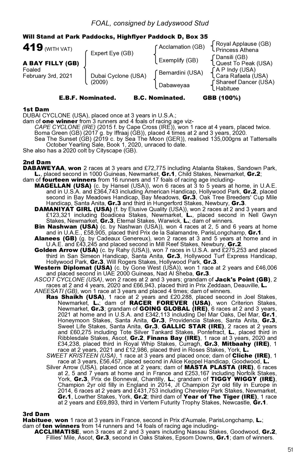 0304W93.GUI 00Ashadihan (GB)|2021|F|A|2845397 341 341 Consigned by Trinity Park Stud With VAT BAY FILLY (GB) May 1st, 2021 (Second Produce) Cracksman (GB) Ashadihan (GB) (2013) Frankel Rhadegunda Kyllachy Miss Delila Galileo Kind Pivotal St Radegund Pivotal Pretty Poppy Malibu Moon Staraway E.B.F. Nominated. B.C. Nominated. GBB (100%) Basis of Sale (see Condition 4): Sold subject to post sale veterinary examination for wind only by The Purchasers Vet. 1st dam ASHADIHAN (GB): 3 wins at 2 to 4 and 88,923 inc. Chartwell Fillies S., Gr.3, placed twice inc. 2nd Albany S., Gr.3; dam of 1 previous foal; 1 runner: Time To Parley (GB) (19 f. by Invincible Spirit (IRE)): placed at 3, 2022. 2nd dam MISS DELILA (USA): ran twice at 2; dam of 10 foals; 10 runners; 8 winners inc.: ASHADIHAN (GB) (f. by Kyllachy (GB)): see above. BEAUTY FILLY (GB) (f. by Invincible Spirit (IRE)): 4 wins at 2 to 4 and 55,899 inc. City Plate, L., placed 5 times; broodmare. Mythical Madness (GB): 14 wins to 2022 and 170,638 and placed 28 times. 3rd dam STARAWAY (USA) (by Star de Naskra (USA)): 20 wins in U.S.A. and 294,833 inc. Edmonton Distaff H., L. (twice), Sonoma H., L., Matron H., Duchess of York H. (3 times), Ken Pearson Memorial H. (twice), Rio Terrace H. (twice), M R Jenkins Memorial S. (twice), Great Western Distaff S., Autumn Belle Breeders Cup H., placed 2nd City of Edmonton Distaff H., L., Rio Terrace H., Wild Rose H., Matron H., Mademoiselle H. (twice), Ken Pearson Memorial H. (twice), Elmbrook H., Northlands Oaks, Junior Miss S., Chariot Chaser H. and 3rd Ballerina S., L.R., Elmbrook H.; dam of 9 foals; 8 runners; 5 winners inc.: SANDER CAMILLO (USA): 2 wins at 2 viz. Cherry Hinton S., Gr.2, Albany S., Gr.3, placed 2nd Nell Gwyn S., Gr.3; dam of winners: Square Pants (USA): winner at 4 in U.S.A.; dam of winners: Beat of The Drum (IRE): 3 wins, 108,058 viz. winner at 3; also 2 wins in China and in U.S.A. and placed 3rd Kathryn Crosby S., R. Mona Quita (USA): winner at 3 in U.S.A.; dam of winners: OPPORTUNISTIC (USA): won Emerald Downs Derby. 4th dam ICEAWAY (USA): 2 wins at 2 in U.S.A.; dam of 7 runners; 6 winners inc.: Forlaway (USA): 2 wins viz. winner, 2nd Hello Gorgeous S., L., Shanbally House Stud S., L., 3rd Lanes End Farm S., L.; also winner in U.S.A. Bojo Ro (USA): 3 wins at 2 and 3 in U.S.A.; dam of winners: FUN IN EXCESS (USA): won Pro or Con S., L., Run For The Roses S., L., California Cup Matron H., L., placed 2nd Hawthorne H., Gr.2. Winninginexcess (USA): winner in U.S.A., 2nd Zany Tactics S., L.; sire. Avide (USA); dam of winners inc.: MONASHEE (USA): won Ballerina Breeders Cup S., Gr.3 (twice), British Columbia Breeders Cup Oaks, Gr.3; dam of Arranger (CAN) (winner in Canada and placed 2nd Jack Diamond Futurity (c&g), R.). Stabled in Barn Box Stabled in Barn B Box 85 52