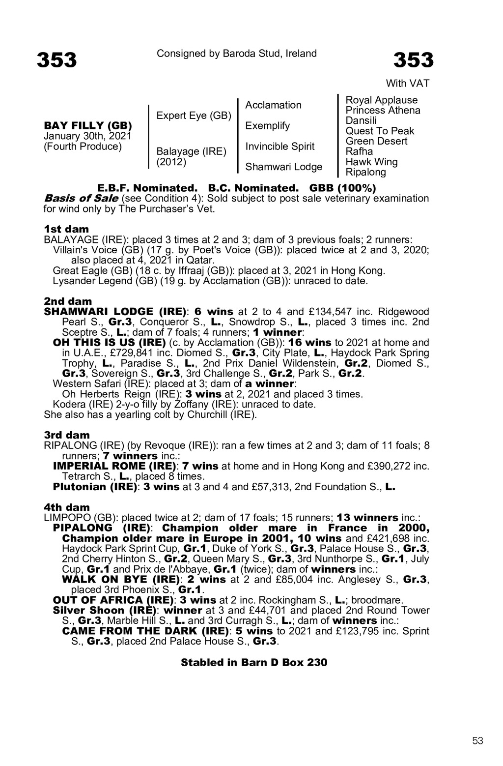 0304W93.GUI 00Ashadihan (GB)|2021|F|A|2845397 341 341 Consigned by Trinity Park Stud With VAT BAY FILLY (GB) May 1st, 2021 (Second Produce) Cracksman (GB) Ashadihan (GB) (2013) Frankel Rhadegunda Kyllachy Miss Delila Galileo Kind Pivotal St Radegund Pivotal Pretty Poppy Malibu Moon Staraway E.B.F. Nominated. B.C. Nominated. GBB (100%) Basis of Sale (see Condition 4): Sold subject to post sale veterinary examination for wind only by The Purchasers Vet. 1st dam ASHADIHAN (GB): 3 wins at 2 to 4 and 88,923 inc. Chartwell Fillies S., Gr.3, placed twice inc. 2nd Albany S., Gr.3; dam of 1 previous foal; 1 runner: Time To Parley (GB) (19 f. by Invincible Spirit (IRE)): placed at 3, 2022. 2nd dam MISS DELILA (USA): ran twice at 2; dam of 10 foals; 10 runners; 8 winners inc.: ASHADIHAN (GB) (f. by Kyllachy (GB)): see above. BEAUTY FILLY (GB) (f. by Invincible Spirit (IRE)): 4 wins at 2 to 4 and 55,899 inc. City Plate, L., placed 5 times; broodmare. Mythical Madness (GB): 14 wins to 2022 and 170,638 and placed 28 times. 3rd dam STARAWAY (USA) (by Star de Naskra (USA)): 20 wins in U.S.A. and 294,833 inc. Edmonton Distaff H., L. (twice), Sonoma H., L., Matron H., Duchess of York H. (3 times), Ken Pearson Memorial H. (twice), Rio Terrace H. (twice), M R Jenkins Memorial S. (twice), Great Western Distaff S., Autumn Belle Breeders Cup H., placed 2nd City of Edmonton Distaff H., L., Rio Terrace H., Wild Rose H., Matron H., Mademoiselle H. (twice), Ken Pearson Memorial H. (twice), Elmbrook H., Northlands Oaks, Junior Miss S., Chariot Chaser H. and 3rd Ballerina S., L.R., Elmbrook H.; dam of 9 foals; 8 runners; 5 winners inc.: SANDER CAMILLO (USA): 2 wins at 2 viz. Cherry Hinton S., Gr.2, Albany S., Gr.3, placed 2nd Nell Gwyn S., Gr.3; dam of winners: Square Pants (USA): winner at 4 in U.S.A.; dam of winners: Beat of The Drum (IRE): 3 wins, 108,058 viz. winner at 3; also 2 wins in China and in U.S.A. and placed 3rd Kathryn Crosby S., R. Mona Quita (USA): winner at 3 in U.S.A.; dam of winners: OPPORTUNISTIC (USA): won Emerald Downs Derby. 4th dam ICEAWAY (USA): 2 wins at 2 in U.S.A.; dam of 7 runners; 6 winners inc.: Forlaway (USA): 2 wins viz. winner, 2nd Hello Gorgeous S., L., Shanbally House Stud S., L., 3rd Lanes End Farm S., L.; also winner in U.S.A. Bojo Ro (USA): 3 wins at 2 and 3 in U.S.A.; dam of winners: FUN IN EXCESS (USA): won Pro or Con S., L., Run For The Roses S., L., California Cup Matron H., L., placed 2nd Hawthorne H., Gr.2. Winninginexcess (USA): winner in U.S.A., 2nd Zany Tactics S., L.; sire. Avide (USA); dam of winners inc.: MONASHEE (USA): won Ballerina Breeders Cup S., Gr.3 (twice), British Columbia Breeders Cup Oaks, Gr.3; dam of Arranger (CAN) (winner in Canada and placed 2nd Jack Diamond Futurity (c&g), R.). Stabled in Barn Box Stabled in Barn B Box 85 52