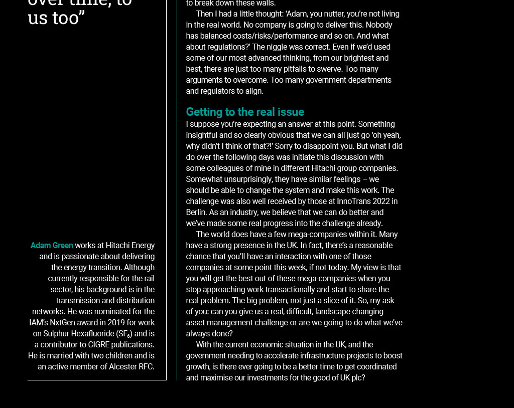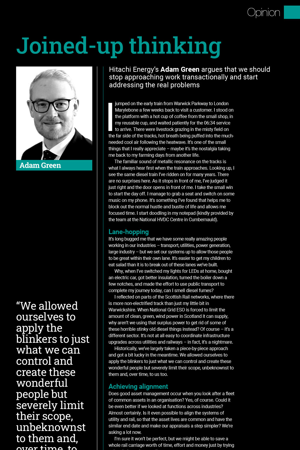 Opinion Joined-up thinking Hitachi Energys Adam Green argues that we should stop approaching work transactionally and start addressing the real problems I Adam Green jumped on the early train from Warwick Parkway to London Marylebone a few weeks back to visit a customer. I stood on the platform with a hot cup of coffee from the small shop, in my reusable cup, and waited patiently for the 06:34 service to arrive. There were livestock grazing in the misty field on the far side of the tracks, hot breath being puffed into the muchneeded cool air following the heatwave. Its one of the small things that I really appreciate maybe its the nostalgia taking me back to my farming days from another life. The familiar sound of metallic resonance on the tracks is what I always hear first when the train approaches. Looking up, I see the same diesel train Ive ridden on for many years. There are no surprises here. As it stops in front of me, Ive judged it just right and the door opens in front of me. I take the small win to start the day off. I manage to grab a seat and switch on some music on my phone. Its something Ive found that helps me to block out the normal hustle and bustle of life and allows me focused time. I start doodling in my notepad (kindly provided by the team at the National HVDC Centre in Cumbernauld). Lane-hopping We allowed ourselves to apply the blinkers to just what we can control and create these wonderful people but severely limit their scope, unbeknownst to them and, over time, to us too Its long bugged me that we have some really amazing people working in our industries transport, utilities, power generation, large industry but we set our systems up to allow those people to be great within their own lane. Its easier to get my children to eat salad than it is to break out of these lanes weve built. Why, when Ive switched my lights for LEDs at home, bought an electric car, got better insulation, turned the boiler down a few notches, and made the effort to use public transport to complete my journey today, can I smell diesel fumes? I reflected on parts of the Scottish Rail networks, where there is more non-electrified track than just my little bit in Warwickshire. When National Grid ESO is forced to limit the amount of clean, green, wind power in Scotland it can supply, why arent we using that surplus power to get rid of some of these horrible stinky old diesel things instead? Of course its a different sector. Its not at all easy to coordinate infrastructure upgrades across utilities and railways in fact, its a nightmare. Historically, weve largely taken a piece-by-piece approach and got a bit lucky in the meantime. We allowed ourselves to apply the blinkers to just what we can control and create these wonderful people but severely limit their scope, unbeknownst to them and, over time, to us too. Achieving alignment Does good asset management occur when you look after a fleet of common assets in an organisation? Yes, of course. Could it be even better if we looked at functions across industries? Almost certainly. Is it even possible to align the systems of utility and rail, so that the asset lives are common and have the similar end date and make our appraisals a step simpler? Were asking a lot now. Im sure it wont be perfect, but we might be able to save a whole rail carriage worth of time, effort and money just by trying to break down these walls. Then I had a little thought: Adam, you nutter, youre not living in the real world. No company is going to deliver this. Nobody has balanced costs/risks/performance and so on. And what about regulations? The niggle was correct. Even if wed used some of our most advanced thinking, from our brightest and best, there are just too many pitfalls to swerve. Too many arguments to overcome. Too many government departments and regulators to align. Getting to the real issue Adam Green works at Hitachi Energy and is passionate about delivering the energy transition. Although currently responsible for the rail sector, his background is in the transmission and distribution networks. He was nominated for the IAMs NxtGen award in 2019 for work on Sulphur Hexafluoride (SF6) and is a contributor to CIGRE publications. He is married with two children and is an active member of Alcester RFC. I suppose youre expecting an answer at this point. Something insightful and so clearly obvious that we can all just go oh yeah, why didnt I think of that?! Sorry to disappoint you. But what I did do over the following days was initiate this discussion with some colleagues of mine in different Hitachi group companies. Somewhat unsurprisingly, they have similar feelings we should be able to change the system and make this work. The challenge was also well received by those at InnoTrans 2022 in Berlin. As an industry, we believe that we can do better and weve made some real progress into the challenge already. The world does have a few mega-companies within it. Many have a strong presence in the UK. In fact, theres a reasonable chance that youll have an interaction with one of those companies at some point this week, if not today. My view is that you will get the best out of these mega-companies when you stop approaching work transactionally and start to share the real problem. The big problem, not just a slice of it. So, my ask of you: can you give us a real, difficult, landscape-changing asset management challenge or are we going to do what weve always done? With the current economic situation in the UK, and the government needing to accelerate infrastructure projects to boost growth, is there ever going to be a better time to get coordinated and maximise our investments for the good of UK plc?