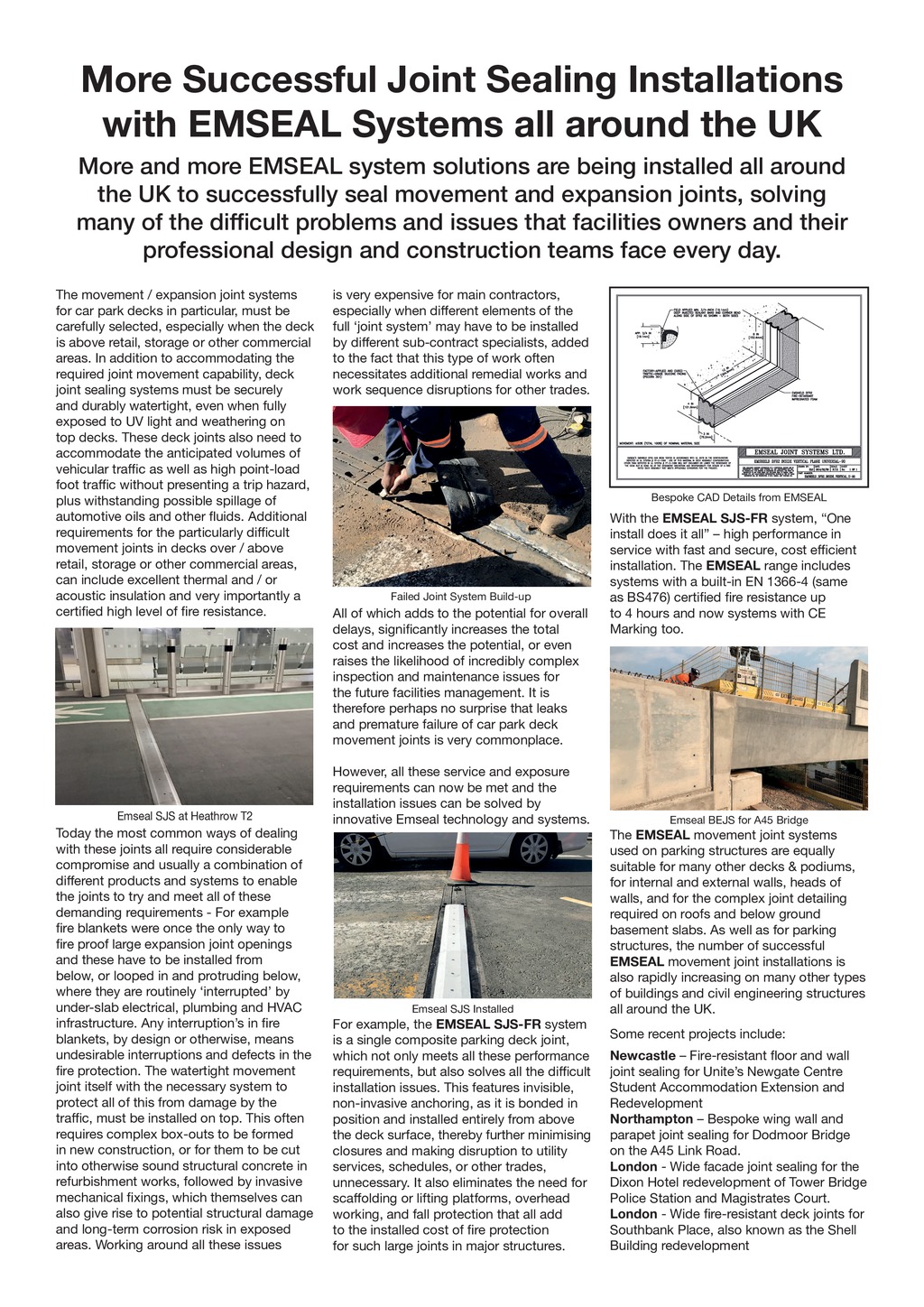 More Successful Joint Sealing Installations with EMSEAL Systems all around the UK More and more EMSEAL system solutions are being installed all around the UK to successfully seal movement and expansion joints, solving many of the difficult problems and issues that facilities owners and their professional design and construction teams face every day. The movement / expansion joint systems for car park decks in particular, must be carefully selected, especially when the deck is above retail, storage or other commercial areas. In addition to accommodating the required joint movement capability, deck joint sealing systems must be securely and durably watertight, even when fully exposed to UV light and weathering on top decks. These deck joints also need to accommodate the anticipated volumes of vehicular traffic as well as high point-load foot traffic without presenting a trip hazard, plus withstanding possible spillage of automotive oils and other fluids. Additional requirements for the particularly difficult movement joints in decks over / above retail, storage or other commercial areas, can include excellent thermal and / or acoustic insulation and very importantly a certified high level of fire resistance. Emseal SJS at Heathrow T2 Today the most common ways of dealing with these joints all require considerable compromise and usually a combination of different products and systems to enable the joints to try and meet all of these demanding requirements - For example fire blankets were once the only way to fire proof large expansion joint openings and these have to be installed from below, or looped in and protruding below, where they are routinely interrupted by under-slab electrical, plumbing and HVAC infrastructure. Any interruptions in fire blankets, by design or otherwise, means undesirable interruptions and defects in the fire protection. The watertight movement joint itself with the necessary system to protect all of this from damage by the traffic, must be installed on top. This often requires complex box-outs to be formed in new construction, or for them to be cut into otherwise sound structural concrete in refurbishment works, followed by invasive mechanical fixings, which themselves can also give rise to potential structural damage and long-term corrosion risk in exposed areas. Working around all these issues PNDec18 pp30-31 Ads.indd 30 is very expensive for main contractors, especially when different elements of the full joint system may have to be installed by different sub-contract specialists, added to the fact that this type of work often necessitates additional remedial works and work sequence disruptions for other trades. Bespoke CAD Details from EMSEAL Failed Joint System Build-up All of which adds to the potential for overall delays, significantly increases the total cost and increases the potential, or even raises the likelihood of incredibly complex inspection and maintenance issues for the future facilities management. It is therefore perhaps no surprise that leaks and premature failure of car park deck movement joints is very commonplace. However, all these service and exposure requirements can now be met and the installation issues can be solved by innovative Emseal technology and systems. Emseal SJS Installed For example, the EMSEAL SJS-FR system is a single composite parking deck joint, which not only meets all these performance requirements, but also solves all the difficult installation issues. This features invisible, non-invasive anchoring, as it is bonded in position and installed entirely from above the deck surface, thereby further minimising closures and making disruption to utility services, schedules, or other trades, unnecessary. It also eliminates the need for scaffolding or lifting platforms, overhead working, and fall protection that all add to the installed cost of fire protection for such large joints in major structures. With the EMSEAL SJS-FR system, One install does it all high performance in service with fast and secure, cost efficient installation. The EMSEAL range includes systems with a built-in EN 1366-4 (same as BS476) certified fire resistance up to 4 hours and now systems with CE Marking too. Emseal BEJS for A45 Bridge The EMSEAL movement joint systems used on parking structures are equally suitable for many other decks & podiums, for internal and external walls, heads of walls, and for the complex joint detailing required on roofs and below ground basement slabs. As well as for parking structures, the number of successful EMSEAL movement joint installations is also rapidly increasing on many other types of buildings and civil engineering structures all around the UK. Some recent projects include: Newcastle Fire-resistant floor and wall joint sealing for Unites Newgate Centre Student Accommodation Extension and Redevelopment Northampton Bespoke wing wall and parapet joint sealing for Dodmoor Bridge on the A45 Link Road. London - Wide facade joint sealing for the Dixon Hotel redevelopment of Tower Bridge Police Station and Magistrates Court. London - Wide fire-resistant deck joints for Southbank Place, also known as the Shell Building redevelopment 27/11/2018 10:42