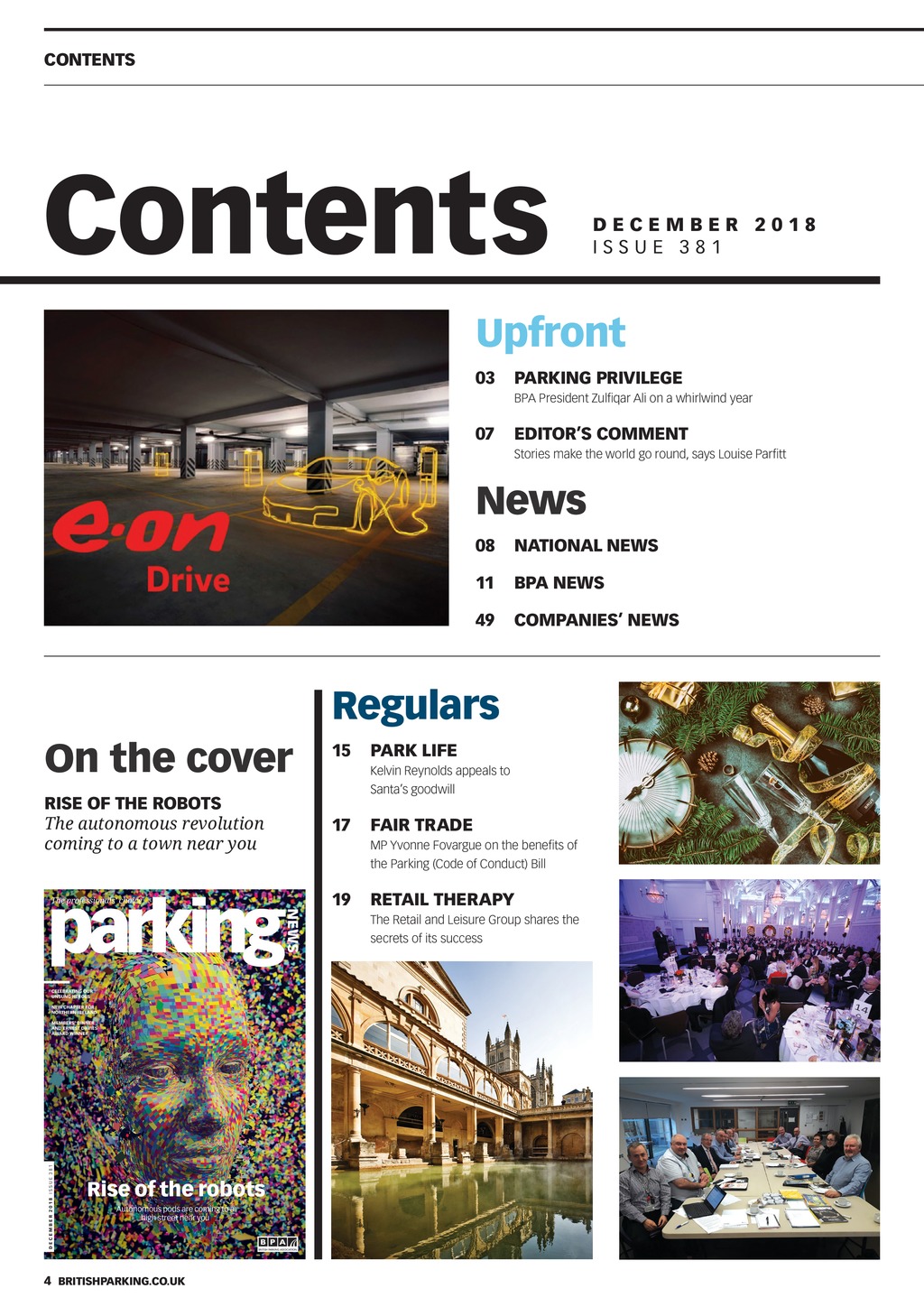 CONTENTS Contents decembe r 2 0 1 8 ISSUE 381 Upfront 03 Parking Privilege BPA President Zulfiqar Ali on a whirlwind year 07 EDITORS COMMENT Stories make the world go round, says Louise Parfitt News 08 National NEWS 11 BPA NEWS 49 COMPANIES NEWS Regulars On the cover 15 Park Life Rise of the Robots The autonomous revolution coming to a town near you 17 Fair trade Kelvin Reynolds appeals to Santas goodwill MP Yvonne Fovargue on the benefits of the Parking (Code of Conduct) Bill 19 Retail therapy The Retail and Leisure Group shares the secrets of its success 4 Britishparking.co.uk PNDec18 pp04-05 Contents.indd 4 26/11/2018 16:14
