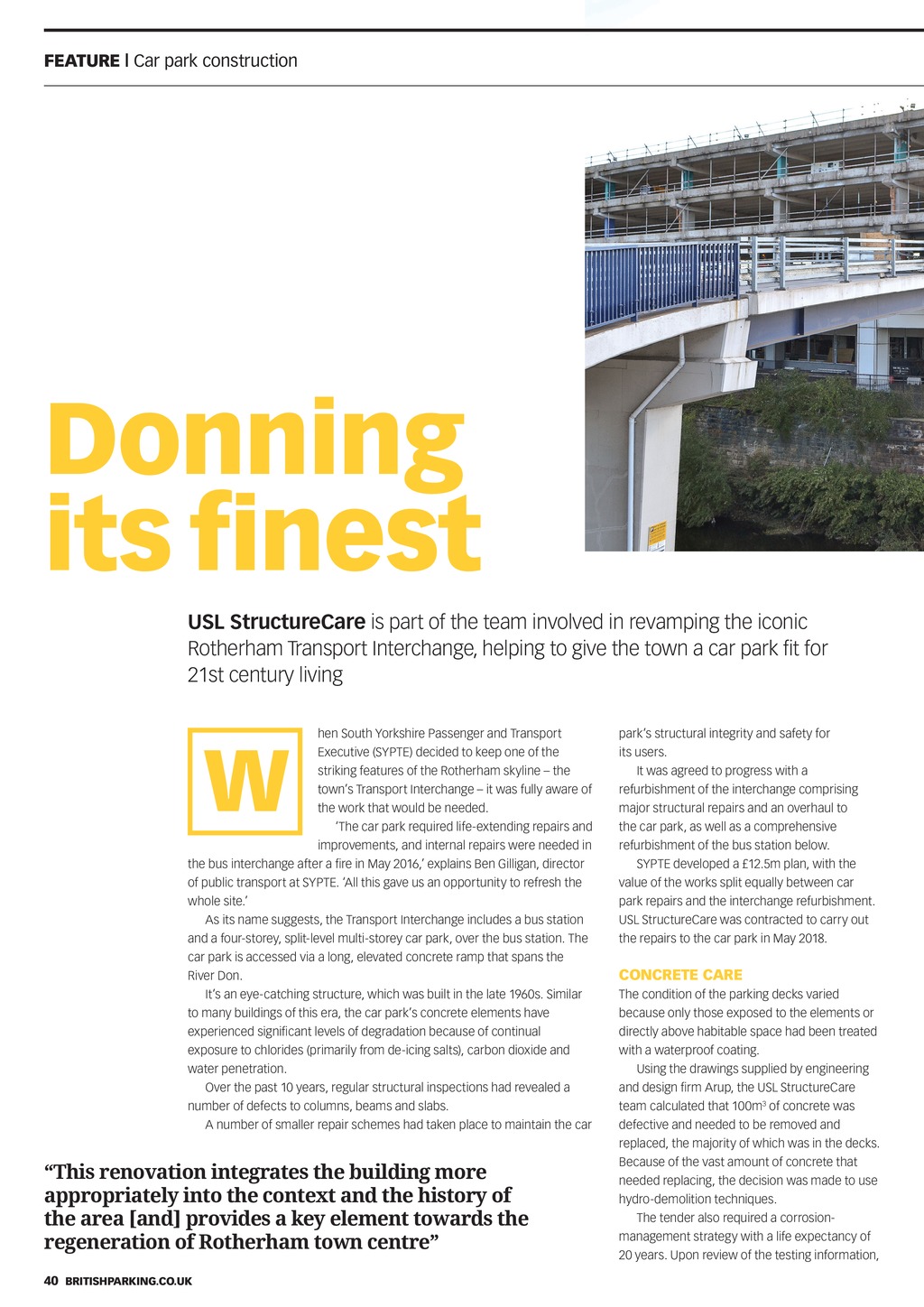 FEATURE Car park construction Donning its finest USL StructureCare is part of the team involved in revamping the iconic Rotherham Transport Interchange, helping to give the town a car park fit for 21st century living hen South Yorkshire Passenger and Transport Executive (SYPTE) decided to keep one of the striking features of the Rotherham skyline the towns Transport Interchange it was fully aware of the work that would be needed. The car park required life-extending repairs and improvements, and internal repairs were needed in the bus interchange after a fire in May 2016, explains Ben Gilligan, director of public transport at SYPTE. All this gave us an opportunity to refresh the whole site. As its name suggests, the Transport Interchange includes a bus station and a four-storey, split-level multi-storey car park, over the bus station. The car park is accessed via a long, elevated concrete ramp that spans the River Don. Its an eye-catching structure, which was built in the late 1960s. Similar to many buildings of this era, the car parks concrete elements have experienced significant levels of degradation because of continual exposure to chlorides (primarily from de-icing salts), carbon dioxide and water penetration. Over the past 10 years, regular structural inspections had revealed a number of defects to columns, beams and slabs. A number of smaller repair schemes had taken place to maintain the car W This renovation integrates the building more appropriately into the context and the history of the area [and] provides a key element towards the regeneration of Rotherham town centre parks structural integrity and safety for its users. It was agreed to progress with a refurbishment of the interchange comprising major structural repairs and an overhaul to the car park, as well as a comprehensive refurbishment of the bus station below. SYPTE developed a 12.5m plan, with the value of the works split equally between car park repairs and the interchange refurbishment. USL StructureCare was contracted to carry out the repairs to the car park in May 2018. CONCRETE CARE The condition of the parking decks varied because only those exposed to the elements or directly above habitable space had been treated with a waterproof coating. Using the drawings supplied by engineering and design firm Arup, the USL StructureCare team calculated that 100m3 of concrete was defective and needed to be removed and replaced, the majority of which was in the decks. Because of the vast amount of concrete that needed replacing, the decision was made to use hydro-demolition techniques. The tender also required a corrosionmanagement strategy with a life expectancy of 20 years. Upon review of the testing information, 40 Britishparking.co.uk PNDec18 pp40-41 Commercial Feature.indd 40 26/11/2018 16:26