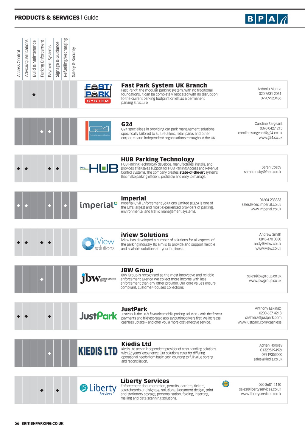 Safety & Security Refuelling/Recharging Signage & Guidance Payment Systems Parking Enforcement Build & Maintenance Advice/Qualifications Access Control PRoDuCTS & SERViCES Guide Fast Park System uk Branch u SYSTEM Fast Park, the modular parking system. With no traditional foundations, it can be completely relocated with no disruption to the current parking footprint or left as a permanent parking structure. g24 G24 specialises in providing car park management solutions specifically tailored to suit retailers, retail parks and other corporate and independent organisations throughout the UK. u u Antonio Manna 020 7631 2061 07909523486 Caroline Sargeant 0370 0427 215 caroline.sargeant@g24.co.uk www.g24.co.uk huB Parking Technology u u u u u u u HUB Parking Technology develops, manufactures, installs, and provides after-sales support for HUB Parking Access and Revenue Control Systems. The company creates state-of-the-art systems that make parking efficient, profitable and easy to manage. imperial u Imperial Civil Enforcement Solutions Limited (ICES) is one of the UKs largest and most experienced providers of parking, environmental and traffic management systems. iView Solutions u u iView has developed a number of solutions for all aspects of the parking industry. Its aim is to provide and support exible and scalable solutions for your business. u u Sarah Cosby sarah.cosby@faac.co.uk 01604 233333 sales@ices.imperial.co.uk www.imperial.co.uk Andrew Smith 0845 470 0880 andy@iview.co.uk www.iview.co.uk JBW group JBW Group is recognised as the most innovative and reliable enforcement agency. We collect more income with less enforcement than any other provider. Our core values ensure compliant, customer-focused collections. u JustPark u u JustPark is the UKs favourite mobile parking solution - with the fastest payments and highest-rated app. By putting drivers first, we increase cashless uptake and offer you a more cost-effective service. u kiedis Ltd Kiedis Ltd are an independent provider of cash handling solutions with 22 years experience. Our solutions cater for differing operational needs from basic cash counting to full value sorting and reconciliation. u Liberty Services u u Enforcement documentation, permits, carriers, tickets, scratchcards and signage solutions. Document design, print and stationery storage, personalisation, folding, inserting, mailing and data scanning solutions. sales@jbwgroup.co.uk www.jbwgroup.co.uk Anthony Eskinazi 0203 637 4218 cashless@justpark.com www.justpark.com/cashless Adrian Horsley 01329519492/ 07919353000 sales@kiedis.co.uk 020 8681 4110 sales@libertyservices.co.uk www.libertyservices.co.uk 56 BRiTiShPARkiNg.Co.uk PNDec18 pp54-59 PSG.indd 56 26/11/2018 16:48