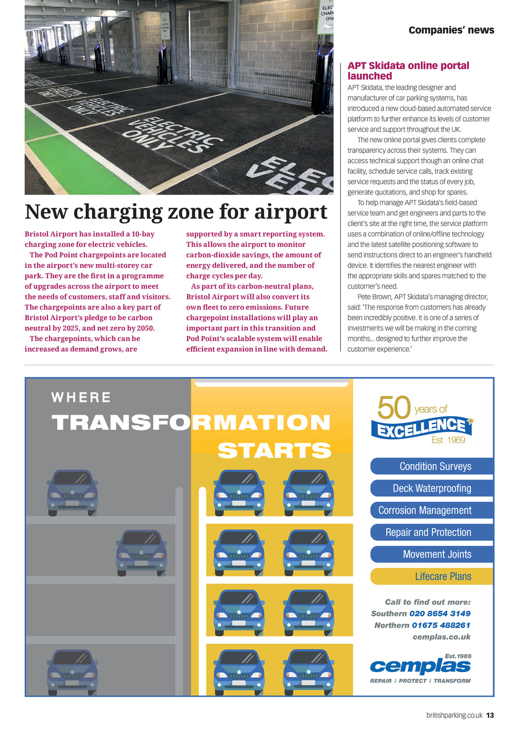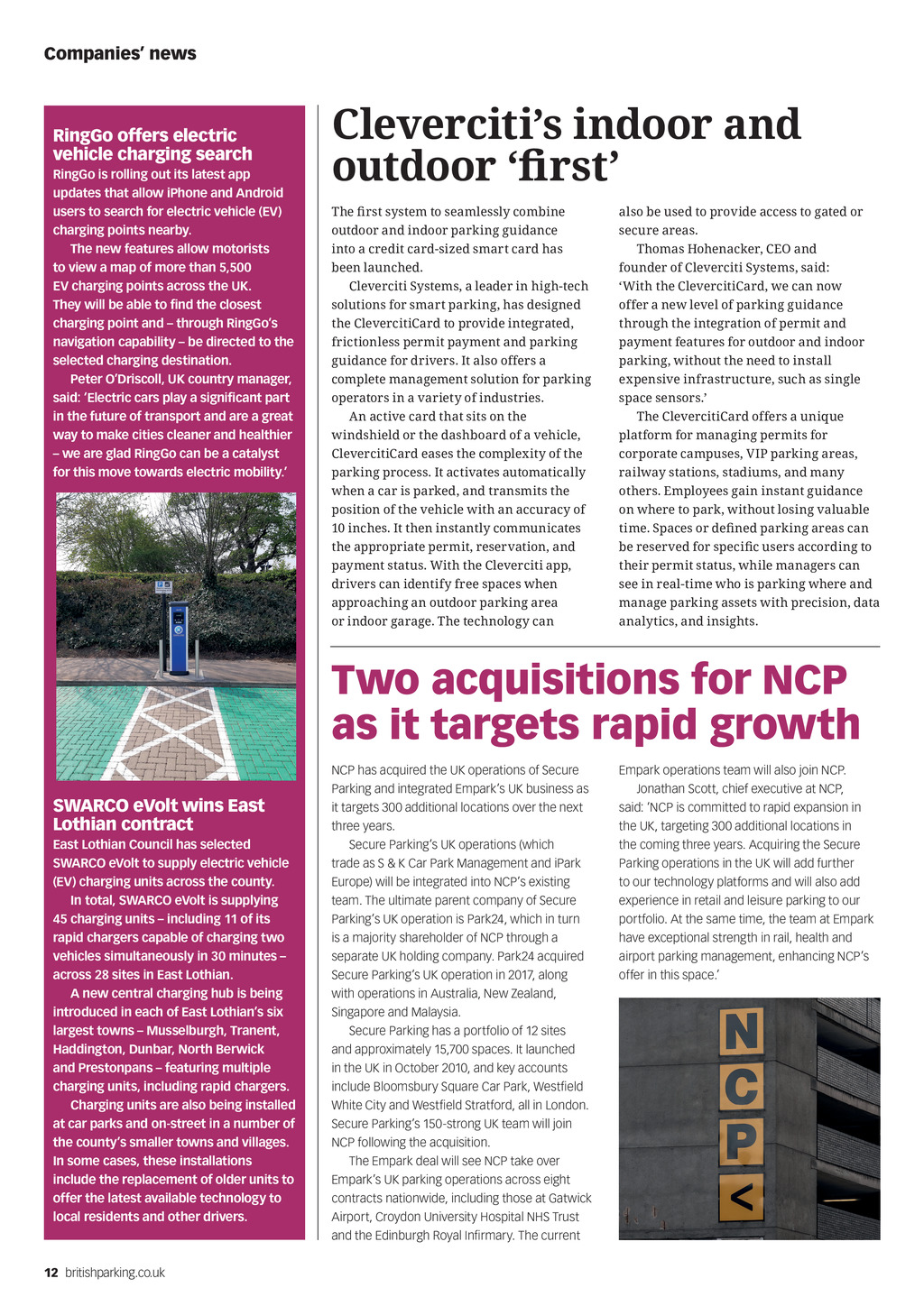 Companies news RingGo offers electric vehicle charging search RingGo is rolling out its latest app updates that allow iPhone and Android users to search for electric vehicle (EV) charging points nearby. The new features allow motorists to view a map of more than 5,500 EV charging points across the UK. They will be able to find the closest charging point and through RingGos navigation capability be directed to the selected charging destination. Peter ODriscoll, UK country manager, said: Electric cars play a significant part in the future of transport and are a great way to make cities cleaner and healthier we are glad RingGo can be a catalyst for this move towards electric mobility. Clevercitis indoor and outdoor first The first system to seamlessly combine outdoor and indoor parking guidance into a credit card-sized smart card has been launched. Cleverciti Systems, a leader in high-tech solutions for smart parking, has designed the ClevercitiCard to provide integrated, frictionless permit payment and parking guidance for drivers. It also offers a complete management solution for parking operators in a variety of industries. An active card that sits on the windshield or the dashboard of a vehicle, ClevercitiCard eases the complexity of the parking process. It activates automatically when a car is parked, and transmits the position of the vehicle with an accuracy of 10 inches. It then instantly communicates the appropriate permit, reservation, and payment status. With the Cleverciti app, drivers can identify free spaces when approaching an outdoor parking area or indoor garage. The technology can also be used to provide access to gated or secure areas. Thomas Hohenacker, CEO and founder of Cleverciti Systems, said: With the ClevercitiCard, we can now offer a new level of parking guidance through the integration of permit and payment features for outdoor and indoor parking, without the need to install expensive infrastructure, such as single space sensors. The ClevercitiCard offers a unique platform for managing permits for corporate campuses, VIP parking areas, railway stations, stadiums, and many others. Employees gain instant guidance on where to park, without losing valuable time. Spaces or defined parking areas can be reserved for specific users according to their permit status, while managers can see in real-time who is parking where and manage parking assets with precision, data analytics, and insights. Two acquisitions for NCP as it targets rapid growth SWARCO eVolt wins East Lothian contract East Lothian Council has selected SWARCO eVolt to supply electric vehicle (EV) charging units across the county. In total, SWARCO eVolt is supplying 45 charging units including 11 of its rapid chargers capable of charging two vehicles simultaneously in 30 minutes across 28 sites in East Lothian. A new central charging hub is being introduced in each of East Lothians six largest towns Musselburgh, Tranent, Haddington, Dunbar, North Berwick and Prestonpans featuring multiple charging units, including rapid chargers. Charging units are also being installed at car parks and on-street in a number of the countys smaller towns and villages. In some cases, these installations include the replacement of older units to offer the latest available technology to local residents and other drivers. NCP has acquired the UK operations of Secure Parking and integrated Emparks UK business as it targets 300 additional locations over the next three years. Secure Parkings UK operations (which trade as S & K Car Park Management and iPark Europe) will be integrated into NCPs existing team. The ultimate parent company of Secure Parkings UK operation is Park24, which in turn is a majority shareholder of NCP through a separate UK holding company. Park24 acquired Secure Parkings UK operation in 2017, along with operations in Australia, New Zealand, Singapore and Malaysia. Secure Parking has a portfolio of 12 sites and approximately 15,700 spaces. It launched in the UK in October 2010, and key accounts include Bloomsbury Square Car Park, Westfield White City and Westfield Stratford, all in London. Secure Parkings 150-strong UK team will join NCP following the acquisition. The Empark deal will see NCP take over Emparks UK parking operations across eight contracts nationwide, including those at Gatwick Airport, Croydon University Hospital NHS Trust and the Edinburgh Royal Infirmary. The current Empark operations team will also join NCP. Jonathan Scott, chief executive at NCP, said: NCP is committed to rapid expansion in the UK, targeting 300 additional locations in the coming three years. Acquiring the Secure Parking operations in the UK will add further to our technology platforms and will also add experience in retail and leisure parking to our portfolio. At the same time, the team at Empark have exceptional strength in rail, health and airport parking management, enhancing NCPs offer in this space. 12 britishparking.co.uk PN Sep19 pp10-13 Companies News.indd 12 22/08/2019 11:45