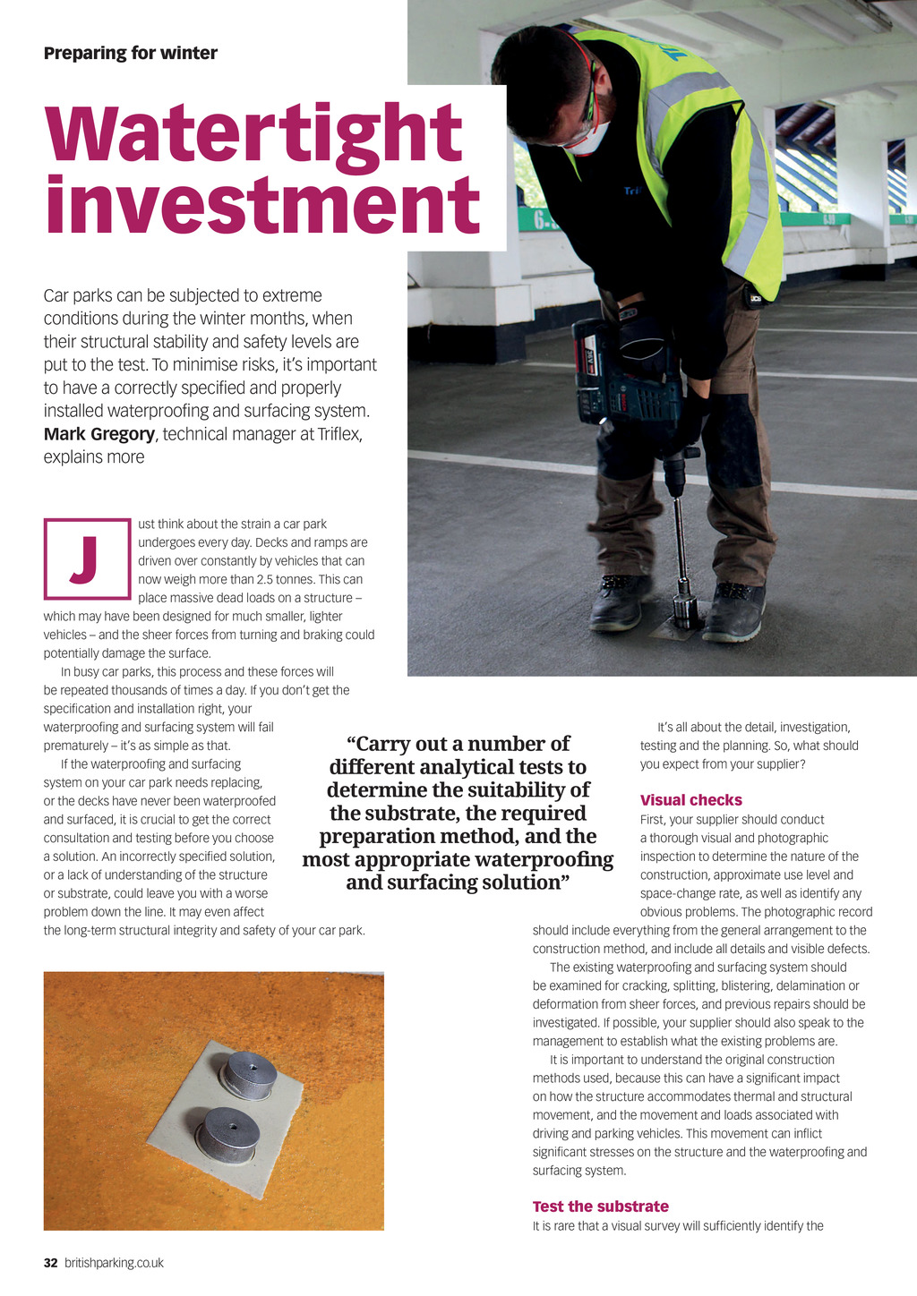Preparing for winter Watertight investment Car parks can be subjected to extreme conditions during the winter months, when their structural stability and safety levels are put to the test. To minimise risks, its important to have a correctly specified and properly installed waterproofing and surfacing system. Mark Gregory, technical manager at Triflex, explains more ust think about the strain a car park undergoes every day. Decks and ramps are driven over constantly by vehicles that can now weigh more than 2.5 tonnes. This can place massive dead loads on a structure which may have been designed for much smaller, lighter vehicles and the sheer forces from turning and braking could potentially damage the surface. In busy car parks, this process and these forces will be repeated thousands of times a day. If you dont get the specification and installation right, your waterproofing and surfacing system will fail prematurely its as simple as that. If the waterproofing and surfacing system on your car park needs replacing, or the decks have never been waterproofed and surfaced, it is crucial to get the correct consultation and testing before you choose a solution. An incorrectly specified solution, or a lack of understanding of the structure or substrate, could leave you with a worse problem down the line. It may even affect the long-term structural integrity and safety of your car park. J Carry out a number of different analytical tests to determine the suitability of the substrate, the required preparation method, and the most appropriate waterproofing and surfacing solution Its all about the detail, investigation, testing and the planning. So, what should you expect from your supplier? Visual checks First, your supplier should conduct a thorough visual and photographic inspection to determine the nature of the construction, approximate use level and space-change rate, as well as identify any obvious problems. The photographic record should include everything from the general arrangement to the construction method, and include all details and visible defects. The existing waterproofing and surfacing system should be examined for cracking, splitting, blistering, delamination or deformation from sheer forces, and previous repairs should be investigated. If possible, your supplier should also speak to the management to establish what the existing problems are. It is important to understand the original construction methods used, because this can have a significant impact on how the structure accommodates thermal and structural movement, and the movement and loads associated with driving and parking vehicles. This movement can inflict significant stresses on the structure and the waterproofing and surfacing system. Test the substrate It is rare that a visual survey will sufficiently identify the 32 britishparking.co.uk PN Oct19 pp32-33 Triflex Feature.indd 32 23/09/2019 14:00
