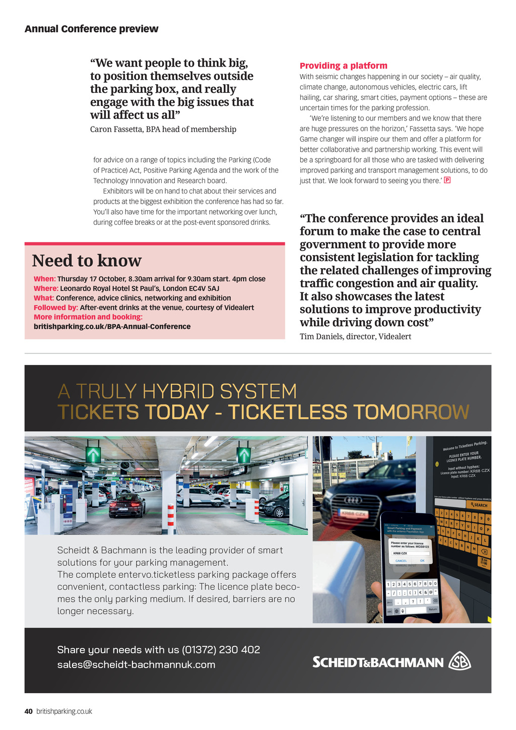 Annual Conference preview We want people to think big, to position themselves outside the parking box, and really engage with the big issues that will affect us all Caron Fassetta, BPA head of membership for advice on a range of topics including the Parking (Code of Practice) Act, Positive Parking Agenda and the work of the Technology Innovation and Research board. Exhibitors will be on hand to chat about their services and products at the biggest exhibition the conference has had so far. Youll also have time for the important networking over lunch, during coffee breaks or at the post-event sponsored drinks. Need to know When: Thursday 17 October, 8.30am arrival for 9.30am start. 4pm close Where: Leonardo Royal Hotel St Pauls, London EC4V 5AJ What: Conference, advice clinics, networking and exhibition Followed by: After-event drinks at the venue, courtesy of Videalert More information and booking: britishparking.co.uk/BPA-Annual-Conference Providing a platform With seismic changes happening in our society air quality, climate change, autonomous vehicles, electric cars, lift hailing, car sharing, smart cities, payment options these are uncertain times for the parking profession. Were listening to our members and we know that there are huge pressures on the horizon, Fassetta says. We hope Game changer will inspire our them and offer a platform for better collaborative and partnership working. This event will be a springboard for all those who are tasked with delivering improved parking and transport management solutions, to do just that. We look forward to seeing you there. The conference provides an ideal forum to make the case to central government to provide more consistent legislation for tackling the related challenges of improving trac congestion and air quality. It also showcases the latest solutions to improve productivity while driving down cost Tim Daniels, director, Videalert A TRULY HYBRID SYSTEM TICKETS TODAY - TICKETLESS TOMORROW Scheidt & Bachmann is the leading provider of smart solutions for your parking management. The complete entervo.ticketless parking package offers convenient, contactless parking: The licence plate becomes the only parking medium. If desired, barriers are no longer necessary. Share your needs with us (01372) 230 402 sales@scheidt-bachmannuk.com 40 britishparking.co.uk PN Oct19 pp38-40 Annual Conference.indd 40 23/09/2019 14:05