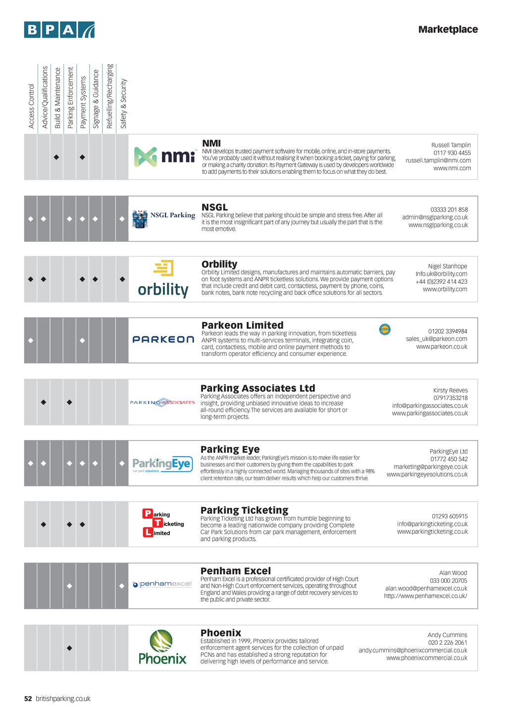 Safety & Security Refuelling/Recharging Signage & Guidance Payment Systems Parking Enforcement Build & Maintenance Advice/Qualifications Access Control Marketplace NMI u NMI develops trusted payment software for mobile, online, and in-store payments. Youve probably used it without realising it when booking a ticket, paying for parking, or making a charity donation. Its Payment Gateway is used by developers worldwide to add payments to their solutions enabling them to focus on what they do best. u NSGL u u u u u u u u u u u Orbility Limited designs, manufactures and maintains automatic barriers, pay on foot systems and ANPR ticketless solutions. We provide payment options that include credit and debit card, contactless, payment by phone, coins, bank notes, bank note recycling and back office solutions for all sectors. Parkeon Limited u Parking Associates Ltd u Parking Eye u u u u u u As the ANPR market-leader, ParkingEyes mission is to make life easier for businesses and their customers by giving them the capabilities to park effortlessly in a highly connected world. Managing thousands of sites with a 98% client retention rate, our team deliver results which help our customers thrive. Parking Ticketing u Parking Ticketing Ltd has grown from humble beginning to become a leading nationwide company providing Complete Car Park Solutions from car park management, enforcement and parking products. u u Penham Excel u u Penham Excel is a professional certificated provider of High Court and Non-High Court enforcement services, operating throughout England and Wales providing a range of debt recovery services to the public and private sector. Phoenix u Kirsty Reeves 07917353218 info@parkingassociates.co.uk www.parkingassociates.co.uk Parking Associates offers an independent perspective and insight, providing unbiased innovative ideas to increase all-round efficiency.The services are available for short or long-term projects. u Established in 1999, Phoenix provides tailored enforcement agent services for the collection of unpaid PCNs and has established a strong reputation for delivering high levels of performance and service. Nigel Stanhope Info.uk@orbility.com +44 (0)2392 414 423 www.orbility.com 01202 3394984 sales_uk@parkeon.com www.parkeon.co.uk Parkeon leads the way in parking innovation, from ticketless ANPR systems to multi-services terminals, integrating coin, card, contactless, mobile and online payment methods to transform operator efficiency and consumer experience. u 03333 201 858 admin@nsglparking.co.uk www.nsglparking.co.uk NSGL Parking believe that parking should be simple and stress free. After all it is the most insignificant part of any journey but usually the part that is the most emotive. Orbility Russell Tamplin 0117 930 4455 russell.tamplin@nmi.com www.nmi.com ParkingEye Ltd 01772 450 542 marketing@parkingeye.co.uk www.parkingeyesolutions.co.uk 01293 605915 info@parkingticketing.co.uk www.parkingticketing.co.uk Alan Wood 033 000 20705 alan.wood@penhamexcel.co.uk http://www.penhamexcel.co.uk/ Andy Cummins 020 2 226 2061 andy.cummins@phoenixcommercial.co.uk www.phoenixcommercial.co.uk 52 britishparking.co.uk PNOctober19 pp49-54 Marketplace.indd 52 23/09/2019 14:13