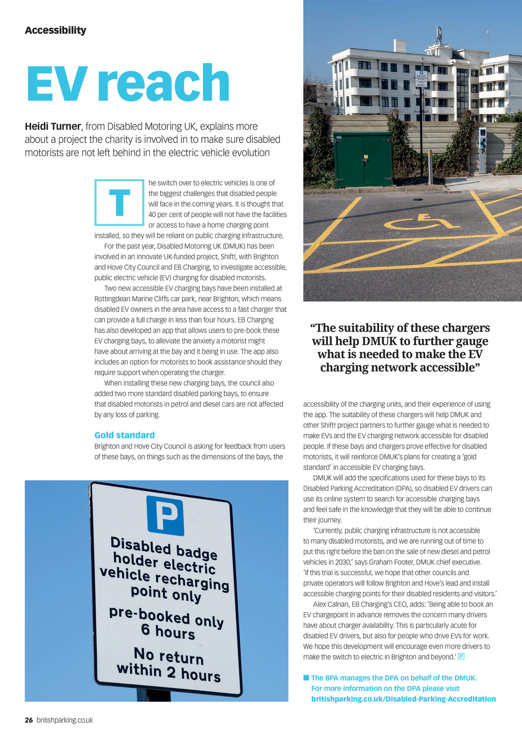 Accessibility EV reach Heidi Turner, from Disabled Motoring UK, explains more about a project the charity is involved in to make sure disabled motorists are not left behind in the electric vehicle evolution he switch over to electric vehicles is one of the biggest challenges that disabled people will face in the coming years. It is thought that 40 per cent of people will not have the facilities or access to have a home charging point installed, so they will be reliant on public charging infrastructure. For the past year, Disabled Motoring UK (DMUK) has been involved in an Innovate UK-funded project, Shift!, with Brighton and Hove City Council and EB Charging, to investigate accessible, public electric vehicle (EV) charging for disabled motorists. Two new accessible EV charging bays have been installed at Rottingdean Marine Cliffs car park, near Brighton, which means disabled EV owners in the area have access to a fast charger that can provide a full charge in less than four hours. EB Charging has also developed an app that allows users to pre-book these EV charging bays, to alleviate the anxiety a motorist might have about arriving at the bay and it being in use. The app also includes an option for motorists to book assistance should they require support when operating the charger. When installing these new charging bays, the council also added two more standard disabled parking bays, to ensure that disabled motorists in petrol and diesel cars are not affected by any loss of parking. T Gold standard Brighton and Hove City Council is asking for feedback from users of these bays, on things such as the dimensions of the bays, the The suitability of these chargers will help DMUK to further gauge what is needed to make the EV charging network accessible accessibility of the charging units, and their experience of using the app. The suitability of these chargers will help DMUK and other Shift! project partners to further gauge what is needed to make EVs and the EV charging network accessible for disabled people. If these bays and chargers prove effective for disabled motorists, it will reinforce DMUKs plans for creating a gold standard in accessible EV charging bays. DMUK will add the specifications used for these bays to its Disabled Parking Accreditation (DPA), so disabled EV drivers can use its online system to search for accessible charging bays and feel safe in the knowledge that they will be able to continue their journey. Currently, public charging infrastructure is not accessible to many disabled motorists, and we are running out of time to put this right before the ban on the sale of new diesel and petrol vehicles in 2030, says Graham Footer, DMUK chief executive. If this trial is successful, we hope that other councils and private operators will follow Brighton and Hoves lead and install accessible charging points for their disabled residents and visitors. Alex Calnan, EB Chargings CEO, adds: Being able to book an EV chargepoint in advance removes the concern many drivers have about charger availability. This is particularly acute for disabled EV drivers, but also for people who drive EVs for work. We hope this development will encourage even more drivers to make the switch to electric in Brighton and beyond. The BPA manages the DPA on behalf of the DMUK. For more information on the DPA please visit britishparking.co.uk/Disabled-Parking-Accreditation 26 britishparking.co.uk PN May 2022 pp26-27 DMUK.indd 26 21/04/2022 11:25