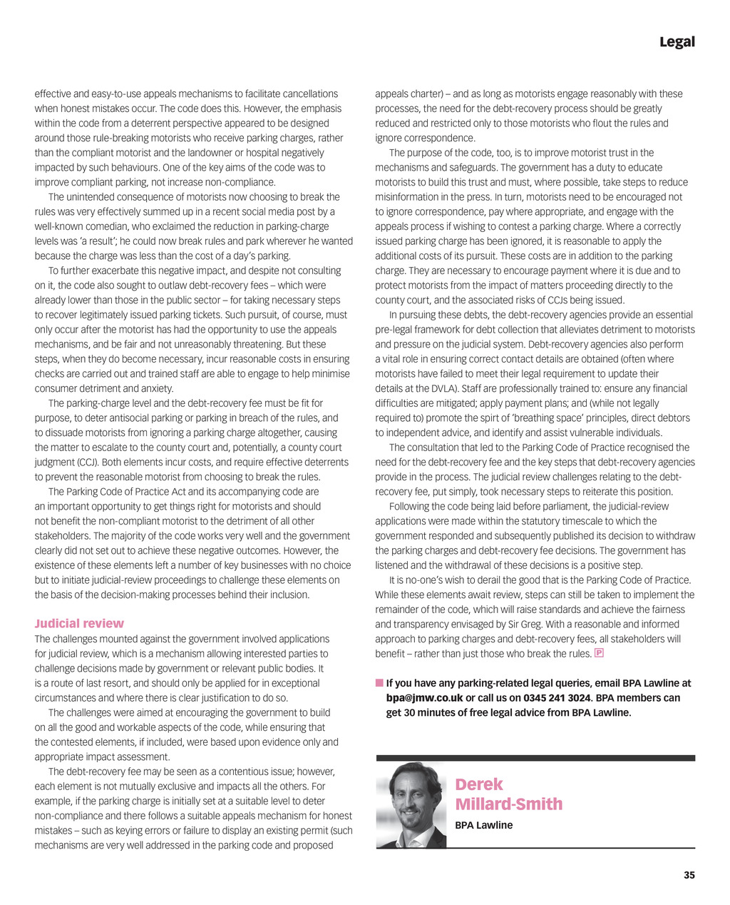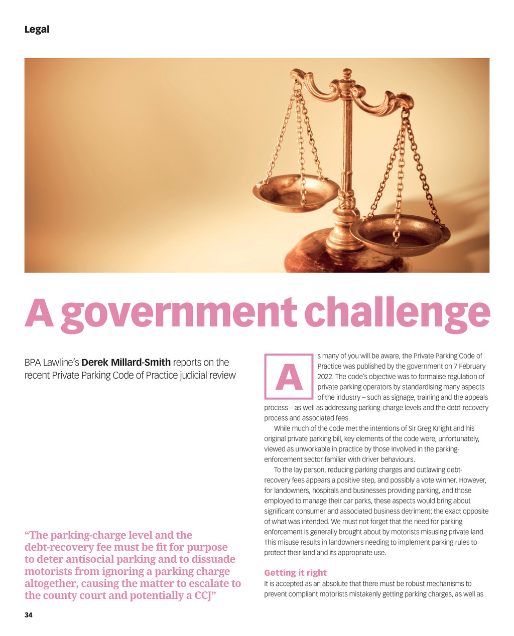 Legal A government challenge BPA Lawlines Derek Millard-Smith reports on the recent Private Parking Code of Practice judicial review The parking-charge level and the debt-recovery fee must be fit for purpose to deter antisocial parking and to dissuade motorists from ignoring a parking charge altogether, causing the matter to escalate to the county court and potentially a CCJ s many of you will be aware, the Private Parking Code of Practice was published by the government on 7 February 2022. The codes objective was to formalise regulation of private parking operators by standardising many aspects of the industry such as signage, training and the appeals process as well as addressing parking-charge levels and the debt-recovery process and associated fees. While much of the code met the intentions of Sir Greg Knight and his original private parking bill, key elements of the code were, unfortunately, viewed as unworkable in practice by those involved in the parkingenforcement sector familiar with driver behaviours. To the lay person, reducing parking charges and outlawing debtrecovery fees appears a positive step, and possibly a vote winner. However, for landowners, hospitals and businesses providing parking, and those employed to manage their car parks, these aspects would bring about significant consumer and associated business detriment: the exact opposite of what was intended. We must not forget that the need for parking enforcement is generally brought about by motorists misusing private land. This misuse results in landowners needing to implement parking rules to protect their land and its appropriate use. A Getting it right It is accepted as an absolute that there must be robust mechanisms to prevent compliant motorists mistakenly getting parking charges, as well as 34 PN July 2022 pp34-35 Legal.indd 34 27/06/2022 12:57