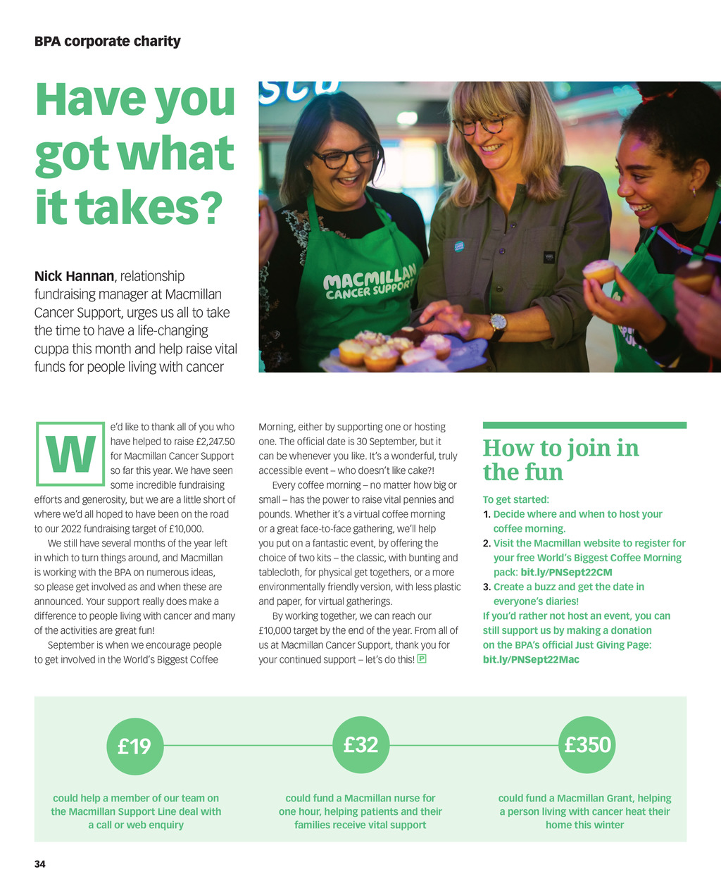 BPA corporate charity Have you got what it takes? Nick Hannan, relationship fundraising manager at Macmillan Cancer Support, urges us all to take the time to have a life-changing cuppa this month and help raise vital funds for people living with cancer ed like to thank all of you who have helped to raise 2,247.50 for Macmillan Cancer Support so far this year. We have seen some incredible fundraising efforts and generosity, but we are a little short of where wed all hoped to have been on the road to our 2022 fundraising target of 10,000. We still have several months of the year left in which to turn things around, and Macmillan is working with the BPA on numerous ideas, so please get involved as and when these are announced. Your support really does make a difference to people living with cancer and many of the activities are great fun! September is when we encourage people to get involved in the Worlds Biggest Coffee Morning, either by supporting one or hosting one. The official date is 30 September, but it can be whenever you like. Its a wonderful, truly accessible event who doesnt like cake?! Every coffee morning no matter how big or small has the power to raise vital pennies and pounds. Whether its a virtual coffee morning or a great face-to-face gathering, well help you put on a fantastic event, by offering the choice of two kits the classic, with bunting and tablecloth, for physical get togethers, or a more environmentally friendly version, with less plastic and paper, for virtual gatherings. By working together, we can reach our 10,000 target by the end of the year. From all of us at Macmillan Cancer Support, thank you for your continued support lets do this! 19 32 350 could help a member of our team on the Macmillan Support Line deal with a call or web enquiry could fund a Macmillan nurse for one hour, helping patients and their families receive vital support could fund a Macmillan Grant, helping a person living with cancer heat their home this winter W How to join in the fun To get started: 1. Decide where and when to host your coffee morning. 2. Visit the Macmillan website to register for your free Worlds Biggest Coffee Morning pack: bit.ly/PNSept22CM 3. Create a buzz and get the date in everyones diaries! If youd rather not host an event, you can still support us by making a donation on the BPAs official Just Giving Page: bit.ly/PNSept22Mac 34 PN Sept 2022 pp34-35 macmillan.indd 34 22/08/2022 10:02