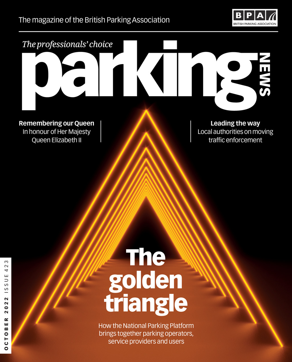 The magazine of the British Parking Association OCTOBER 2022 ISSUE 423 Remembering our Queen In honour of Her Majesty Queen Elizabeth II PN Oct 2022 pp01 Cover.indd 1 Leading the way Local authorities on moving traffic enforcement The golden triangle How the National Parking Platform brings together parking operators, service providers and users 23/09/2022 11:06