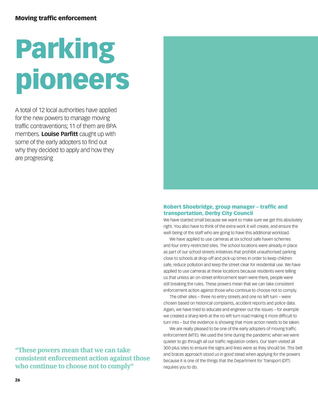 Moving traffic enforcement Parking pioneers A total of 12 local authorities have applied for the new powers to manage moving traffic contraventions; 11 of them are BPA members. Louise Parfitt caught up with some of the early adopters to find out why they decided to apply and how they are progressing Robert Shoebridge, group manager traffic and transportation, Derby City Council These powers mean that we can take consistent enforcement action against those who continue to choose not to comply We have started small because we want to make sure we get this absolutely right. You also have to think of the extra work it will create, and ensure the well-being of the staff who are going to have this additional workload. We have applied to use cameras at six school safe haven schemes and four entry-restricted sites. The school locations were already in place as part of our school streets initiatives that prohibit unauthorised parking close to schools at drop-off and pick-up times in order to keep children safe, reduce pollution and keep the street clear for residential use. We have applied to use cameras at these locations because residents were telling us that unless an on-street enforcement team were there, people were still breaking the rules. These powers mean that we can take consistent enforcement action against those who continue to choose not to comply. The other sites three no entry streets and one no left turn were chosen based on historical complaints, accident reports and police data. Again, we have tried to educate and engineer out the issues for example we created a sharp kerb at the no left turn road making it more difficult to turn into but the evidence is showing that more action needs to be taken. We are really pleased to be one of the early adopters of moving traffic enforcement (MTE). We used the time during the pandemic when we were quieter to go through all our traffic regulation orders. Our team visited all 300-plus sites to ensure the signs and lines were as they should be. This belt and braces approach stood us in good stead when applying for the powers because it is one of the things that the Department for Transport (DfT) requires you to do. 26 PN Oct 2022 pp26-31 MTE.indd 26 23/09/2022 11:40