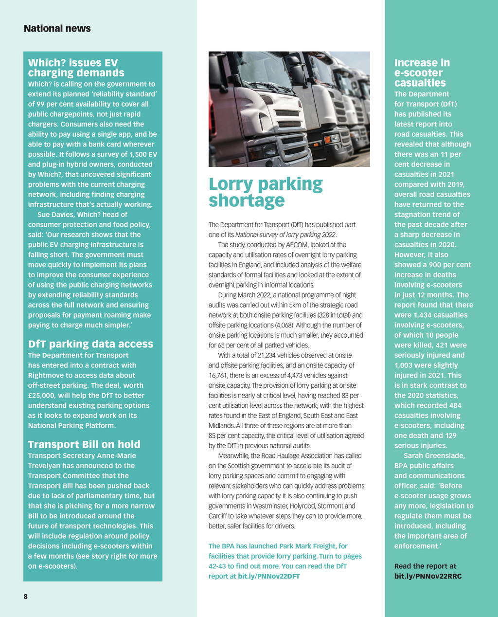National news Increase in e-scooter casualties Which? issues EV charging demands Which? is calling on the government to extend its planned reliability standard of 99 per cent availability to cover all public chargepoints, not just rapid chargers. Consumers also need the ability to pay using a single app, and be able to pay with a bank card wherever possible. It follows a survey of 1,500 EV and plug-in hybrid owners, conducted by Which?, that uncovered significant problems with the current charging network, including finding charging infrastructure thats actually working. Sue Davies, Which? head of consumer protection and food policy, said: Our research shows that the public EV charging infrastructure is falling short. The government must move quickly to implement its plans to improve the consumer experience of using the public charging networks by extending reliability standards across the full network and ensuring proposals for payment roaming make paying to charge much simpler. DfT parking data access The Department for Transport has entered into a contract with Rightmove to access data about off-street parking. The deal, worth 25,000, will help the DfT to better understand existing parking options as it looks to expand work on its National Parking Platform. Transport Bill on hold Transport Secretary Anne-Marie Trevelyan has announced to the Transport Committee that the Transport Bill has been pushed back due to lack of parliamentary time, but that she is pitching for a more narrow Bill to be introduced around the future of transport technologies. This will include regulation around policy decisions including e-scooters within a few months (see story right for more on e-scooters). Lorry parking shortage The Department for Transport (DfT) has published part one of its National survey of lorry parking 2022. The study, conducted by AECOM, looked at the capacity and utilisation rates of overnight lorry parking facilities in England, and included analysis of the welfare standards of formal facilities and looked at the extent of overnight parking in informal locations. During March 2022, a national programme of night audits was carried out within 5km of the strategic road network at both onsite parking facilities (328 in total) and offsite parking locations (4,068). Although the number of onsite parking locations is much smaller, they accounted for 65 per cent of all parked vehicles. With a total of 21,234 vehicles observed at onsite and offsite parking facilities, and an onsite capacity of 16,761, there is an excess of 4,473 vehicles against onsite capacity. The provision of lorry parking at onsite facilities is nearly at critical level, having reached 83 per cent utilisation level across the network, with the highest rates found in the East of England, South East and East Midlands. All three of these regions are at more than 85 per cent capacity, the critical level of utilisation agreed by the DfT in previous national audits. Meanwhile, the Road Haulage Association has called on the Scottish government to accelerate its audit of lorry parking spaces and commit to engaging with relevant stakeholders who can quickly address problems with lorry parking capacity. It is also continuing to push governments in Westminster, Holyrood, Stormont and Cardiff to take whatever steps they can to provide more, better, safer facilities for drivers. The BPA has launched Park Mark Freight, for facilities that provide lorry parking. Turn to pages 42-43 to find out more. You can read the DfT report at bit.ly/PNNov22DFT The Department for Transport (DfT) has published its latest report into road casualties. This revealed that although there was an 11 per cent decrease in casualties in 2021 compared with 2019, overall road casualties have returned to the stagnation trend of the past decade after a sharp decrease in casualties in 2020. However, it also showed a 900 per cent increase in deaths involving e-scooters in just 12 months. The report found that there were 1,434 casualties involving e-scooters, of which 10 people were killed, 421 were seriously injured and 1,003 were slightly injured in 2021. This is in stark contrast to the 2020 statistics, which recorded 484 casualties involving e-scooters, including one death and 129 serious injuries. Sarah Greenslade, BPA public affairs and communications officer, said: Before e-scooter usage grows any more, legislation to regulate them must be introduced, including the important area of enforcement. Read the report at bit.ly/PNNov22RRC 8 PN Nov 2022 pp08-09 National News.indd 8 26/10/2022 16:19