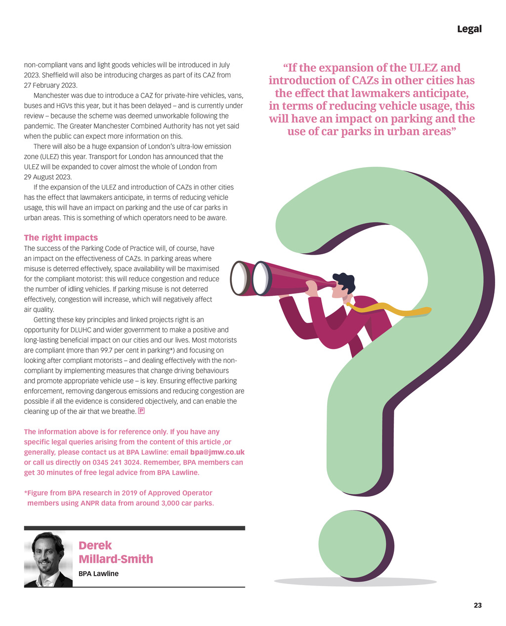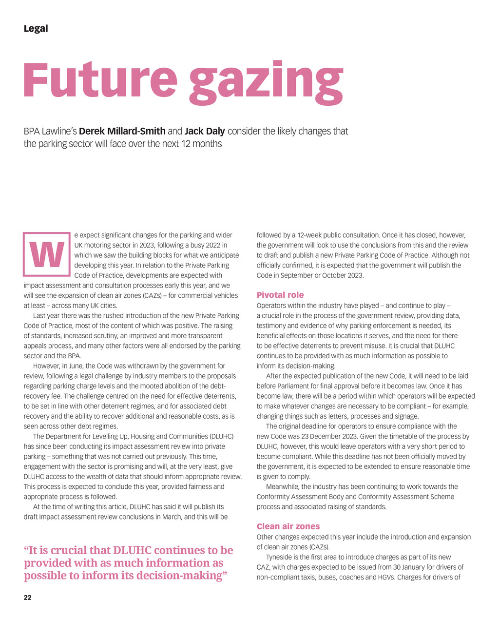 Legal Future gazing BPA Lawlines Derek Millard-Smith and Jack Daly consider the likely changes that the parking sector will face over the next 12 months e expect significant changes for the parking and wider UK motoring sector in 2023, following a busy 2022 in which we saw the building blocks for what we anticipate developing this year. In relation to the Private Parking Code of Practice, developments are expected with impact assessment and consultation processes early this year, and we will see the expansion of clean air zones (CAZs) for commercial vehicles at least across many UK cities. Last year there was the rushed introduction of the new Private Parking Code of Practice, most of the content of which was positive. The raising of standards, increased scrutiny, an improved and more transparent appeals process, and many other factors were all endorsed by the parking sector and the BPA. However, in June, the Code was withdrawn by the government for review, following a legal challenge by industry members to the proposals regarding parking charge levels and the mooted abolition of the debtrecovery fee. The challenge centred on the need for effective deterrents, to be set in line with other deterrent regimes, and for associated debt recovery and the ability to recover additional and reasonable costs, as is seen across other debt regimes. The Department for Levelling Up, Housing and Communities (DLUHC) has since been conducting its impact assessment review into private parking something that was not carried out previously. This time, engagement with the sector is promising and will, at the very least, give DLUHC access to the wealth of data that should inform appropriate review. This process is expected to conclude this year, provided fairness and appropriate process is followed. At the time of writing this article, DLUHC has said it will publish its draft impact assessment review conclusions in March, and this will be W followed by a 12-week public consultation. Once it has closed, however, the government will look to use the conclusions from this and the review to draft and publish a new Private Parking Code of Practice. Although not officially confirmed, it is expected that the government will publish the Code in September or October 2023. Pivotal role Operators within the industry have played and continue to play a crucial role in the process of the government review, providing data, testimony and evidence of why parking enforcement is needed, its beneficial effects on those locations it serves, and the need for there to be effective deterrents to prevent misuse. It is crucial that DLUHC continues to be provided with as much information as possible to inform its decision-making. After the expected publication of the new Code, it will need to be laid before Parliament for final approval before it becomes law. Once it has become law, there will be a period within which operators will be expected to make whatever changes are necessary to be compliant for example, changing things such as letters, processes and signage. The original deadline for operators to ensure compliance with the new Code was 23 December 2023. Given the timetable of the process by DLUHC, however, this would leave operators with a very short period to become compliant. While this deadline has not been officially moved by the government, it is expected to be extended to ensure reasonable time is given to comply. Meanwhile, the industry has been continuing to work towards the Conformity Assessment Body and Conformity Assessment Scheme process and associated raising of standards. Clean air zones It is crucial that DLUHC continues to be provided with as much information as possible to inform its decision-making 22 Other changes expected this year include the introduction and expansion of clean air zones (CAZs). Tyneside is the first area to introduce charges as part of its new CAZ, with charges expected to be issued from 30 January for drivers of non-compliant taxis, buses, coaches and HGVs. Charges for drivers of