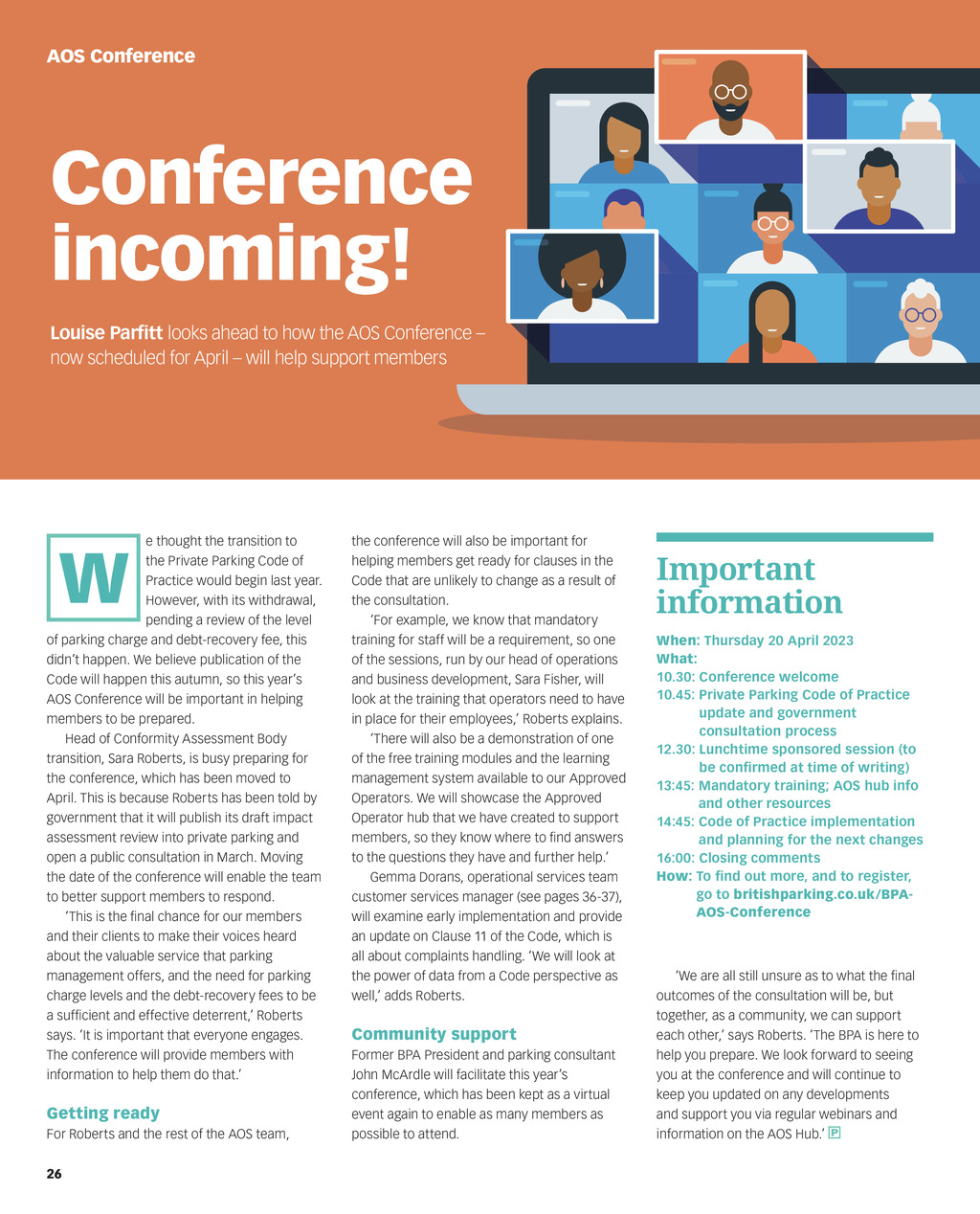 AOS Conference Conference incoming! Louise Parfitt looks ahead to how the AOS Conference now scheduled for April will help support members e thought the transition to the Private Parking Code of Practice would begin last year. However, with its withdrawal, pending a review of the level of parking charge and debt-recovery fee, this didnt happen. We believe publication of the Code will happen this autumn, so this years AOS Conference will be important in helping members to be prepared. Head of Conformity Assessment Body transition, Sara Roberts, is busy preparing for the conference, which has been moved to April. This is because Roberts has been told by government that it will publish its draft impact assessment review into private parking and open a public consultation in March. Moving the date of the conference will enable the team to better support members to respond. This is the final chance for our members and their clients to make their voices heard about the valuable service that parking management offers, and the need for parking charge levels and the debt-recovery fees to be a sufficient and effective deterrent, Roberts says. It is important that everyone engages. The conference will provide members with information to help them do that. W Getting ready For Roberts and the rest of the AOS team, 26 the conference will also be important for helping members get ready for clauses in the Code that are unlikely to change as a result of the consultation. For example, we know that mandatory training for staff will be a requirement, so one of the sessions, run by our head of operations and business development, Sara Fisher, will look at the training that operators need to have in place for their employees, Roberts explains. There will also be a demonstration of one of the free training modules and the learning management system available to our Approved Operators. We will showcase the Approved Operator hub that we have created to support members, so they know where to find answers to the questions they have and further help. Gemma Dorans, operational services team customer services manager (see pages 36-37), will examine early implementation and provide an update on Clause 11 of the Code, which is all about complaints handling. We will look at the power of data from a Code perspective as well, adds Roberts. Community support Former BPA President and parking consultant John McArdle will facilitate this years conference, which has been kept as a virtual event again to enable as many members as possible to attend. Important information When: Thursday 20 April 2023 What: 10.30: Conference welcome 10.45: Private Parking Code of Practice update and government consultation process 12.30: Lunchtime sponsored session (to be confirmed at time of writing) 13:45: M andatory training; AOS hub info and other resources 14:45: C ode of Practice implementation and planning for the next changes 16:00: Closing comments How: To find out more, and to register, go to britishparking.co.uk/BPAAOS-Conference We are all still unsure as to what the final outcomes of the consultation will be, but together, as a community, we can support each other, says Roberts. The BPA is here to help you prepare. We look forward to seeing you at the conference and will continue to keep you updated on any developments and support you via regular webinars and information on the AOS Hub.