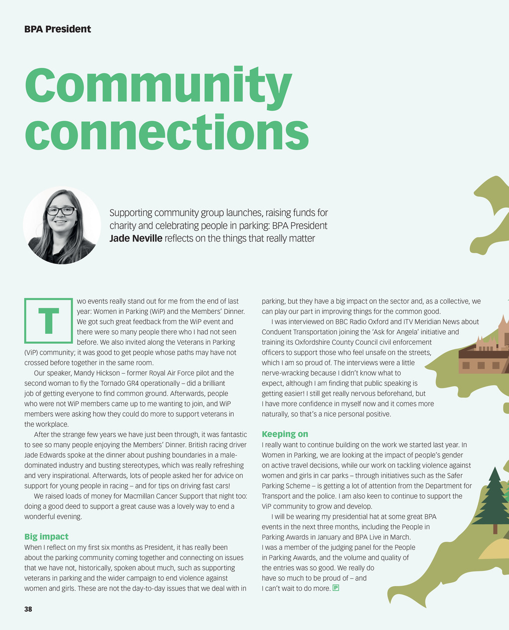 BPA President Community connections Supporting community group launches, raising funds for charity and celebrating people in parking: BPA President Jade Neville reflects on the things that really matter wo events really stand out for me from the end of last year: Women in Parking (WiP) and the Members Dinner. We got such great feedback from the WiP event and there were so many people there who I had not seen before. We also invited along the Veterans in Parking (ViP) community; it was good to get people whose paths may have not crossed before together in the same room. Our speaker, Mandy Hickson former Royal Air Force pilot and the second woman to fly the Tornado GR4 operationally did a brilliant job of getting everyone to find common ground. Afterwards, people who were not WiP members came up to me wanting to join, and WiP members were asking how they could do more to support veterans in the workplace. After the strange few years we have just been through, it was fantastic to see so many people enjoying the Members Dinner. British racing driver Jade Edwards spoke at the dinner about pushing boundaries in a maledominated industry and busting stereotypes, which was really refreshing and very inspirational. Afterwards, lots of people asked her for advice on support for young people in racing and for tips on driving fast cars! We raised loads of money for Macmillan Cancer Support that night too: doing a good deed to support a great cause was a lovely way to end a wonderful evening. T Big impact When I reflect on my first six months as President, it has really been about the parking community coming together and connecting on issues that we have not, historically, spoken about much, such as supporting veterans in parking and the wider campaign to end violence against women and girls. These are not the day-to-day issues that we deal with in 38 parking, but they have a big impact on the sector and, as a collective, we can play our part in improving things for the common good. I was interviewed on BBC Radio Oxford and ITV Meridian News about Conduent Transportation joining the Ask for Angela initiative and training its Oxfordshire County Council civil enforcement officers to support those who feel unsafe on the streets, which I am so proud of. The interviews were a little nerve-wracking because I didnt know what to expect, although I am finding that public speaking is getting easier! I still get really nervous beforehand, but I have more confidence in myself now and it comes more naturally, so thats a nice personal positive. Keeping on I really want to continue building on the work we started last year. In Women in Parking, we are looking at the impact of peoples gender on active travel decisions, while our work on tackling violence against women and girls in car parks through initiatives such as the Safer Parking Scheme is getting a lot of attention from the Department for Transport and the police. I am also keen to continue to support the ViP community to grow and develop. I will be wearing my presidential hat at some great BPA events in the next three months, including the People in Parking Awards in January and BPA Live in March. I was a member of the judging panel for the People in Parking Awards, and the volume and quality of the entries was so good. We really do have so much to be proud of and I cant wait to do more.
