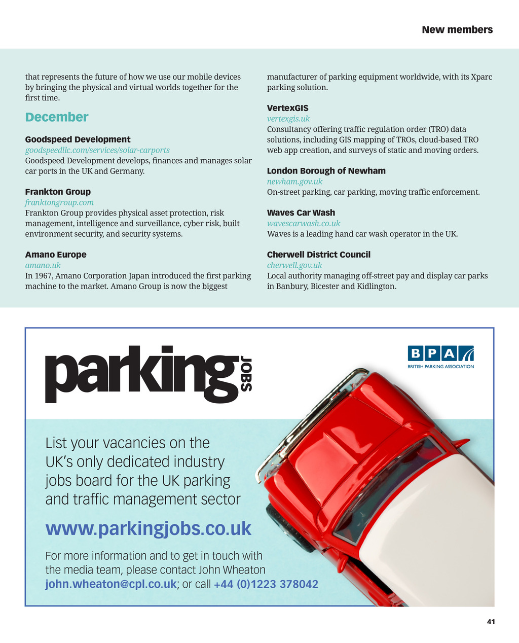 New members A warm to you! Welcome welcome Meet the organisations that joined the BPA in October, November and December 2022 Peter Guest, European editor for Parking Today October and former BPA President, reports on the recent GreenPoint Partners Parking Industry Exhibition, held in Reno, Nevada greenpointpartners.com GreenPoint has brought together the disparate worlds of real assets and technology, allowing it to anticipate trends and invest in the digital and physical assets underpinning the places of tomorrow. November Verlingue verlingue.co.uk Insurance and employee benefits broker, specialising in commercial and corporate insurance, employee benefits and trade credit. Empira National Motorcyclists Council uknmc.org National organisation representing a range of motorcyclingrelated groups. The Parking Consultancy theparkingconsultancy.com Whether you need to find a solution to your car parking shortages, increase your revenue, navigate a site redevelopment or improve sustainable travel for your staff, The Parking Consultancy team has the answer. empira.co.uk Enforcement agents for local authority and private land. Key Parking UK keyparkinguk.com Pay and display enforcement according to clients requirements. Shared Parking Services Richmond and Wandsworth Councils richmondandwandsworth.gov.uk Local authorities managing parking enforcement. UK Parking Management ukparkingmanagement.co.uk Private sector parking management (has not started trading yet). Sure Parking Tytonical Parkway Signalling tytonical.com Tytonical offers ANPR camera software licences for parking management, enforcement and barrier control. parkwaysignalling.com/services Parkway Signalling offers parking solutions using a mobile app called Pay-N-Park to connect people who have a parking space to rent and motorists who need a space. sureparking.co.uk Airport meet and greet company. Anpriot anpriot.com Anpriot has developed an internet-based software platform and associated hardware that delivers PAYG and account-based parking. Smart Transport Hub smartransport.co.uk A transport planning, traffic engineering and parking consultancy, offering parking design, traffic orders, policy and enforcement, urban design and data monitoring services. Hambury Tilmond hamburytilmond.co.uk Civil enforcement for the collection of local authority debt, soon to include parking debt too. 40 Hara Media haramedia.co.uk Hara Media has developed Jaran, a radical piece of technology