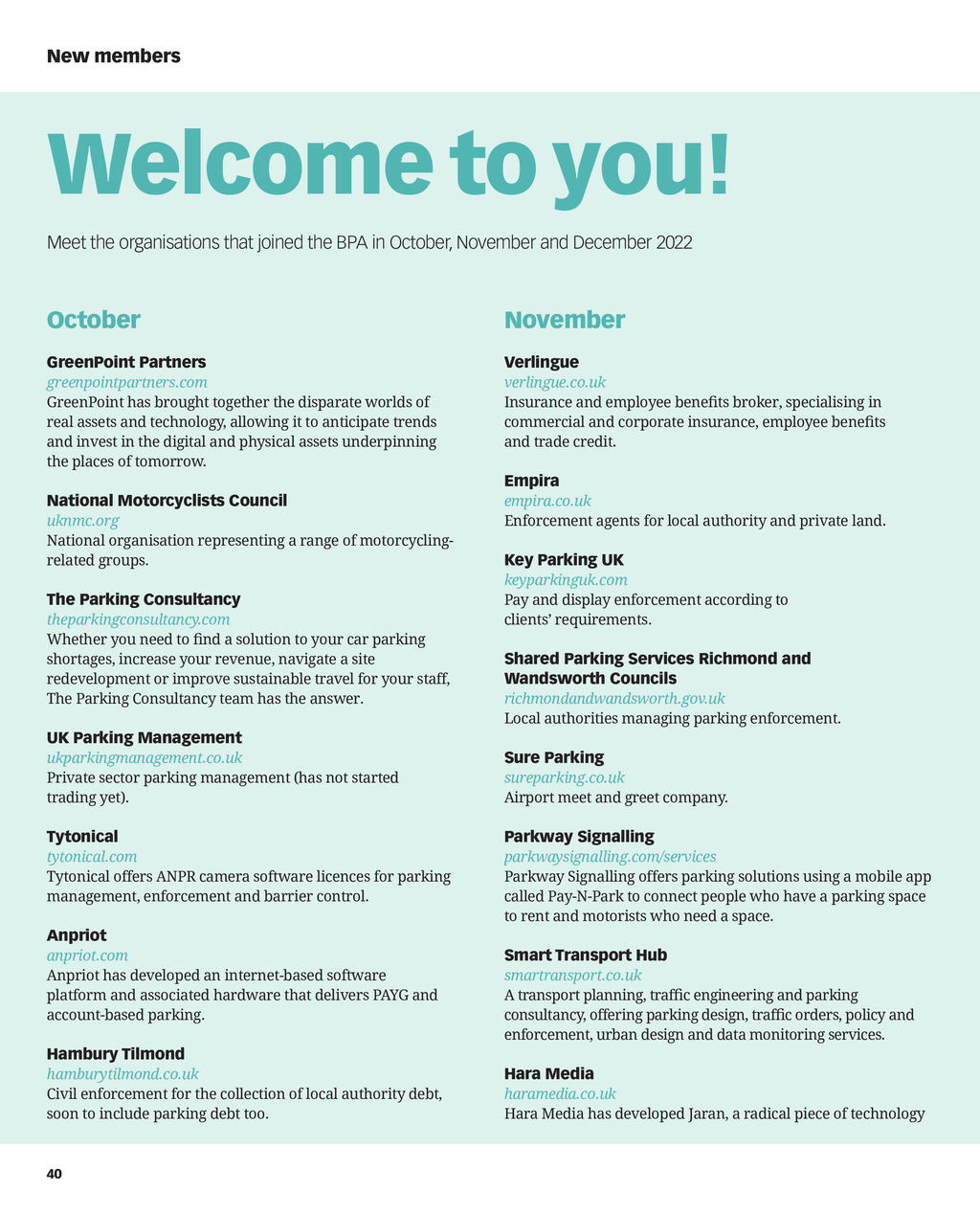 New members A warm to you! Welcome welcome Meet the organisations that joined the BPA in October, November and December 2022 Peter Guest, European editor for Parking Today October and former BPA President, reports on the recent GreenPoint Partners Parking Industry Exhibition, held in Reno, Nevada greenpointpartners.com GreenPoint has brought together the disparate worlds of real assets and technology, allowing it to anticipate trends and invest in the digital and physical assets underpinning the places of tomorrow. November Verlingue verlingue.co.uk Insurance and employee benefits broker, specialising in commercial and corporate insurance, employee benefits and trade credit. Empira National Motorcyclists Council uknmc.org National organisation representing a range of motorcyclingrelated groups. The Parking Consultancy theparkingconsultancy.com Whether you need to find a solution to your car parking shortages, increase your revenue, navigate a site redevelopment or improve sustainable travel for your staff, The Parking Consultancy team has the answer. empira.co.uk Enforcement agents for local authority and private land. Key Parking UK keyparkinguk.com Pay and display enforcement according to clients requirements. Shared Parking Services Richmond and Wandsworth Councils richmondandwandsworth.gov.uk Local authorities managing parking enforcement. UK Parking Management ukparkingmanagement.co.uk Private sector parking management (has not started trading yet). Sure Parking Tytonical Parkway Signalling tytonical.com Tytonical offers ANPR camera software licences for parking management, enforcement and barrier control. parkwaysignalling.com/services Parkway Signalling offers parking solutions using a mobile app called Pay-N-Park to connect people who have a parking space to rent and motorists who need a space. sureparking.co.uk Airport meet and greet company. Anpriot anpriot.com Anpriot has developed an internet-based software platform and associated hardware that delivers PAYG and account-based parking. Smart Transport Hub smartransport.co.uk A transport planning, traffic engineering and parking consultancy, offering parking design, traffic orders, policy and enforcement, urban design and data monitoring services. Hambury Tilmond hamburytilmond.co.uk Civil enforcement for the collection of local authority debt, soon to include parking debt too. 40 Hara Media haramedia.co.uk Hara Media has developed Jaran, a radical piece of technology