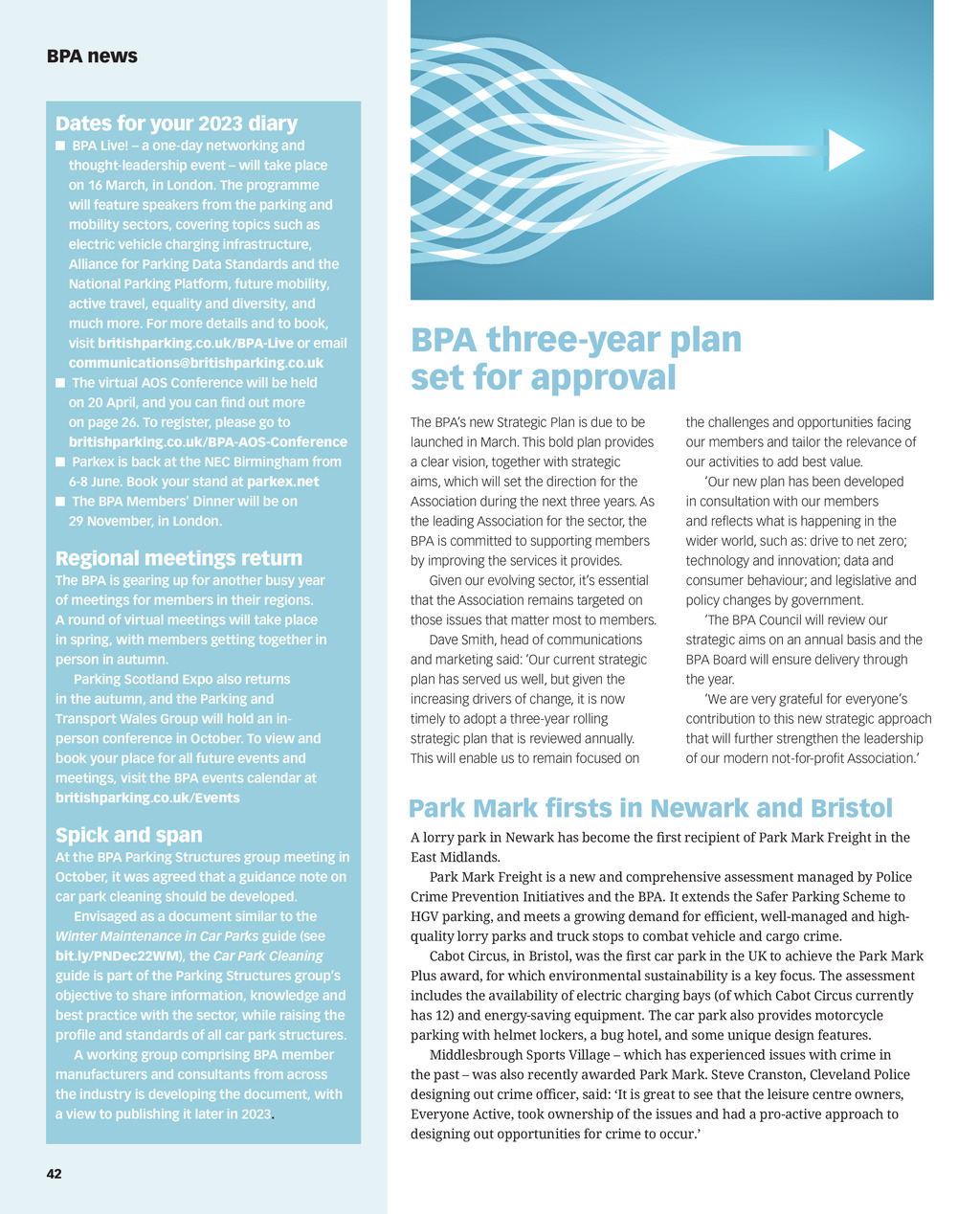 BPA news Dates for your 2023 diary BPA Live! a one-day networking and thought-leadership event will take place on 16 March, in London. The programme will feature speakers from the parking and mobility sectors, covering topics such as electric vehicle charging infrastructure, Alliance for Parking Data Standards and the National Parking Platform, future mobility, active travel, equality and diversity, and much more. For more details and to book, visit britishparking.co.uk/BPA-Live or email communications@britishparking.co.uk The virtual AOS Conference will be held on 20 April, and you can find out more on page 26. To register, please go to britishparking.co.uk/BPA-AOS-Conference Parkex is back at the NEC Birmingham from 6-8 June. Book your stand at parkex.net The BPA Members Dinner will be on 29 November, in London. Regional meetings return The BPA is gearing up for another busy year of meetings for members in their regions. A round of virtual meetings will take place in spring, with members getting together in person in autumn. Parking Scotland Expo also returns in the autumn, and the Parking and Transport Wales Group will hold an inperson conference in October. To view and book your place for all future events and meetings, visit the BPA events calendar at britishparking.co.uk/Events Spick and span At the BPA Parking Structures group meeting in October, it was agreed that a guidance note on car park cleaning should be developed. Envisaged as a document similar to the Winter Maintenance in Car Parks guide (see bit.ly/PNDec22WM), the Car Park Cleaning guide is part of the Parking Structures groups objective to share information, knowledge and best practice with the sector, while raising the profile and standards of all car park structures. A working group comprising BPA member manufacturers and consultants from across the industry is developing the document, with a view to publishing it later in 2023. 42 BPA three-year plan set for approval The BPAs new Strategic Plan is due to be launched in March. This bold plan provides a clear vision, together with strategic aims, which will set the direction for the Association during the next three years. As the leading Association for the sector, the BPA is committed to supporting members by improving the services it provides. Given our evolving sector, its essential that the Association remains targeted on those issues that matter most to members. Dave Smith, head of communications and marketing said: Our current strategic plan has served us well, but given the increasing drivers of change, it is now timely to adopt a three-year rolling strategic plan that is reviewed annually. This will enable us to remain focused on the challenges and opportunities facing our members and tailor the relevance of our activities to add best value. Our new plan has been developed in consultation with our members and reflects what is happening in the wider world, such as: drive to net zero; technology and innovation; data and consumer behaviour; and legislative and policy changes by government. The BPA Council will review our strategic aims on an annual basis and the BPA Board will ensure delivery through the year. We are very grateful for everyones contribution to this new strategic approach that will further strengthen the leadership of our modern not-for-profit Association. Park Mark firsts in Newark and Bristol A lorry park in Newark has become the first recipient of Park Mark Freight in the East Midlands. Park Mark Freight is a new and comprehensive assessment managed by Police Crime Prevention Initiatives and the BPA. It extends the Safer Parking Scheme to HGV parking, and meets a growing demand for efficient, well-managed and highquality lorry parks and truck stops to combat vehicle and cargo crime. Cabot Circus, in Bristol, was the first car park in the UK to achieve the Park Mark Plus award, for which environmental sustainability is a key focus. The assessment includes the availability of electric charging bays (of which Cabot Circus currently has 12) and energy-saving equipment. The car park also provides motorcycle parking with helmet lockers, a bug hotel, and some unique design features. Middlesbrough Sports Village which has experienced issues with crime in the past was also recently awarded Park Mark. Steve Cranston, Cleveland Police designing out crime officer, said: It is great to see that the leisure centre owners, Everyone Active, took ownership of the issues and had a pro-active approach to designing out opportunities for crime to occur.