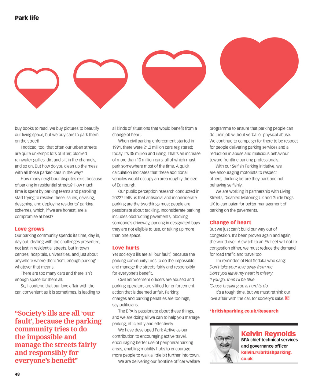 Park life buy books to read, we buy pictures to beautify our living space, but we buy cars to park them on the street! I noticed, too, that often our urban streets are quite unkempt: lots of litter; blocked rainwater gullies; dirt and silt in the channels, and so on. But how do you clean up the mess with all those parked cars in the way? How many neighbour disputes exist because of parking in residential streets? How much time is spent by parking teams and patrolling staff trying to resolve these issues, devising, designing, and deploying residents parking schemes, which, if we are honest, are a compromise at best? Love grows Our parking community spends its time, day in, day out, dealing with the challenges presented, not just in residential streets, but in town centres, hospitals, universities, and just about anywhere where there isnt enough parking whatever that means. There are too many cars and there isnt enough space for them all. So, I contend that our love affair with the car, convenient as it is sometimes, is leading to Societys ills are all our fault, because the parking community tries to do the impossible and manage the streets fairly and responsibly for everyones benefit 48 all kinds of situations that would benefit from a change of heart. When civil parking enforcement started in 1994, there were 21.2 million cars registered; today its 35 million and rising. Thats an increase of more than 10 million cars, all of which must park somewhere most of the time. A quick calculation indicates that these additional vehicles would occupy an area roughly the size of Edinburgh. Our public perception research conducted in 2022* tells us that antisocial and inconsiderate parking are the two things most people are passionate about tackling. Inconsiderate parking includes obstructing pavements, blocking someones driveway, parking in designated bays they are not eligible to use, or taking up more than one space. Love hurts Yet societys ills are all our fault, because the parking community tries to do the impossible and manage the streets fairly and responsibly for everyones benefit. Civil enforcement officers are abused and parking operators are vilified for enforcement action that is deemed unfair. Parking charges and parking penalties are too high, say politicians. The BPA is passionate about these things, and we are doing all we can to help you manage parking, efficiently and effectively. We have developed Park Active as our contribution to encouraging active travel, encouraging better use of peripheral parking areas, enabling mobility hubs to encourage more people to walk a little bit further into town. We are delivering our frontline officer welfare programme to ensure that parking people can do their job without verbal or physical abuse. We continue to campaign for there to be respect for people delivering parking services and a reduction in abuse and malicious behaviour toward frontline parking professionals. With our Selfish Parking initiative, we are encouraging motorists to respect others, thinking before they park and not behaving selfishly. We are working in partnership with Living Streets, Disabled Motoring UK and Guide Dogs UK to campaign for better management of parking on the pavements. Change of heart But we just cant build our way out of congestion. Its been proven again and again, the world over. A switch to an EV fleet will not fix congestion either, we must reduce the demand for road traffic and travel too. Im reminded of Neil Sedaka who sang: Dont take your love away from me Dont you leave my heart in misery If you go, then Ill be blue Cause breaking up is hard to do. Its a tough time, but we must rethink our love affair with the car, for societys sake. *britishparking.co.uk/Research Kelvin Reynolds BPA chief technical services and governance officer kelvin.r@britishparking. co.uk