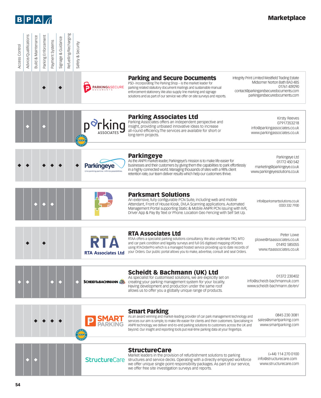 Safety & Security Refuelling/Recharging Signage & Guidance Payment Systems Parking Enforcement Build & Maintenance Advice/Qualifications Access Control Marketplace Parking and Secure Documents u PSD- incorporating The Parking Shop is the market leader for parking related statutory document mailings and sustainable manual enforcement stationery. We also supply line marking and signage solutions and as part of our service we offer on site surveys and reports. u Integrity Print Limited Westfield Trading Estate Midsomer Norton Bath BA3 4BS 01761 409290 contact@parkingandsecuredocuments.com parkingandsecuredocuments.com Parking Associates Ltd u Kirsty Reeves 07917353218 info@parkingassociates.co.uk www.parkingassociates.co.uk Parking Associates offers an independent perspective and insight, providing unbiased innovative ideas to increase all-round efficiency.The services are available for short or long-term projects. u Parkingeye u u u u u u Parkingeye Ltd 01772 450 542 marketing@parkingeye.co.uk www.parkingeyesolutions.co.uk As the ANPR market-leader, Parkingeyes mission is to make life easier for businesses and their customers by giving them the capabilities to park effortlessly in a highly connected world. Managing thousands of sites with a 98% client retention rate, our team deliver results which help our customers thrive. Parksmart Solutions An extensive, fully configurable PCN Suite, including web and mobile Attendant, Front of House Kiosk, DVLA Scanning applications. Automated Management Portal supporting Static & Mobile ANPR PCN issuing with IVR, Driver App & Pay By Text or Phone. Location Geo Fencing with Self Set Up. u u u RTA Associates Ltd u RTAA offers a specialist parking solutions consultancy. We also undertake TRO, MTO and car park condition and legality surveys and full GIS digitised mapping ofOrders using RTAOrderPro which is a managed hosted service providing up to date records of your Orders. Our public portal allows you to make, advertise, consult and seal Orders. u Scheidt & Bachmann (UK) Ltd u u u u u As specialist for customised solutions, we are explicitly set on creating your parking management system for your locality. Having development and production under the same roof allows us to offer you a globally unique range of products. As an award winning and market-leading provider of car park management technology and services our aim is simple, to make life easier for clients and their customers. Specialising in ANPR technology, we deliver end-to-end parking solutions to customers across the UK and beyond. Our insight and reporting tools put real-time parking data at your fingertips. StructureCare u u 54 Peter Lowe plowe@rtaassociates.co.uk 01492 585055 www.rtaassociates.co.uk 01372 230402 info@scheidt-bachmannuk.com www.scheidt-bachmann.de/en/ Smart Parking u u u u info@parksmartsolutions.co.uk 0333 332 7930 Market leaders in the provision of refurbishment solutions to parking structures and service decks. Operating with a directly employed workforce we offer unique single point responsibility packages. As part of our service, we offer free site investigation surveys and reports. 0845 230 3081 sales@smartparking.com www.smartparking.com (+44) 114 270 0100 info@structurecare.com www.structurecare.com