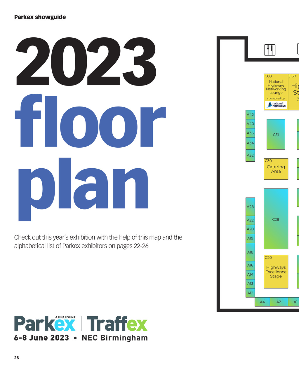 Parkex showguide 2023 floor plan C60 D60 National Highways Networking Lounge sponsored by Highw Strate Stag A42 A40 D56 A36 C51 D50 A34 A32 C30 D42 Catering Area D40 D30 A28 C28 A22 D A20 Check out this years exhibition with the help of this map and the alphabetical list of Parkex exhibitors on pages 22-26 A19 D A18 C20 A16 D10 Highways Excellence Stage A14 D A13 A12 A4 A2 A1 28 PN June 2023 pp18-33 Parkex Showguide.indd 28 23/05/2023 16:24