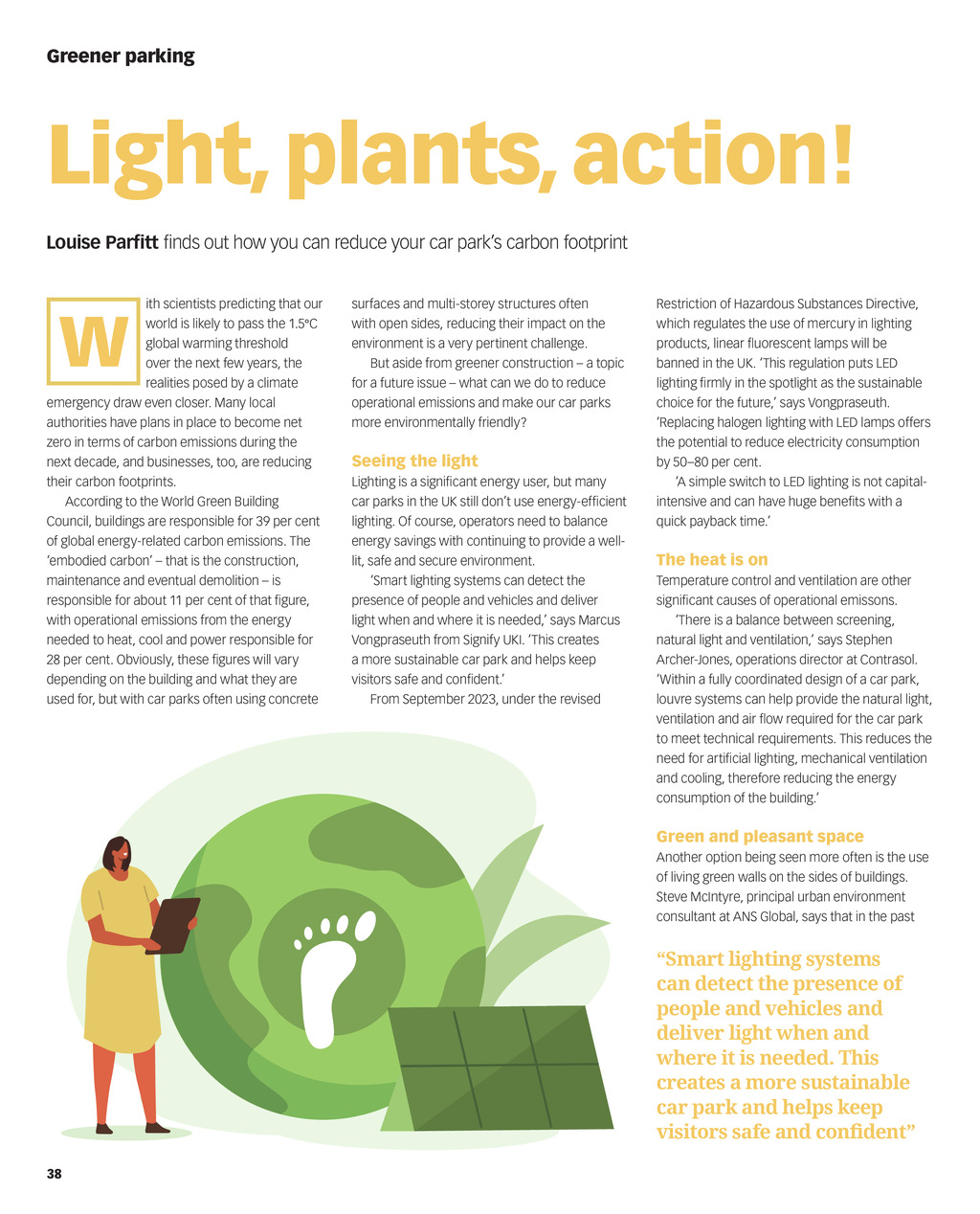 Greener parking Light, plants, action! Louise Parfitt finds out how you can reduce your car parks carbon footprint ith scientists predicting that our world is likely to pass the 1.5C global warming threshold over the next few years, the realities posed by a climate emergency draw even closer. Many local authorities have plans in place to become net zero in terms of carbon emissions during the next decade, and businesses, too, are reducing their carbon footprints. According to the World Green Building Council, buildings are responsible for 39 per cent of global energy-related carbon emissions. The embodied carbon that is the construction, maintenance and eventual demolition is responsible for about 11 per cent of that figure, with operational emissions from the energy needed to heat, cool and power responsible for 28 per cent. Obviously, these figures will vary depending on the building and what they are used for, but with car parks often using concrete W surfaces and multi-storey structures often with open sides, reducing their impact on the environment is a very pertinent challenge. But aside from greener construction a topic for a future issue what can we do to reduce operational emissions and make our car parks more environmentally friendly? Seeing the light Lighting is a significant energy user, but many car parks in the UK still dont use energy-efficient lighting. Of course, operators need to balance energy savings with continuing to provide a welllit, safe and secure environment. Smart lighting systems can detect the presence of people and vehicles and deliver light when and where it is needed, says Marcus Vongpraseuth from Signify UKI. This creates a more sustainable car park and helps keep visitors safe and confident. From September 2023, under the revised Restriction of Hazardous Substances Directive, which regulates the use of mercury in lighting products, linear fluorescent lamps will be banned in the UK. This regulation puts LED lighting firmly in the spotlight as the sustainable choice for the future, says Vongpraseuth. Replacing halogen lighting with LED lamps offers the potential to reduce electricity consumption by 5080 per cent. A simple switch to LED lighting is not capitalintensive and can have huge benefits with a quick payback time. The heat is on Temperature control and ventilation are other significant causes of operational emissons. There is a balance between screening, natural light and ventilation, says Stephen Archer-Jones, operations director at Contrasol. Within a fully coordinated design of a car park, louvre systems can help provide the natural light, ventilation and air flow required for the car park to meet technical requirements. This reduces the need for artificial lighting, mechanical ventilation and cooling, therefore reducing the energy consumption of the building. Green and pleasant space Another option being seen more often is the use of living green walls on the sides of buildings. Steve McIntyre, principal urban environment consultant at ANS Global, says that in the past Smart lighting systems can detect the presence of people and vehicles and deliver light when and where it is needed. This creates a more sustainable car park and helps keep visitors safe and confident 38 PN June 2023 pp38-39 Carbon Neutral.indd 30 23/05/2023 11:59