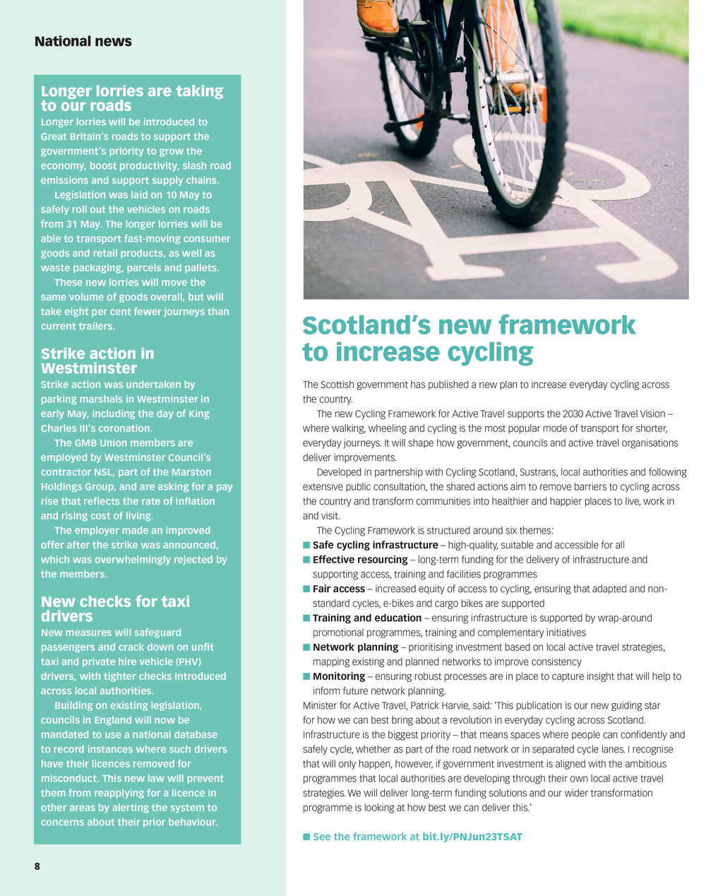 National news Longer lorries are taking to our roads Longer lorries will be introduced to Great Britains roads to support the governments priority to grow the economy, boost productivity, slash road emissions and support supply chains. Legislation was laid on 10 May to safely roll out the vehicles on roads from 31 May. The longer lorries will be able to transport fast-moving consumer goods and retail products, as well as waste packaging, parcels and pallets. These new lorries will move the same volume of goods overall, but will take eight per cent fewer journeys than current trailers. Strike action in Westminster Strike action was undertaken by parking marshals in Westminster in early May, including the day of King Charles IIIs coronation. The GMB Union members are employed by Westminster Councils contractor NSL, part of the Marston Holdings Group, and are asking for a pay rise that reflects the rate of inflation and rising cost of living. The employer made an improved offer after the strike was announced, which was overwhelmingly rejected by the members. New checks for taxi drivers New measures will safeguard passengers and crack down on unfit taxi and private hire vehicle (PHV) drivers, with tighter checks introduced across local authorities. Building on existing legislation, councils in England will now be mandated to use a national database to record instances where such drivers have their licences removed for misconduct. This new law will prevent them from reapplying for a licence in other areas by alerting the system to concerns about their prior behaviour. Scotlands new framework to increase cycling The Scottish government has published a new plan to increase everyday cycling across the country. The new Cycling Framework for Active Travel supports the 2030 Active Travel Vision where walking, wheeling and cycling is the most popular mode of transport for shorter, everyday journeys. It will shape how government, councils and active travel organisations deliver improvements. Developed in partnership with Cycling Scotland, Sustrans, local authorities and following extensive public consultation, the shared actions aim to remove barriers to cycling across the country and transform communities into healthier and happier places to live, work in and visit. The Cycling Framework is structured around six themes: Safe cycling infrastructure high-quality, suitable and accessible for all Effective resourcing long-term funding for the delivery of infrastructure and supporting access, training and facilities programmes Fair access increased equity of access to cycling, ensuring that adapted and nonstandard cycles, e-bikes and cargo bikes are supported Training and education ensuring infrastructure is supported by wrap-around promotional programmes, training and complementary initiatives Network planning prioritising investment based on local active travel strategies, mapping existing and planned networks to improve consistency Monitoring ensuring robust processes are in place to capture insight that will help to inform future network planning. Minister for Active Travel, Patrick Harvie, said: This publication is our new guiding star for how we can best bring about a revolution in everyday cycling across Scotland. Infrastructure is the biggest priority that means spaces where people can confidently and safely cycle, whether as part of the road network or in separated cycle lanes. I recognise that will only happen, however, if government investment is aligned with the ambitious programmes that local authorities are developing through their own local active travel strategies. We will deliver long-term funding solutions and our wider transformation programme is looking at how best we can deliver this. See the framework at bit.ly/PNJun23TSAT 8 PN June 2023 pp08-09 National News.indd 8 23/05/2023 11:40