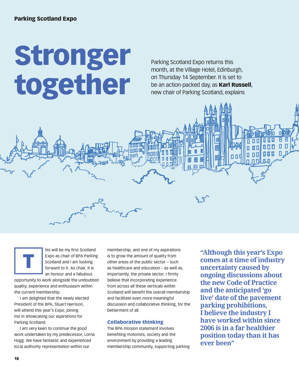 Parking Scotland Expo Stronger together his will be my first Scotland Expo as chair of BPA Parking Scotland and I am looking forward to it. As chair, it is an honour and a fabulous opportunity to work alongside the undoubted quality, experience and enthusiasm within the current membership. I am delighted that the newly elected President of the BPA, Stuart Harrison, will attend this years Expo, joining me in showcasing our aspirations for Parking Scotland. I am very keen to continue the good work undertaken by my predecessor, Lorna Hogg. We have fantastic and experienced local authority representation within our T Parking Scotland Expo returns this month, at the Village Hotel, Edinburgh, on Thursday 14 September. It is set to be an action-packed day, as Karl Russell, new chair of Parking Scotland, explains membership, and one of my aspirations is to grow the amount of quality from other areas of the public sector such as healthcare and education as well as, importantly, the private sector. I firmly believe that incorporating experience from across all these verticals within Scotland will benefit the overall membership and facilitate even more meaningful discussion and collaborative thinking, for the betterment of all. Collaborative thinking The BPA mission statement involves benefiting motorists, society and the environment by providing a leading membership community, supporting parking Although this years Expo comes at a time of industry uncertainty caused by ongoing discussions about the new Code of Practice and the anticipated go live date of the pavement parking prohibitions, I believe the industry I have worked within since 2006 is in a far healthier position today than it has ever been 18 PN Sept 2023 pp18-21 Scotland Expo.indd 18 24/08/2023 13:19