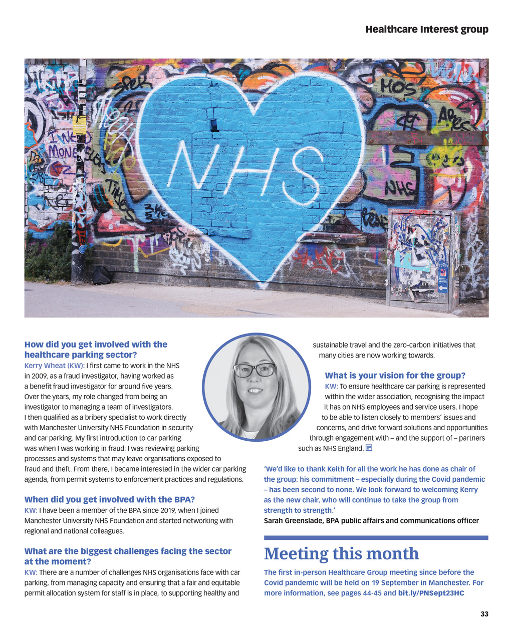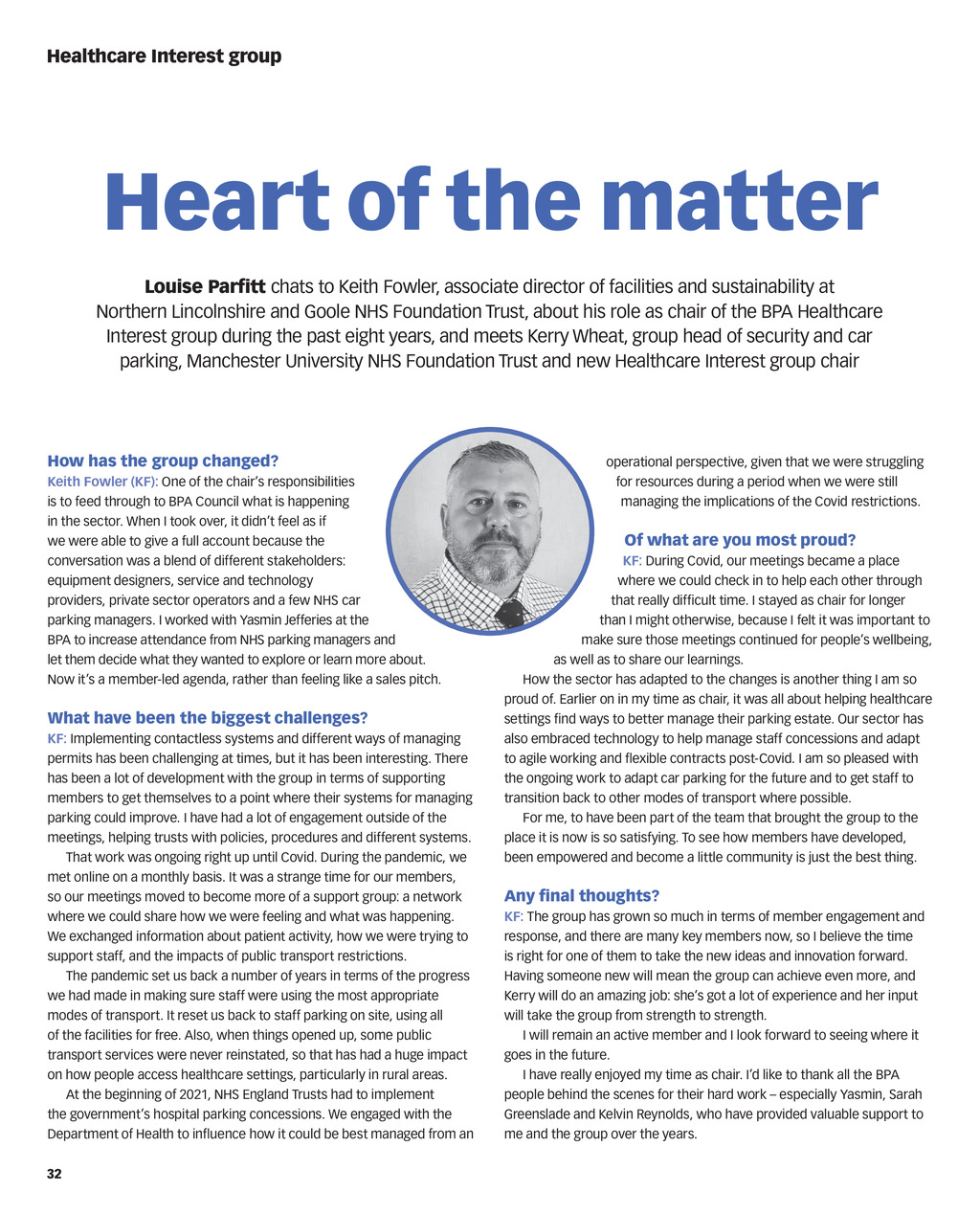 Healthcare Interest group Heart of the matter Louise Parfitt chats to Keith Fowler, associate director of facilities and sustainability at Northern Lincolnshire and Goole NHS Foundation Trust, about his role as chair of the BPA Healthcare Interest group during the past eight years, and meets Kerry Wheat, group head of security and car parking, Manchester University NHS Foundation Trust and new Healthcare Interest group chair How has the group changed? Keith Fowler (KF): One of the chairs responsibilities is to feed through to BPA Council what is happening in the sector. When I took over, it didnt feel as if we were able to give a full account because the conversation was a blend of different stakeholders: equipment designers, service and technology providers, private sector operators and a few NHS car parking managers. I worked with Yasmin Jefferies at the BPA to increase attendance from NHS parking managers and let them decide what they wanted to explore or learn more about. Now its a member-led agenda, rather than feeling like a sales pitch. What have been the biggest challenges? KF: Implementing contactless systems and different ways of managing permits has been challenging at times, but it has been interesting. There has been a lot of development with the group in terms of supporting members to get themselves to a point where their systems for managing parking could improve. I have had a lot of engagement outside of the meetings, helping trusts with policies, procedures and different systems. That work was ongoing right up until Covid. During the pandemic, we met online on a monthly basis. It was a strange time for our members, so our meetings moved to become more of a support group: a network where we could share how we were feeling and what was happening. We exchanged information about patient activity, how we were trying to support staff, and the impacts of public transport restrictions. The pandemic set us back a number of years in terms of the progress we had made in making sure staff were using the most appropriate modes of transport. It reset us back to staff parking on site, using all of the facilities for free. Also, when things opened up, some public transport services were never reinstated, so that has had a huge impact on how people access healthcare settings, particularly in rural areas. At the beginning of 2021, NHS England Trusts had to implement the governments hospital parking concessions. We engaged with the Department of Health to influence how it could be best managed from an operational perspective, given that we were struggling for resources during a period when we were still managing the implications of the Covid restrictions. Of what are you most proud? KF: During Covid, our meetings became a place where we could check in to help each other through that really difficult time. I stayed as chair for longer than I might otherwise, because I felt it was important to make sure those meetings continued for peoples wellbeing, as well as to share our learnings. How the sector has adapted to the changes is another thing I am so proud of. Earlier on in my time as chair, it was all about helping healthcare settings find ways to better manage their parking estate. Our sector has also embraced technology to help manage staff concessions and adapt to agile working and flexible contracts post-Covid. I am so pleased with the ongoing work to adapt car parking for the future and to get staff to transition back to other modes of transport where possible. For me, to have been part of the team that brought the group to the place it is now is so satisfying. To see how members have developed, been empowered and become a little community is just the best thing. Any final thoughts? KF: The group has grown so much in terms of member engagement and response, and there are many key members now, so I believe the time is right for one of them to take the new ideas and innovation forward. Having someone new will mean the group can achieve even more, and Kerry will do an amazing job: shes got a lot of experience and her input will take the group from strength to strength. I will remain an active member and I look forward to seeing where it goes in the future. I have really enjoyed my time as chair. Id like to thank all the BPA people behind the scenes for their hard work especially Yasmin, Sarah Greenslade and Kelvin Reynolds, who have provided valuable support to me and the group over the years. 32 PN Sept 2023 pp32-33 Healthcare.indd 32 24/08/2023 13:20