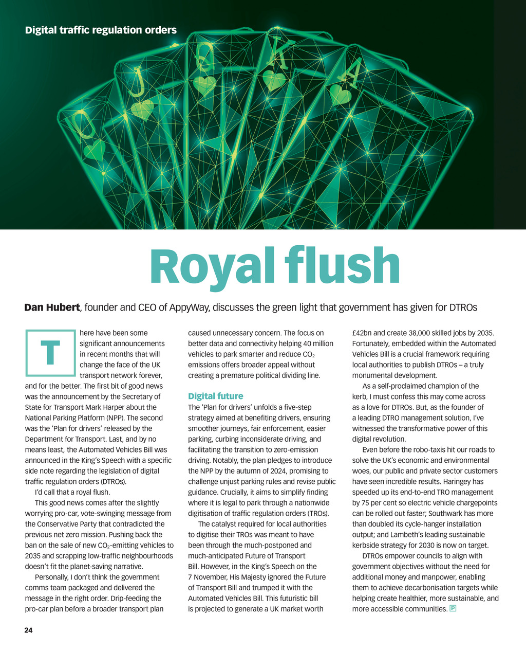 Digital traffic regulation orders Royal flush Dan Hubert, founder and CEO of AppyWay, discusses the green light that government has given for DTROs here have been some significant announcements in recent months that will change the face of the UK transport network forever, and for the better. The first bit of good news was the announcement by the Secretary of State for Transport Mark Harper about the National Parking Platform (NPP). The second was the Plan for drivers released by the Department for Transport. Last, and by no means least, the Automated Vehicles Bill was announced in the Kings Speech with a specific side note regarding the legislation of digital traffic regulation orders (DTROs). Id call that a royal flush. This good news comes after the slightly worrying pro-car, vote-swinging message from the Conservative Party that contradicted the previous net zero mission. Pushing back the ban on the sale of new CO2 -emitting vehicles to 2035 and scrapping low-traffic neighbourhoods doesnt fit the planet-saving narrative. Personally, I dont think the government comms team packaged and delivered the message in the right order. Drip-feeding the pro-car plan before a broader transport plan T caused unnecessary concern. The focus on better data and connectivity helping 40 million vehicles to park smarter and reduce CO2 emissions offers broader appeal without creating a premature political dividing line. Digital future The Plan for drivers unfolds a five-step strategy aimed at benefiting drivers, ensuring smoother journeys, fair enforcement, easier parking, curbing inconsiderate driving, and facilitating the transition to zero-emission driving. Notably, the plan pledges to introduce the NPP by the autumn of 2024, promising to challenge unjust parking rules and revise public guidance. Crucially, it aims to simplify finding where it is legal to park through a nationwide digitisation of traffic regulation orders (TROs). The catalyst required for local authorities to digitise their TROs was meant to have been through the much-postponed and much-anticipated Future of Transport Bill. However, in the Kings Speech on the 7 November, His Majesty ignored the Future of Transport Bill and trumped it with the Automated Vehicles Bill. This futuristic bill is projected to generate a UK market worth 42bn and create 38,000 skilled jobs by 2035. Fortunately, embedded within the Automated Vehicles Bill is a crucial framework requiring local authorities to publish DTROs a truly monumental development. As a self-proclaimed champion of the kerb, I must confess this may come across as a love for DTROs. But, as the founder of a leading DTRO management solution, Ive witnessed the transformative power of this digital revolution. Even before the robo-taxis hit our roads to solve the UKs economic and environmental woes, our public and private sector customers have seen incredible results. Haringey has speeded up its end-to-end TRO management by 75 per cent so electric vehicle chargepoints can be rolled out faster; Southwark has more than doubled its cycle-hanger installation output; and Lambeths leading sustainable kerbside strategy for 2030 is now on target. DTROs empower councils to align with government objectives without the need for additional money and manpower, enabling them to achieve decarbonisation targets while helping create healthier, more sustainable, and more accessible communities. 24 PN Dec 2023 pp24-25 Appyway.indd 24 30/11/2023 11:41