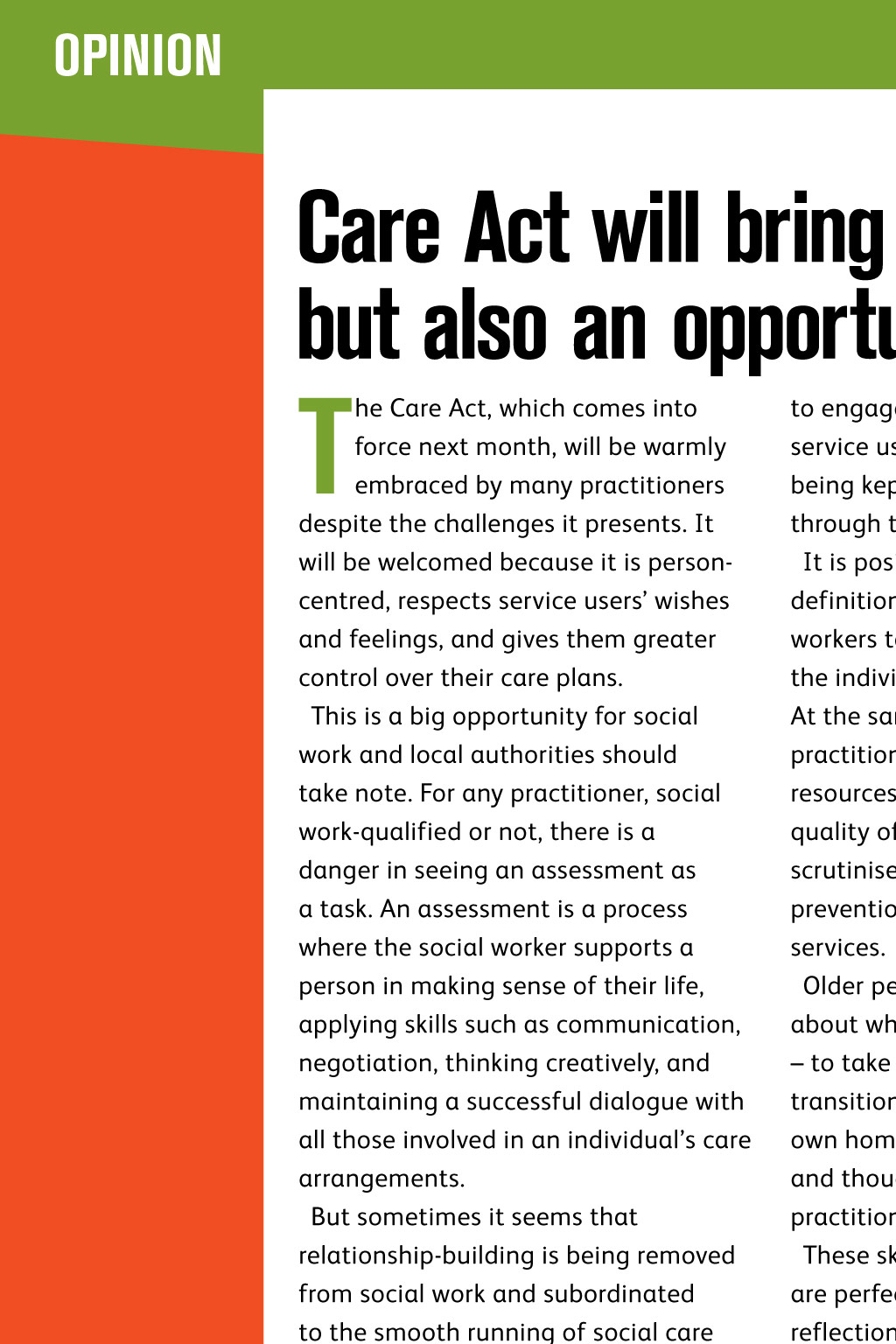 OPINION Care Act will bring pressure but also an opportunity T he Care Act, which comes into force next month, will be warmly embraced by many practitioners despite the challenges it presents. It will be welcomed because it is personcentred, respects service users wishes and feelings, and gives them greater control over their care plans. This is a big opportunity for social work and local authorities should take note. For any practitioner, social work-qualified or not, there is a danger in seeing an assessment as a task. An assessment is a process where the social worker supports a person in making sense of their life, applying skills such as communication, negotiation, thinking creatively, and maintaining a successful dialogue with all those involved in an individuals care arrangements. But sometimes it seems that relationship-building is being removed from social work and subordinated to the smooth running of social care departments. Many agencies are overlooking the necessity of harnessing the combined skills and resources of the social worker and the service user to engage in problem-solving. What service users and families value most is being kept informed as they navigate through the system. It is positive to see the Acts broad definition of wellbeing for it helps social workers to identify how best to support the individual in all aspects of their life. At the same time it will put pressure on practitioners to weigh up how scarce resources can best be used to promote quality of life. Resources will be tightly scrutinised with an emphasis on prevention and reduction in statutory services. Older people are often anxious about what will happen to them and to take a typical example the transition from hospital back into their own homes requires skill, patience and thoughtfulness on the part of practitioners. These skills take time to acquire and are perfected through experience and reflection on practice. Social workers are the right people for the job. Imran Mohammed is a social worker at Dudley council IMRAN MOHAMMED It is positive to see the Acts broad definition of wellbeing