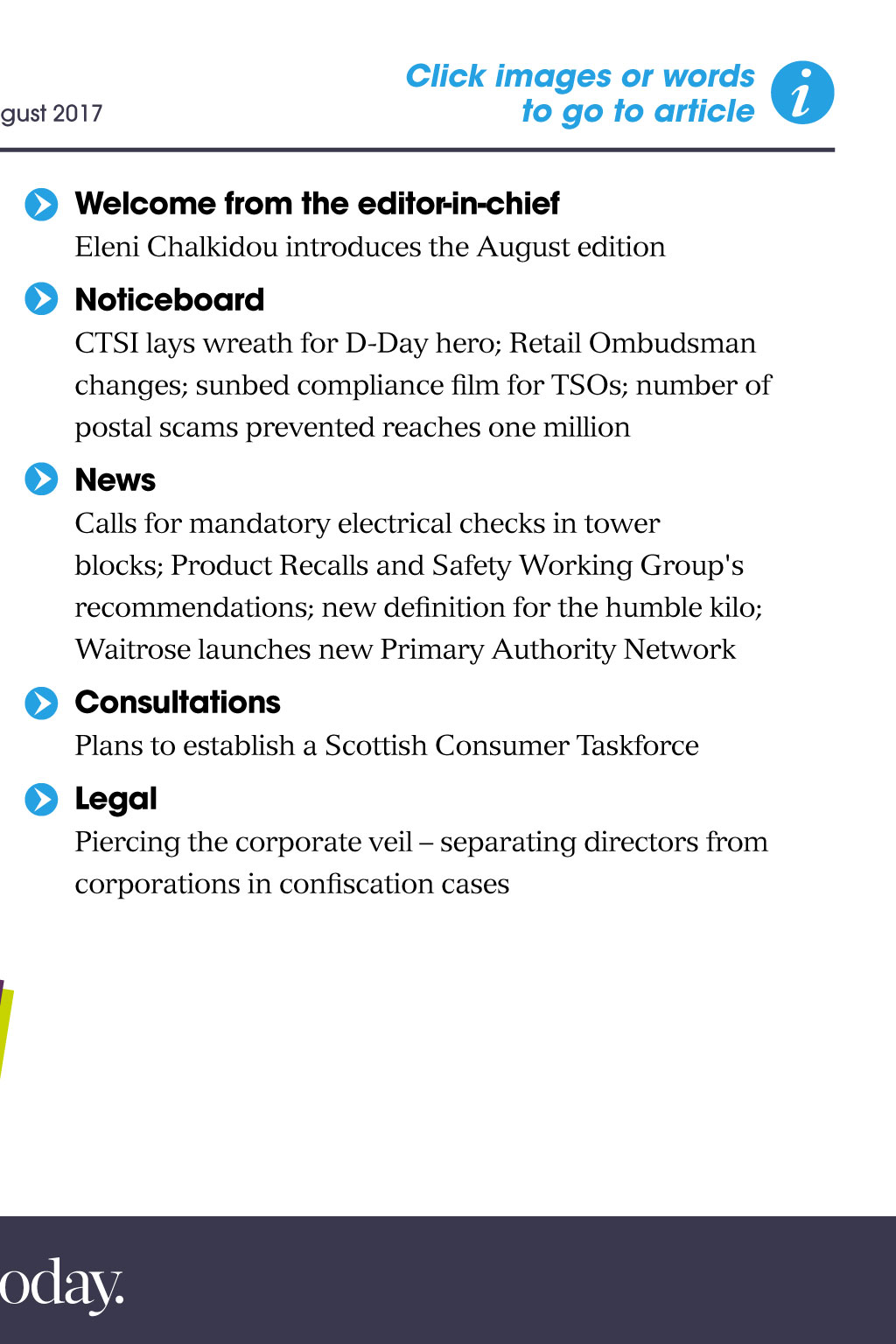 INSIDE Click images or words Volume 126 Issue 08, August 2017 to go to article Welcome from the editor-in-chief Eleni Chalkidou introduces the August edition Noticeboard CTSI lays wreath for D-Day hero; Retail Ombudsman changes; sunbed compliance lm for TSOs; number of postal scams prevented reaches one million News Calls for mandatory electrical checks in tower blocks; Product Recalls and Safety Working Group's recommendations; new de nition for the humble kilo; Waitrose launches new Primary Authority Network Consultations Plans to establish a Scottish Consumer Taskforce Legal Piercing the corporate veil – separating directors from corporations in con scation cases Special report CONFERENCE 2017 The hot topics, awards, presentations and celebrations – we bring you all the news from Harrogate