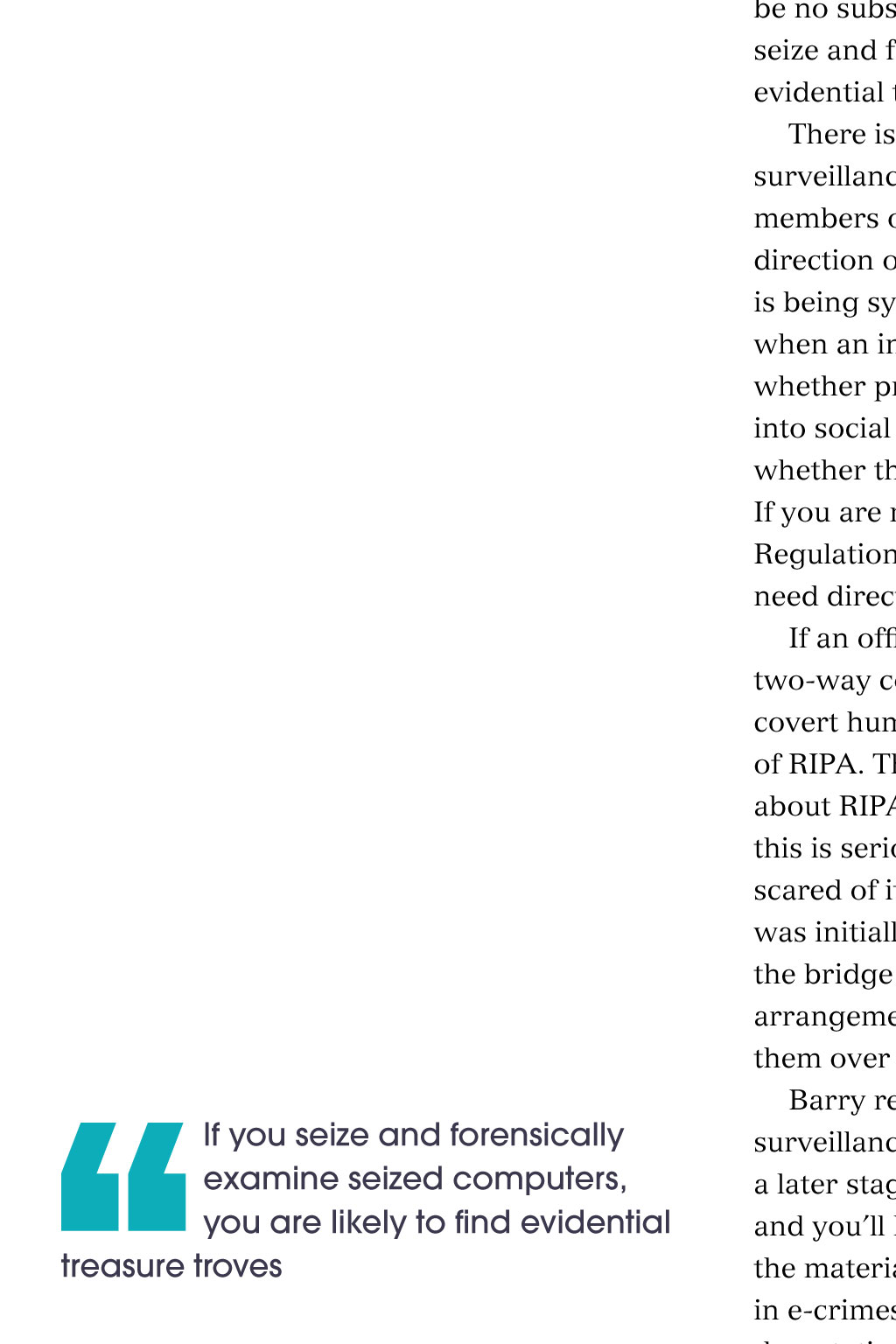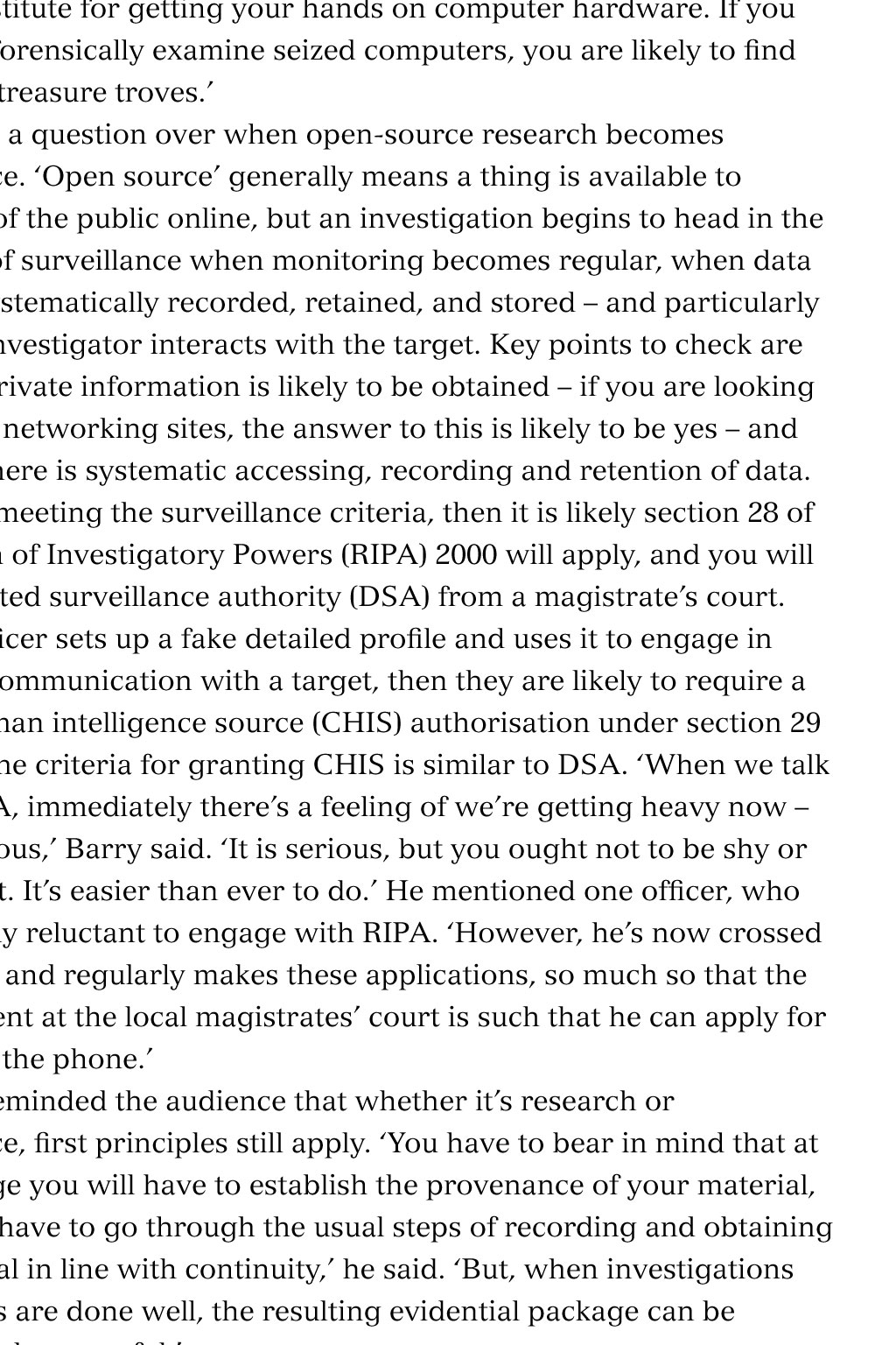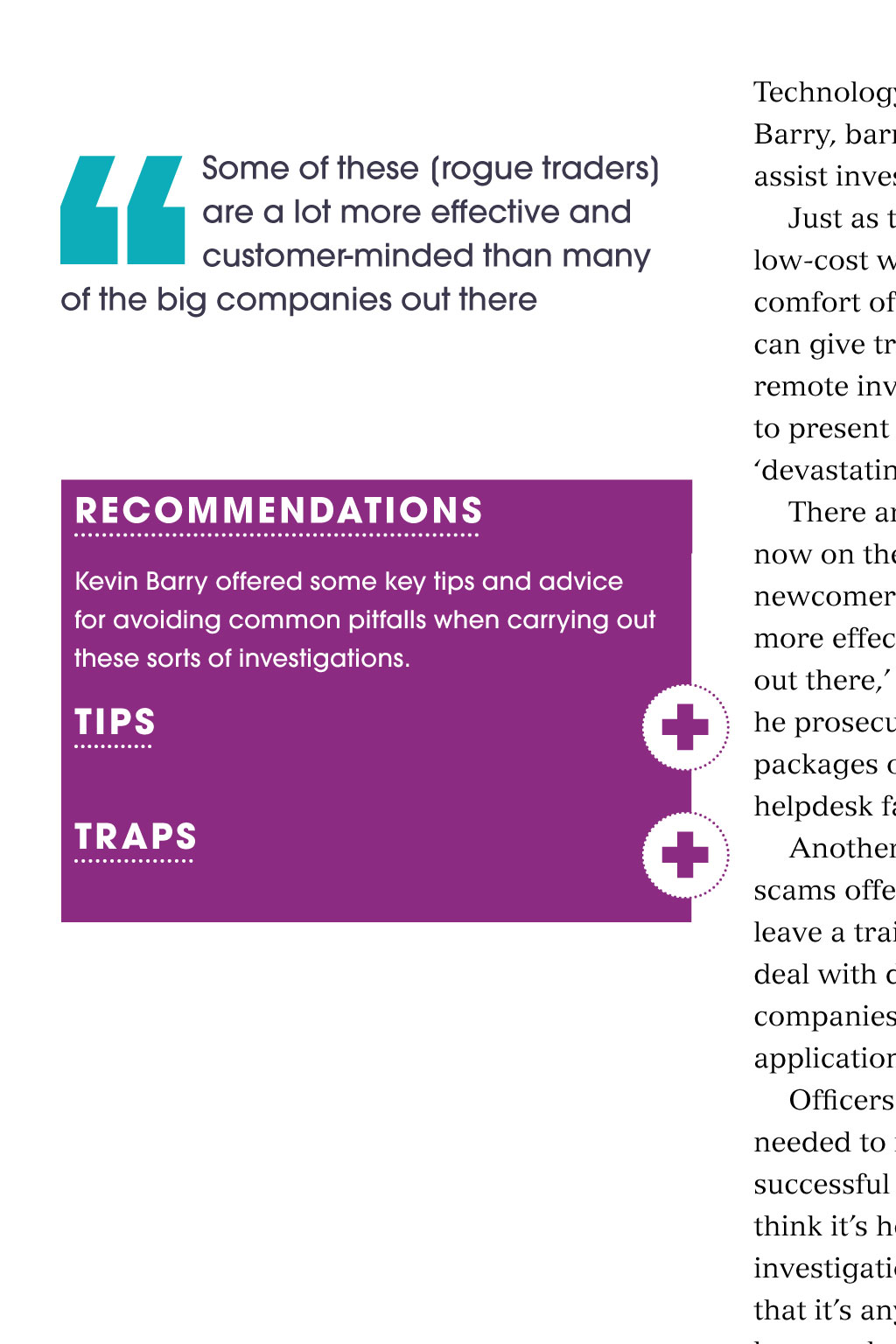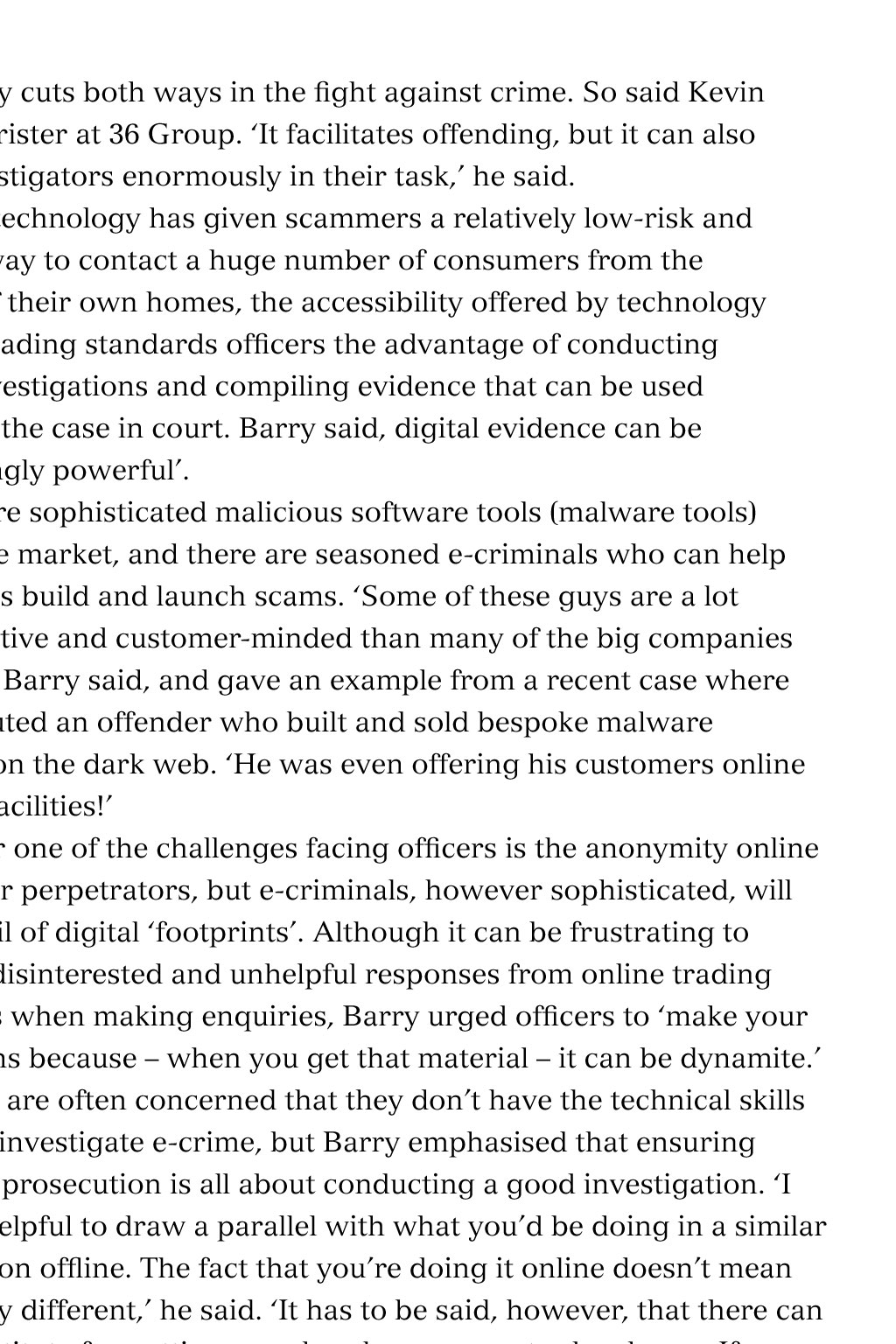 Mini theatre ecrime beating the cybercriminals at their own game In this feature l ecrime investigation l Regulation of Investigatory Powers l online scams CONFERENCE 2017 In all, more than 40 mini theatres were staged during the four-day event, attracting healthy audience numbers and inspiring debate Beating the cybercriminals From metrology to doorstep crime, there was a mini theatre for everyone at this years Conference. Here, louise Parfitt takes an in-depth look at investigating cybercriminals, presented by the 36 Group Some of these [rogue traders] are a lot more effective and customer-minded than many of the big companies out there RECoMMENDatIoNS Kevin Barry offered some key tips and advice for avoiding common pitfalls when carrying out these sorts of investigations. tIpS tR apS If you seize and forensically examine seized computers, you are likely to find evidential treasure troves Credits Louise Parfitt is a writer for TS Today. Technology cuts both ways in the fight against crime. So said Kevin Barry, barrister at 36 Group. It facilitates offending, but it can also assist investigators enormously in their task, he said. Just as technology has given scammers a relatively low-risk and low-cost way to contact a huge number of consumers from the comfortof their own homes, the accessibility offered by technology can give trading standards officers the advantage of conducting remoteinvestigations and compiling evidence that can be used to present the case in court. Barry said, digital evidence can be devastatingly powerful. There are sophisticated malicious software tools (malware tools) now on the market, and there are seasoned e-criminals who can help newcomers build and launch scams. Some of these guys are a lot moreeffective and customer-minded than many of the big companies out there, Barry said, and gave an example from a recent case where he prosecuted an offender who built and sold bespoke malware packages on the dark web. He was even offering his customers online helpdeskfacilities! Another one of the challenges facing officers is the anonymity online scams offer perpetrators, but e-criminals, however sophisticated, will leave a trail of digital footprints. Although it can be frustrating to deal with disinterested and unhelpful responses from online trading companies when making enquiries, Barry urged officers to make your applications because when you get that material it can be dynamite. Officers are often concerned that they dont have the technical skills needed to investigate e-crime, but Barry emphasised that ensuring successful prosecution is all about conducting a good investigation. I think its helpful to draw a parallel with what youd be doing in a similar investigation offline. The fact that youre doing it online doesnt mean that its any different, he said. It has to be said, however, that there can be no substitute for getting your hands on computer hardware. If you seize and forensically examine seized computers, you are likely to find evidential treasure troves. There is a question over when open-source research becomes surveillance. Open source generally means a thing is available to members of the public online, but an investigation begins to head in the direction of surveillance when monitoring becomes regular, when data is being systematically recorded, retained, and stored and particularly when an investigator interacts with the target. Key points to check are whether private information is likely to be obtained if you are looking into social networking sites, the answer to this is likely to be yes and whether there is systematic accessing, recording and retention of data. If you are meeting the surveillance criteria, then it is likely section 28 of Regulation of Investigatory Powers (RIPA) 2000 will apply, and you will need directed surveillance authority (DSA) from a magistrates court. If an officer sets up a fake detailed profile and uses it to engage in two-way communication with a target, then they are likely to require a covert human intelligence source (CHIS) authorisation under section 29 of RIPA. The criteria for granting CHIS is similar to DSA. When we talk about RIPA, immediately theres a feeling of were getting heavy now this is serious, Barry said. It is serious, but you ought not to be shy or scared of it. Its easier than ever to do. He mentioned one officer, who was initially reluctant to engage with RIPA. However, hes now crossed the bridge and regularly makes these applications, so much so that the arrangement at the local magistrates court is such that he can apply for them over the phone. Barry reminded the audience that whether its research or surveillance, first principles still apply. You have to bear in mind that at a later stage you will have to establish the provenance of your material, and youll have to go through the usual steps of recording and obtaining the material in line with continuity, he said. But, when investigations in e-crimes are done well, the resulting evidential package can be devastatingly powerful. To share this page, in the toolbar click on You might also like Playtime to property July 2016 Images: Sam Atkins RECoMMENDatIoNS Kevin Barry offered some key tips and advice for avoiding common pitfalls when carrying out these sorts of investigations. tIpS Draw up a clear digital investigation plan for monitoring your surveillance, and stick to it or adapt it. It need not be very complicated, but its invaluable for all sorts of reasons. Detail it R ECoMMENDatIoNS Kevin Barry offered some key tips and advice for avoiding common pitfalls when carrying out these sorts of investigations. tIpS to your boss, and they can make Regulation of investigatory Powers applications on that basis. At a later stage if theres a challenge to whether the actions were proportionate youve got a document outlining your framework and basis for the action you took Be conscious of your own digital footprints. More sophisticated online criminal