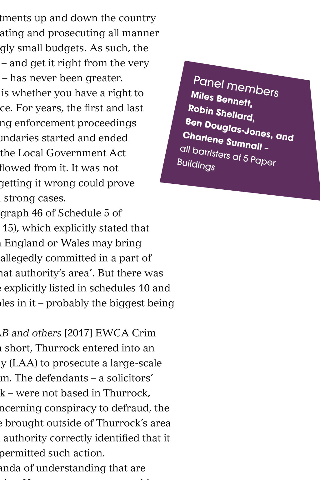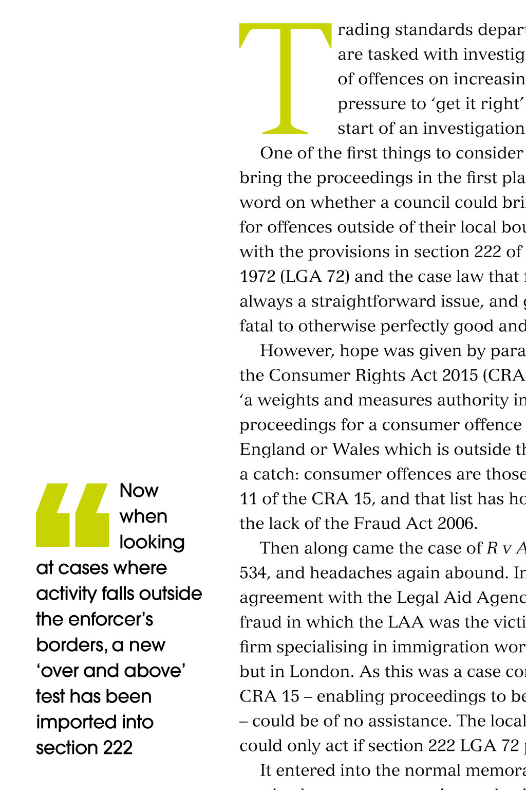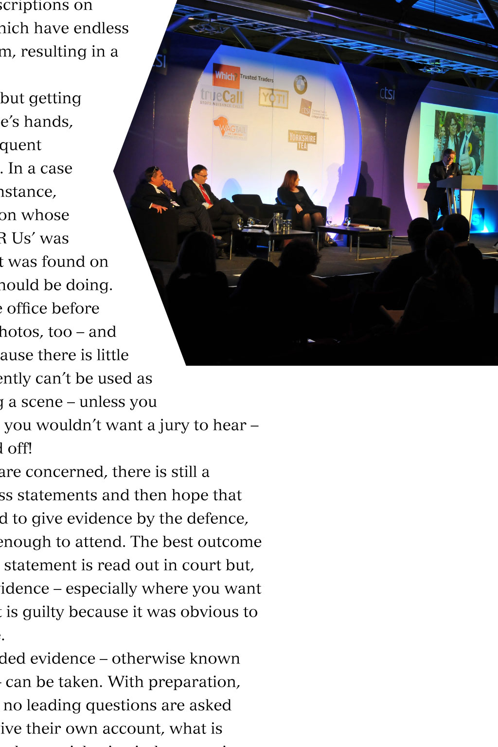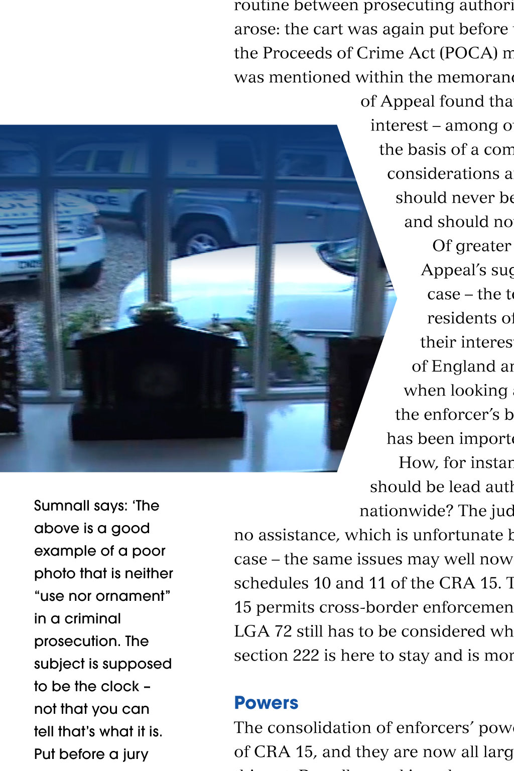 Plenary 3 Getting criminal investigations right in court first time In this feature l memoranda of understanding l cross-border cases CONFERENCE 2017 Start on the right track There are some common errors to avoid when bringing a case to court. Charlene Sumnall reports from the third plenary of Conference Now when looking at cases where activity falls outside the enforcer’s borders, a new ‘over and above’ test has been imported into section 222 Sumnall says: ‘The above is a good example of a poor photo that is neither “use nor ornament” in a criminal prosecution. The subject is supposed to be the clock – not that you can tell that’s what it is. Put before a jury or magistrate, it adds nothing to the prosecution’ Trading standards departments up and down the country are tasked with investigating and prosecuting all manner of offences on increasingly small budgets. As such, the pressure to ‘get it right’ – and get it right from the very start of an investigation – has never been greater. One of the rst things to consider is whether you have a right to bring the proceedings in the rst place. For years, the rst and last word on whether a council could bring enforcement proceedings for offences outside of their local boundaries started and ended with the provisions in section 222 of the Local Government Act 1972 (LGA 72) and the case law that owed from it. It was not always a straightforward issue, and getting it wrong could prove fatal to otherwise perfectly good and strong cases. However, hope was given by paragraph 46 of Schedule 5 of the Consumer Rights Act 2015 (CRA 15), which explicitly stated that ‘a weights and measures authority in England or Wales may bring proceedings for a consumer offence allegedly committed in a part of England or Wales which is outside that authority’s area’. But there was a catch: consumer offences are those explicitly listed in schedules 10 and 11 of the CRA 15, and that list has holes in it – probably the biggest being the lack of the Fraud Act 2006. Then along came the case of R v AB and others [2017] EWCA Crim 534, and headaches again abound. In short, Thurrock entered into an agreement with the Legal Aid Agency (LAA) to prosecute a large-scale fraud in which the LAA was the victim. The defendants – a solicitors’ rm specialising in immigration work – were not based in Thurrock, but in London. As this was a case concerning conspiracy to defraud, the CRA 15 – enabling proceedings to be brought outside of Thurrock’s area – could be of no assistance. The local authority correctly identi ed that it could only act if section 222 LGA 72 permitted such action. It entered into the normal memoranda of understanding that are routine between prosecuting authorities. However, a common problem arose: the cart was again put before the horse and the focus of ‘achieving the Proceeds of Crime Act (POCA) minimum criminal lifestyle criteria’ was mentioned within the memoranda of understanding. The Court of Appeal found that this may create a real con ict of interest – among other things – in prosecuting on the basis of a commercial interest. While POCA considerations are sensible, it is suggested that it should never be a reason for taking a prosecution, and should not be part of the section 222 test. Of greater concern, however, is the Court of Appeal’s suggestion that – for a cross-border case – the test to be established is not that the residents of Thurrock have an interest, but that their interest is greater than those of the citizens of England and Wales generally. As a result, when looking at cases where activity falls outside the enforcer’s borders, a new ‘over and above’ test has been imported into section 222. How, for instance, is it to be decided which council should be lead authority in a scam that is operating nationwide? The judgment of the court in AB provides no assistance, which is unfortunate because – even though this is a fraud case – the same issues may well now be live in those offences listed in schedules 10 and 11 of the CRA 15. The reason for this is that the CRA 15 permits cross-border enforcement, but offers no test, so section 222 LGA 72 still has to be considered when instituting proceedings. In short, section 222 is here to stay and is more complicated than ever. Powers The consolidation of enforcers’ powers came about with the start of CRA 15, and they are now all largely to be found in schedule 5 of this act. Broadly speaking, the powers are split into two distinct sets: those that require a warrant to enter premises and those that do not. In respect of those dependent on a warrant, enforcers should be in no doubt that the days of withholding information from those granting warrants are over. Where premises are used wholly or mainly as a dwelling, a warrant is required – even if that is the primary place from which a business is run. Where a warrant of entry into premises is not needed, the retention of the power to undertake test purchases is to be welcomed. Enforcers also have the power to request the provision of information, including the creation of some documentation. However, some caution should be exercised when using this power, as a person’s right not to incriminate themselves has been preserved and, as such, any information compelled in this fashion cannot be used as evidence. Once entry has been gained, items and documents can be seized as evidence. Enforcers can also break open containers – importantly, the de nition of a container includes electronic devices, so will cover USB and external hard drives. This should enable some form of preliminary check on the device itself, to see whether it needs seizing. No item can be seized and retained for longer than three months, unless there is reasonable justi cation for this. Enforcers should be mindful of this limit when progressing information, and should let those who are inspecting items know, too. It may re
